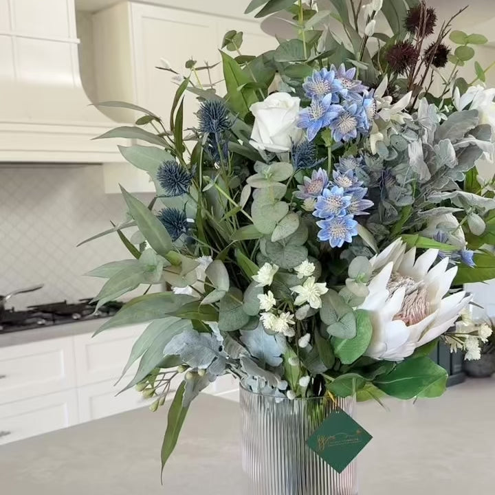 Real Touch Eucalyptus Dollar Leaf, King Protea, Eucalyptus Leaf and Seed Spray, Eucalyptus Long Leaf Spray, Flannel Flower, Blue Astrantia, White Roses, Pussy Willow and Chestnut Spray in a Ribbed Glass Vase with Artificial Water.