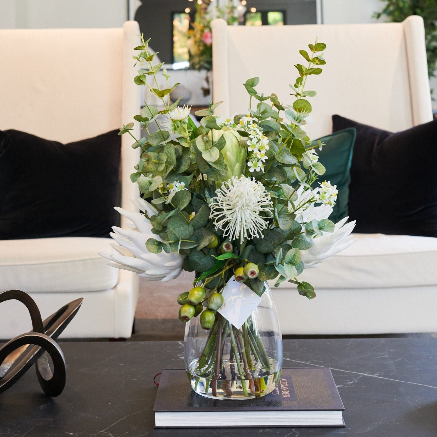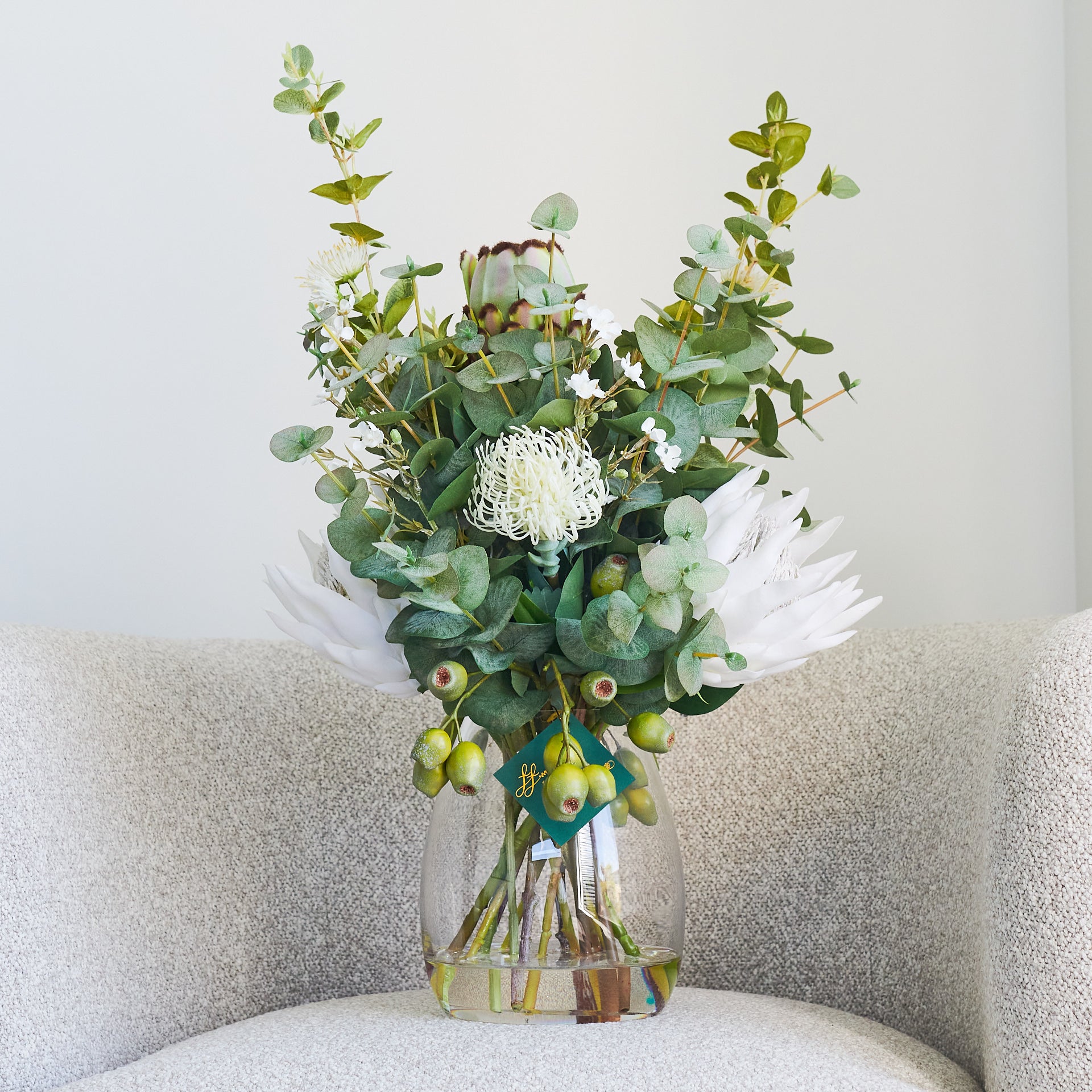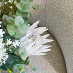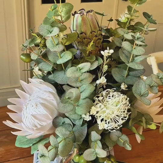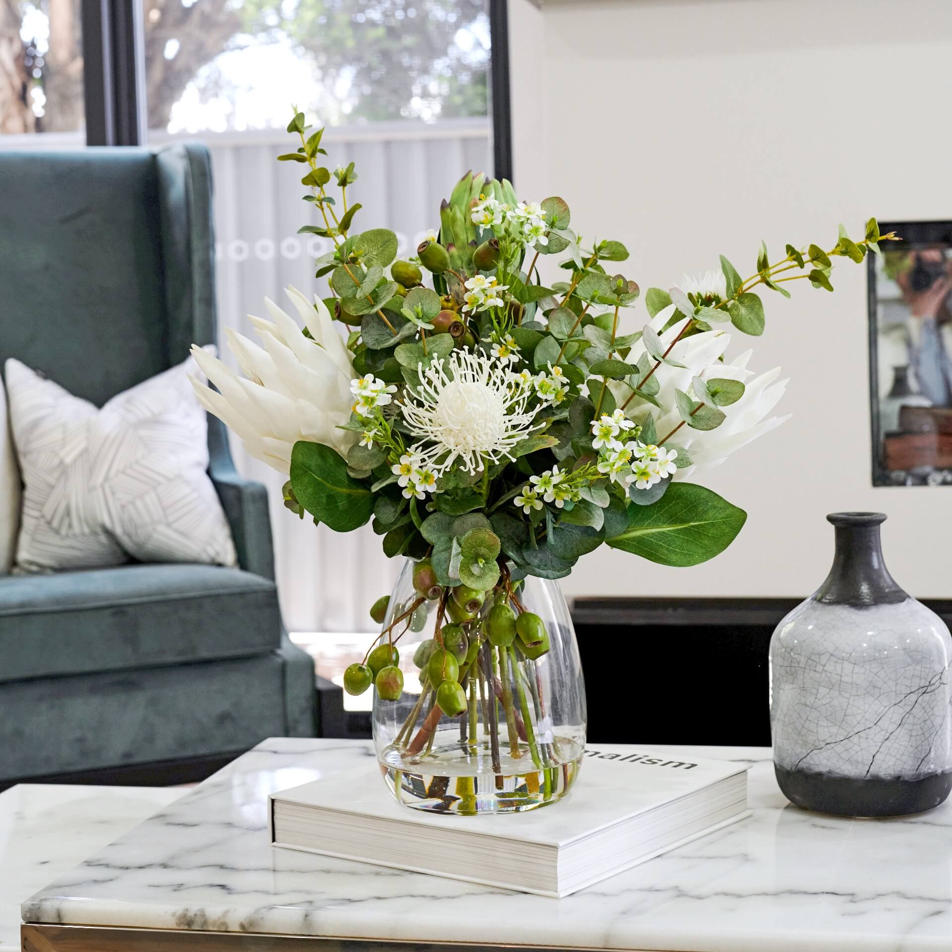 Real Touch Artificial Protea, Gum Nuts, Eucalyptus Leaves, Blossom Flower, Leucosperum Pin Cushion and Wax Flower spray in Belly Vase and Artificial Water. 360-degree flower arrangement.