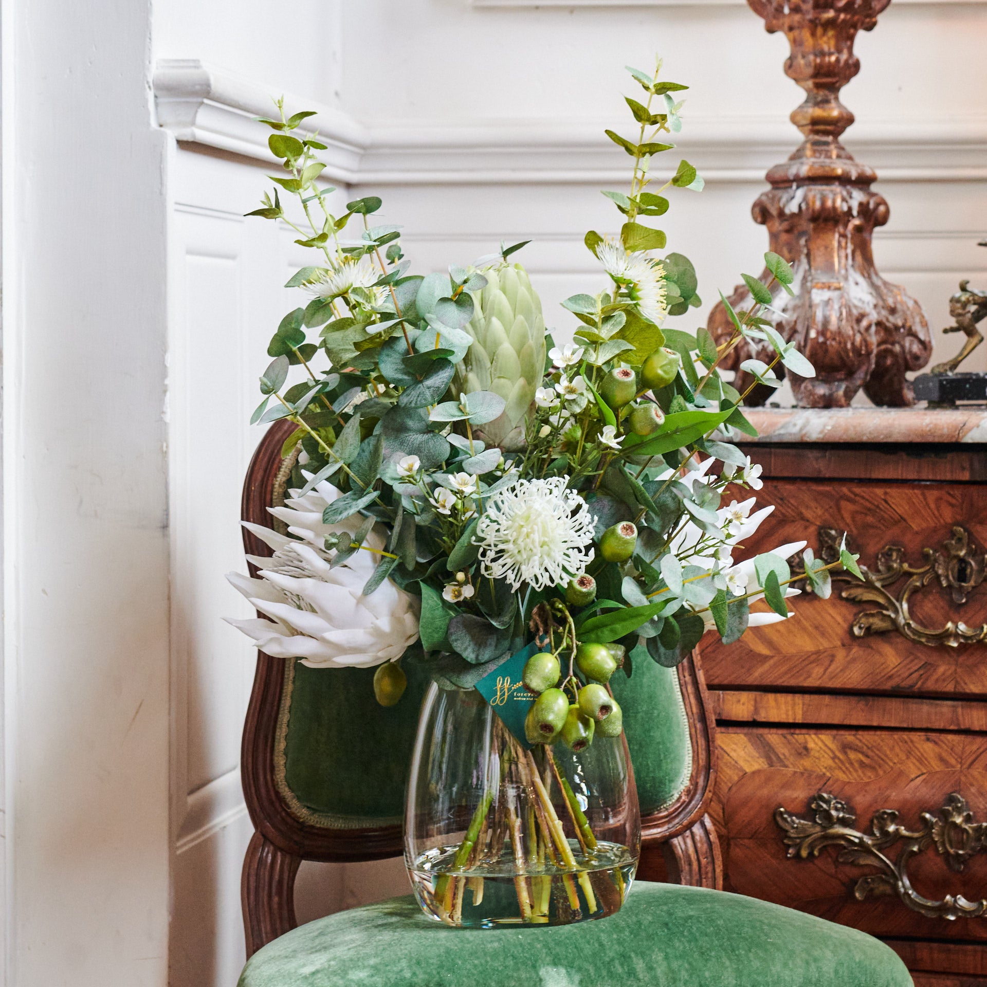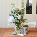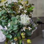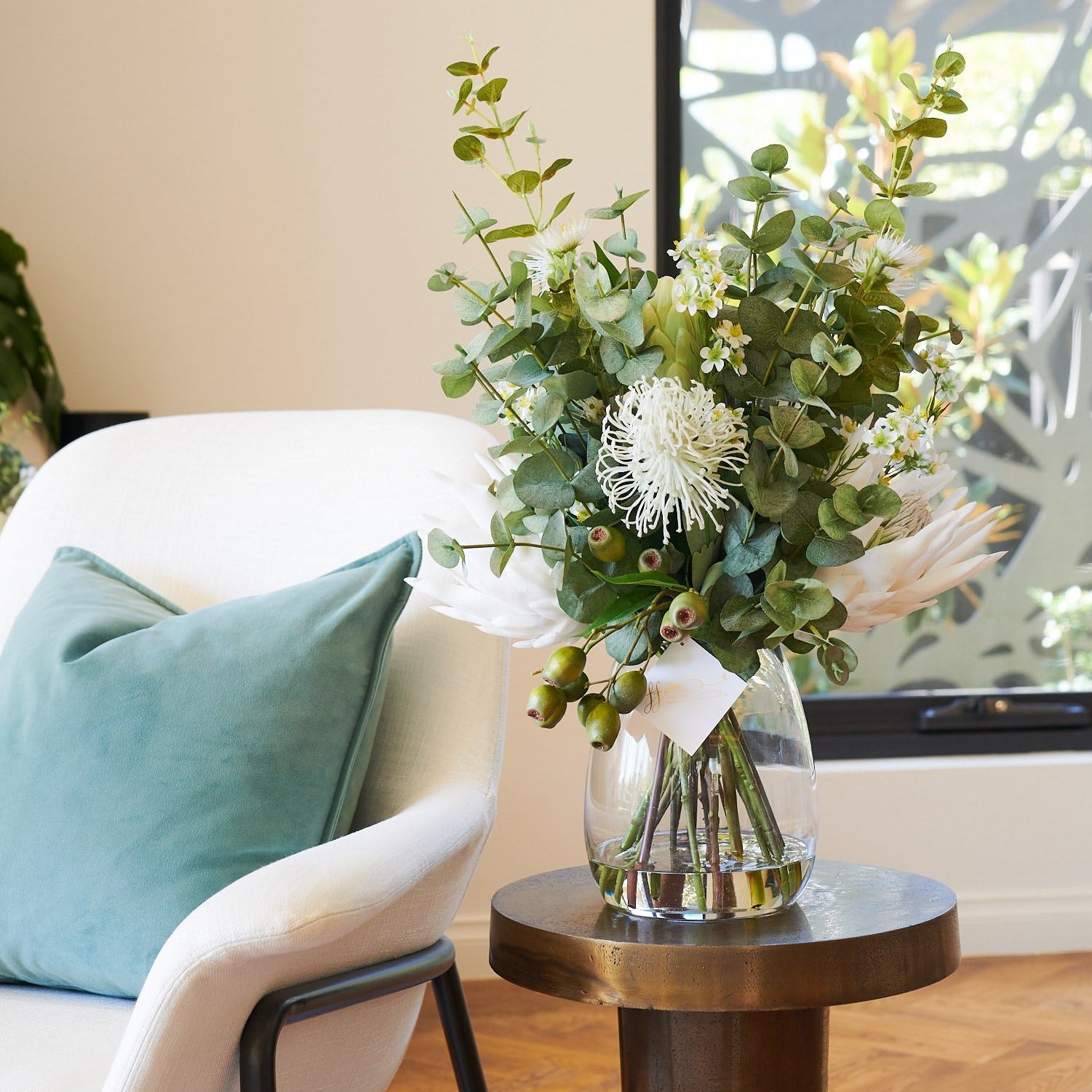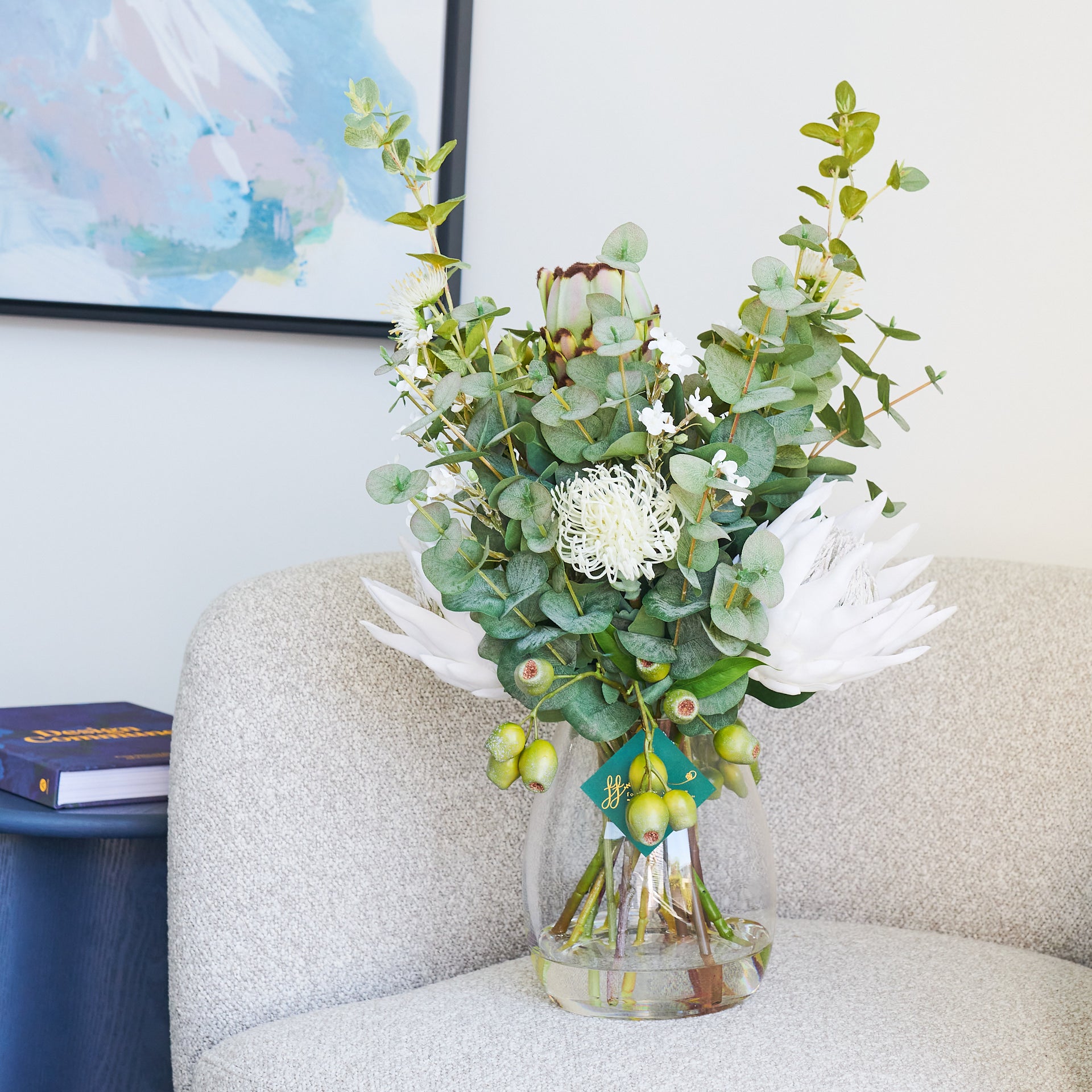 Real Touch Artificial Protea, Gum Nuts, Eucalyptus Leaves, Blossom Flower, Leucosperum Pin Cushion and Wax Flower spray in Belly Vase and Artificial Water. 360-degree flower arrangement.