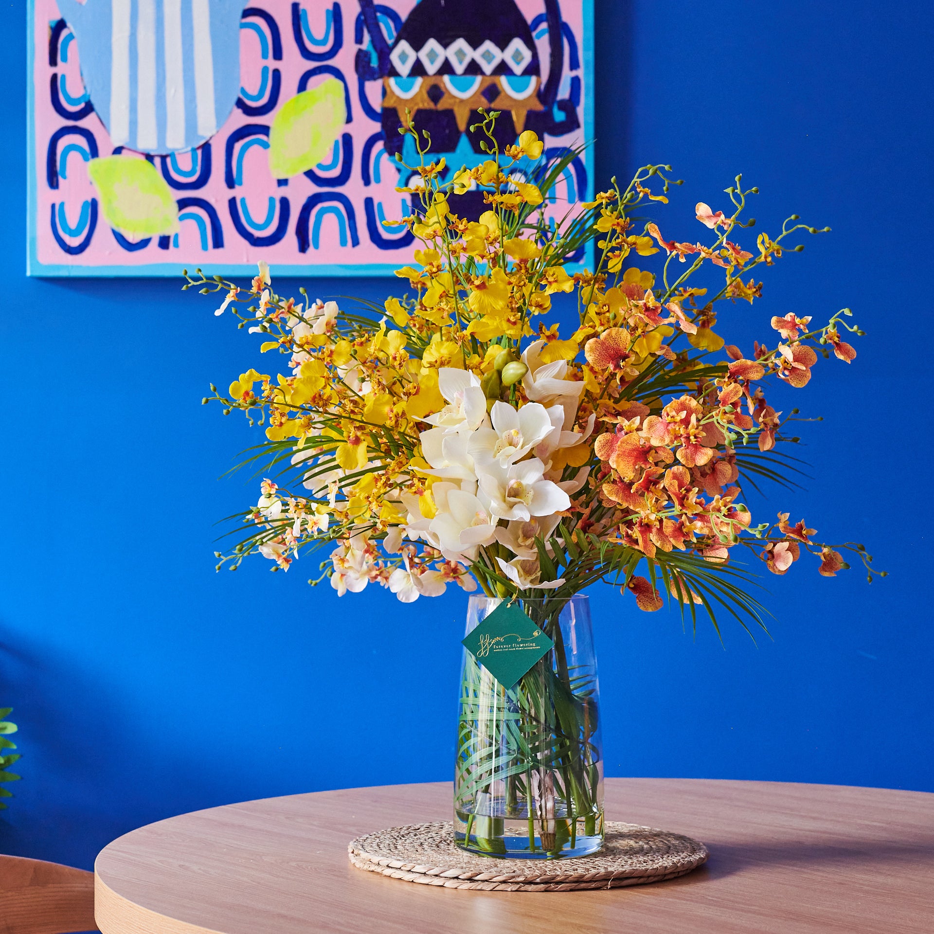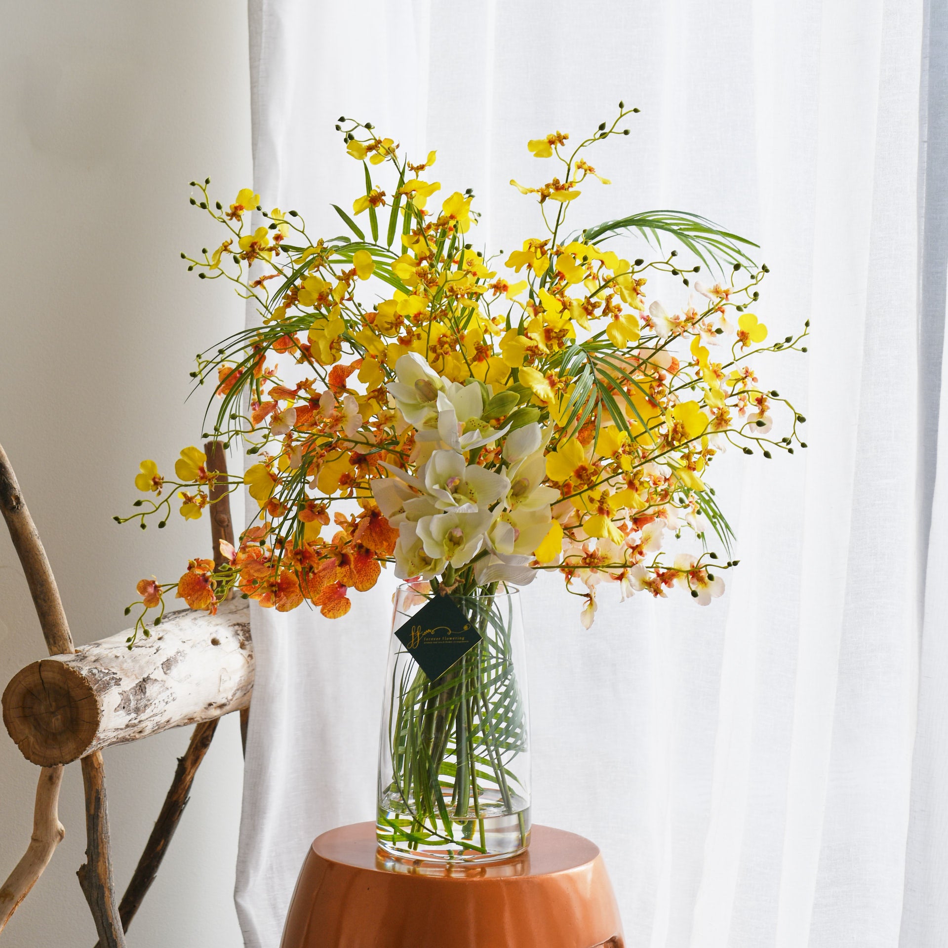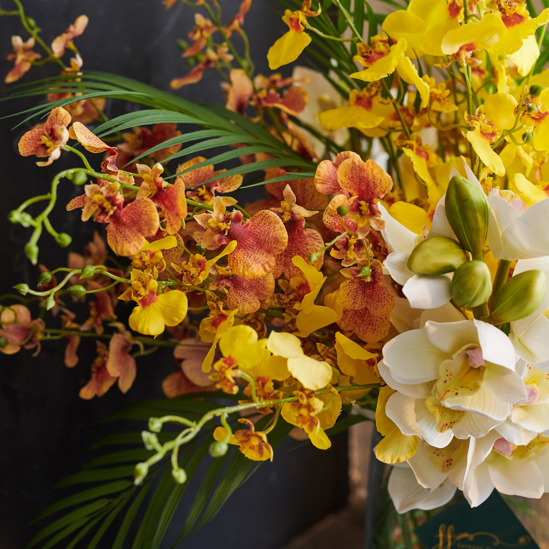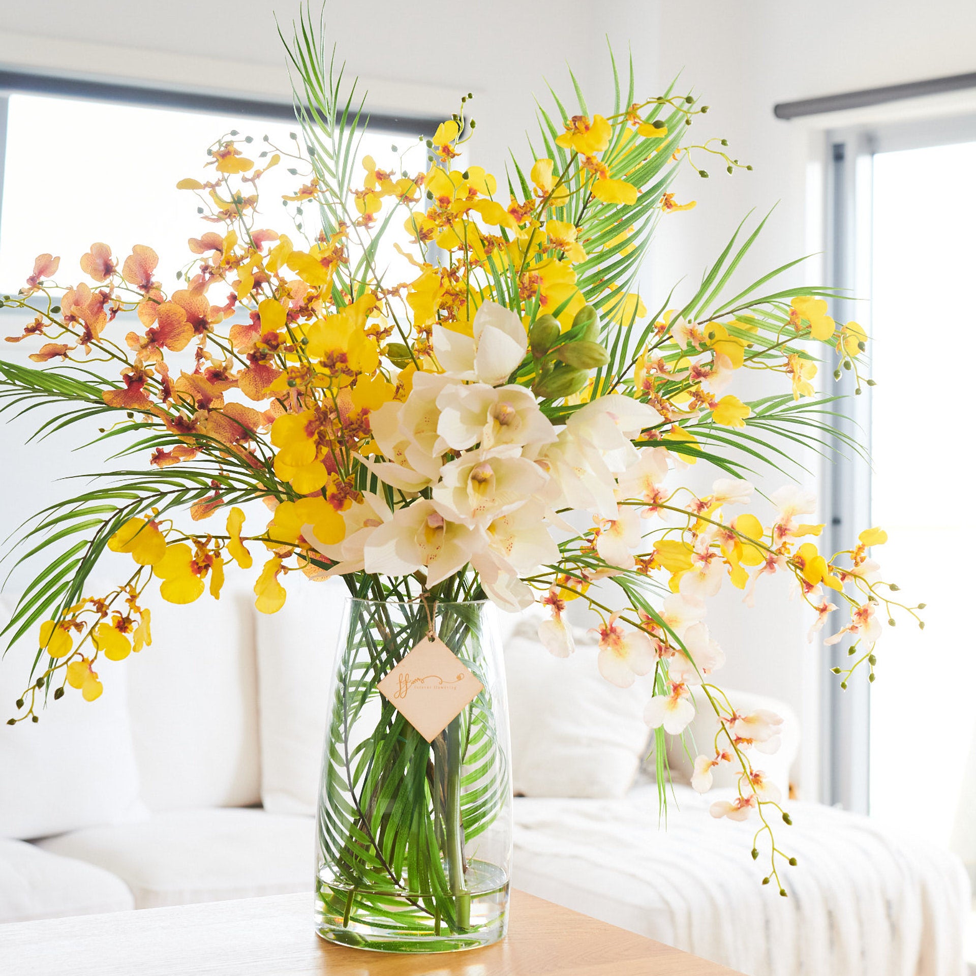 Real Touch Dancing Orchid, Cymbidium Orchids, Phoenix Palm Bush and Leaf in Torpedo Vase and Artificial Water. This is a 360-degree flower arrangement.