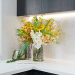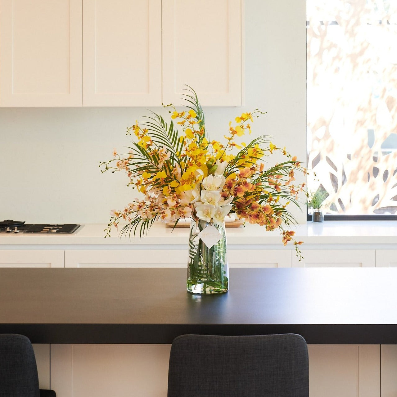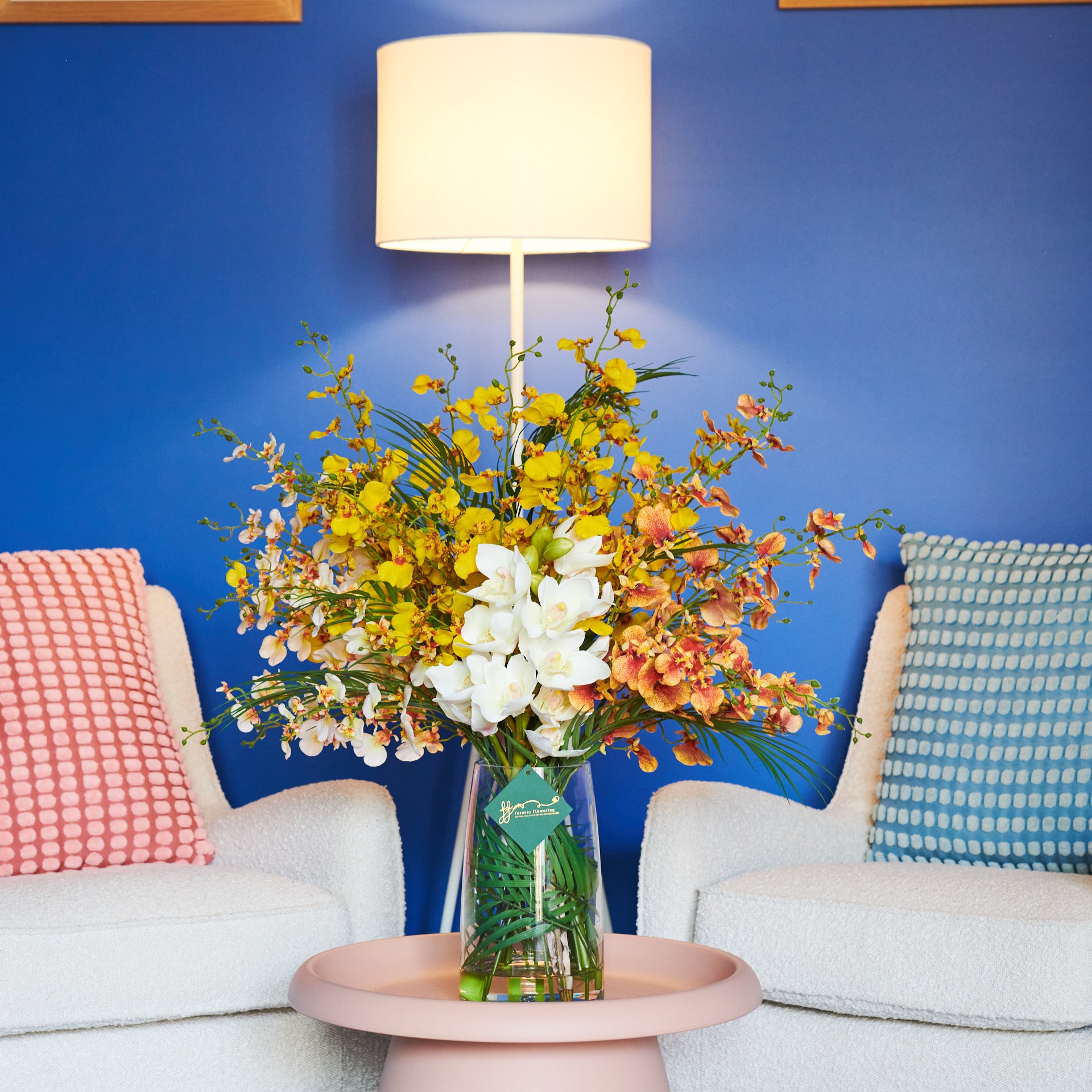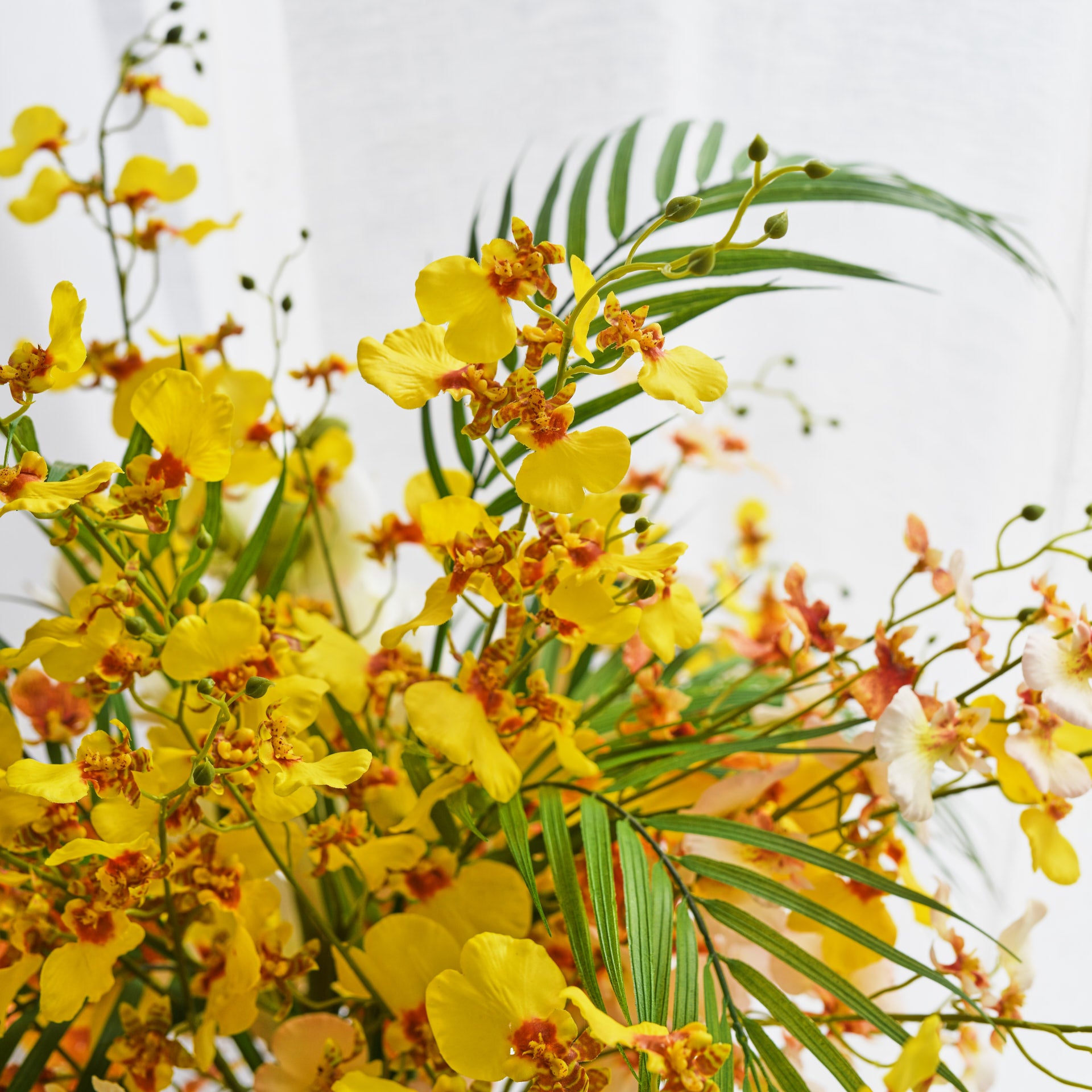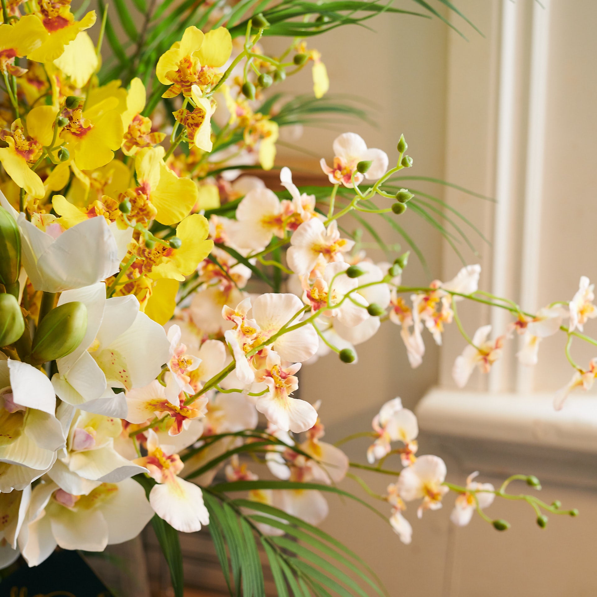 Real Touch Dancing Orchid, Cymbidium Orchids, Phoenix Palm Bush and Leaf in Torpedo Vase and Artificial Water. This is a 360-degree flower arrangement.