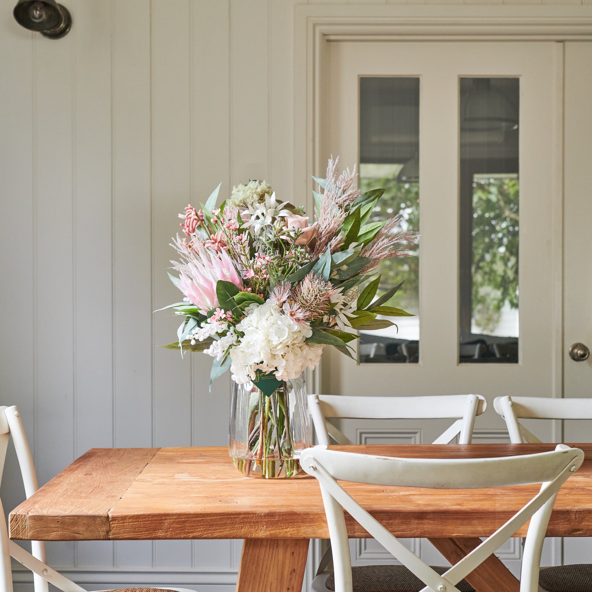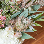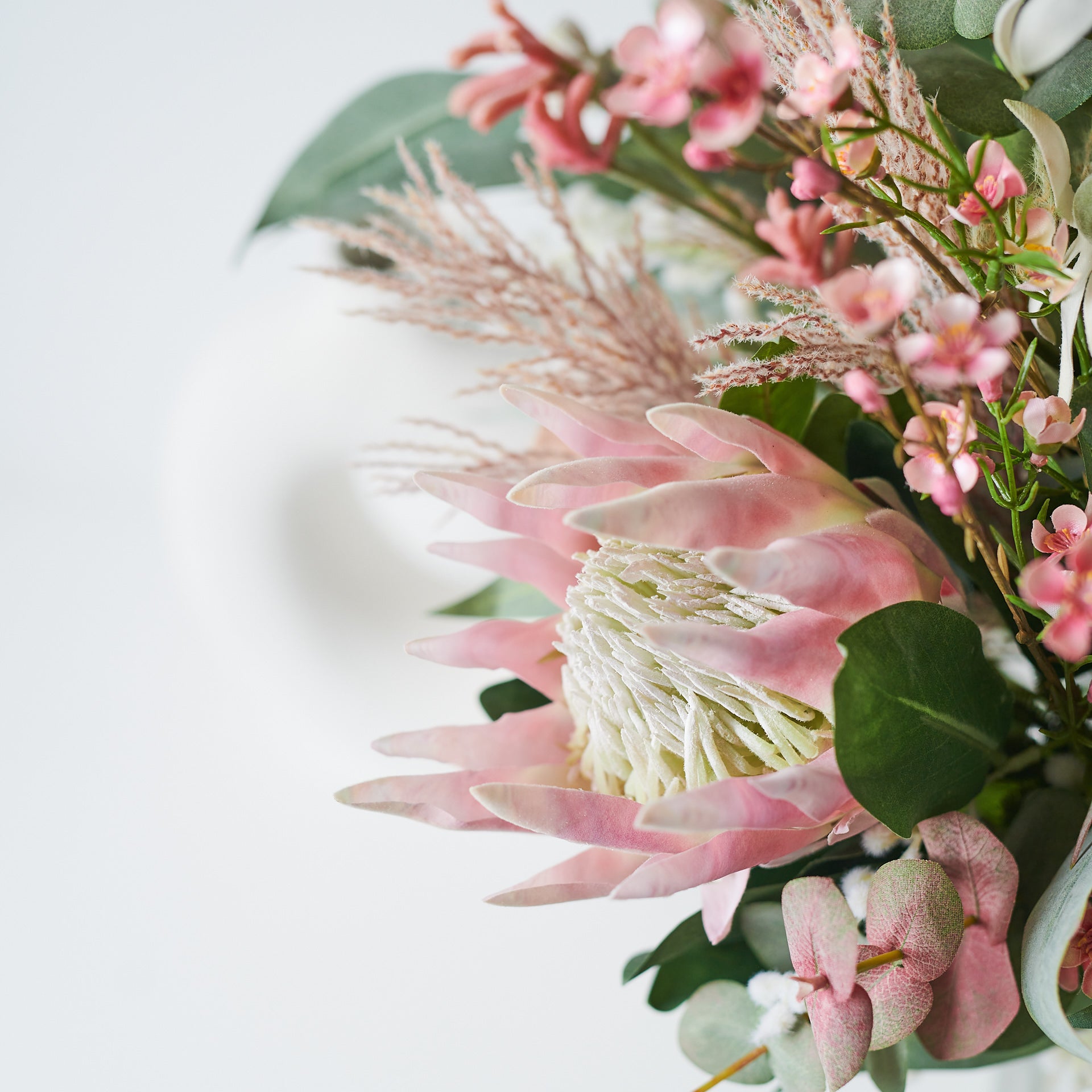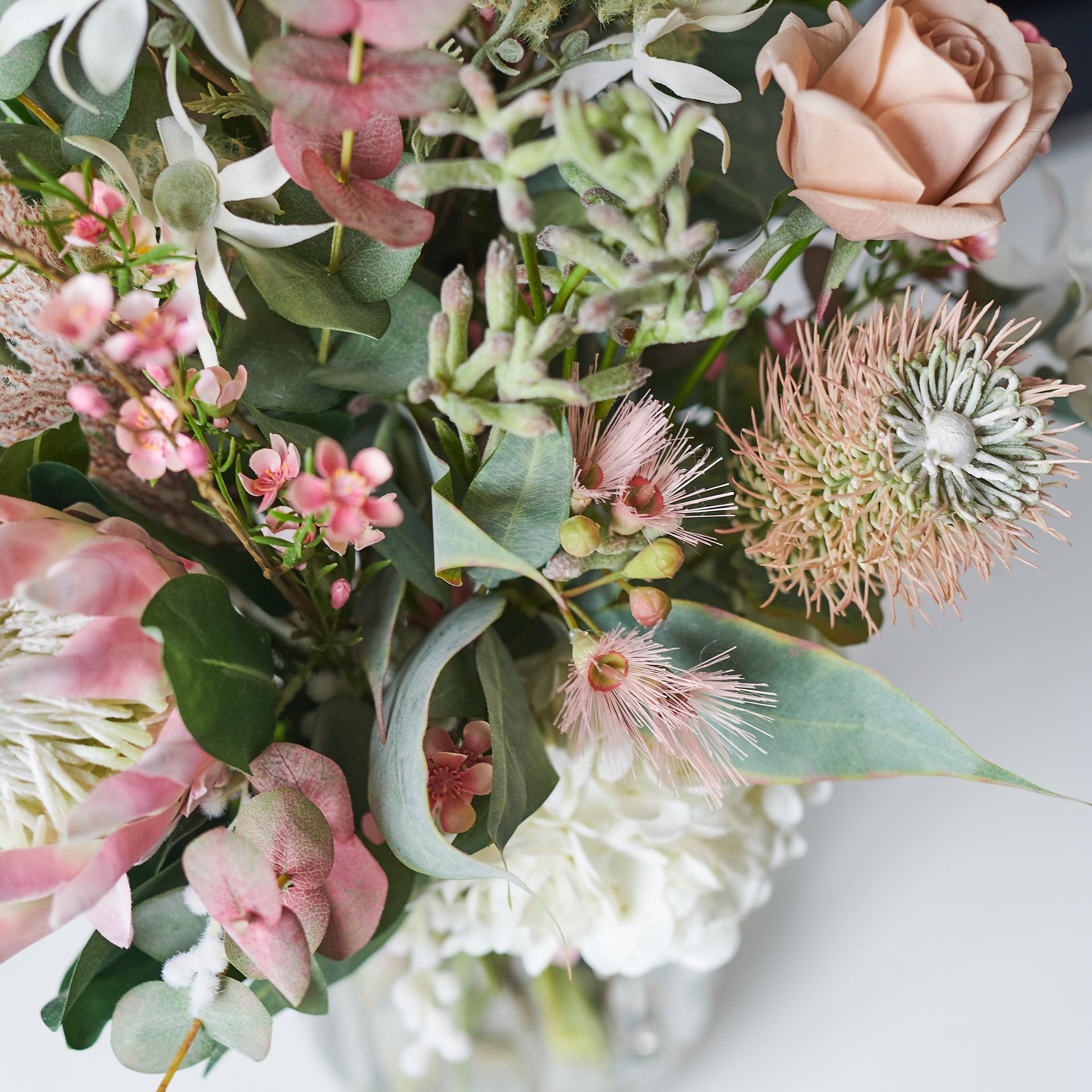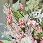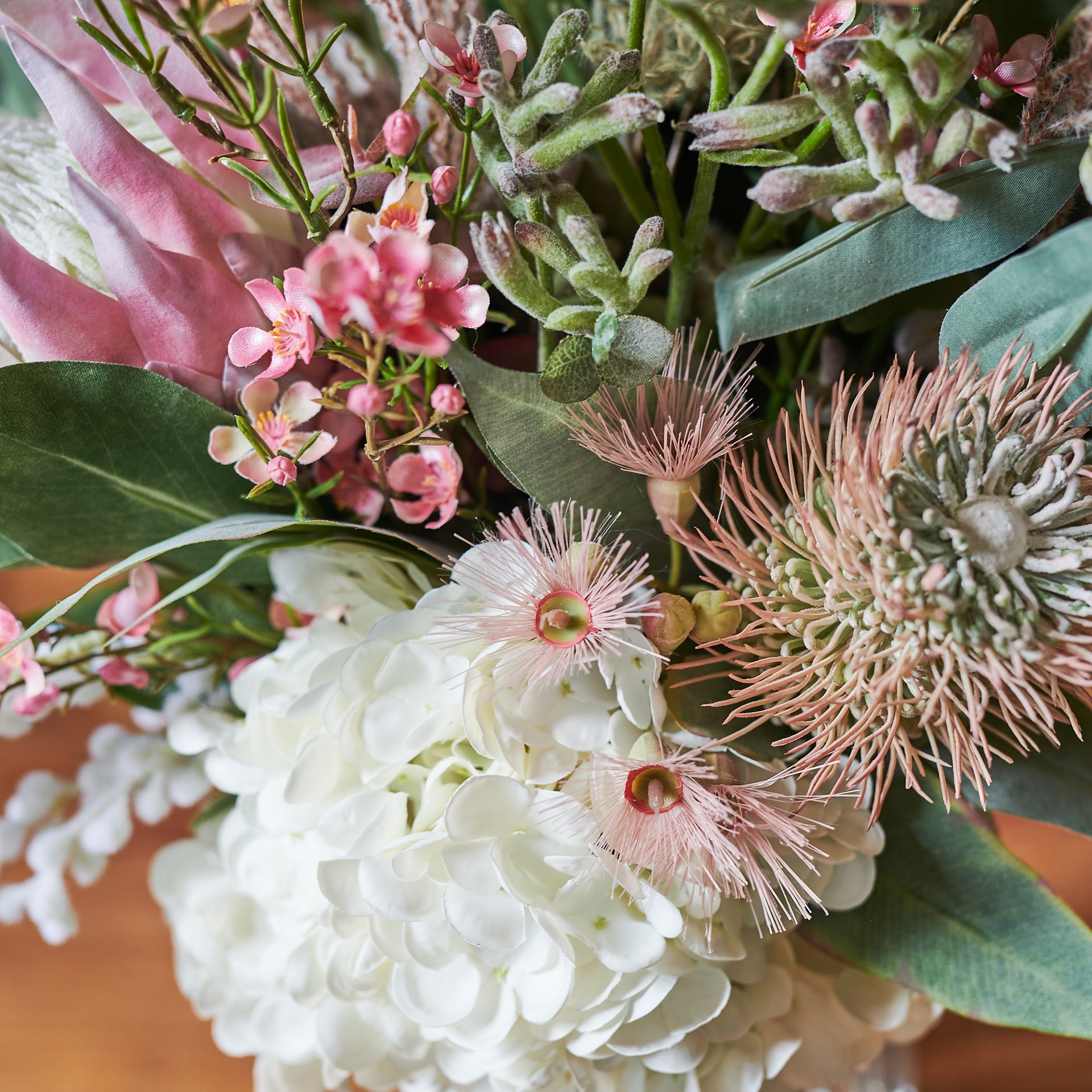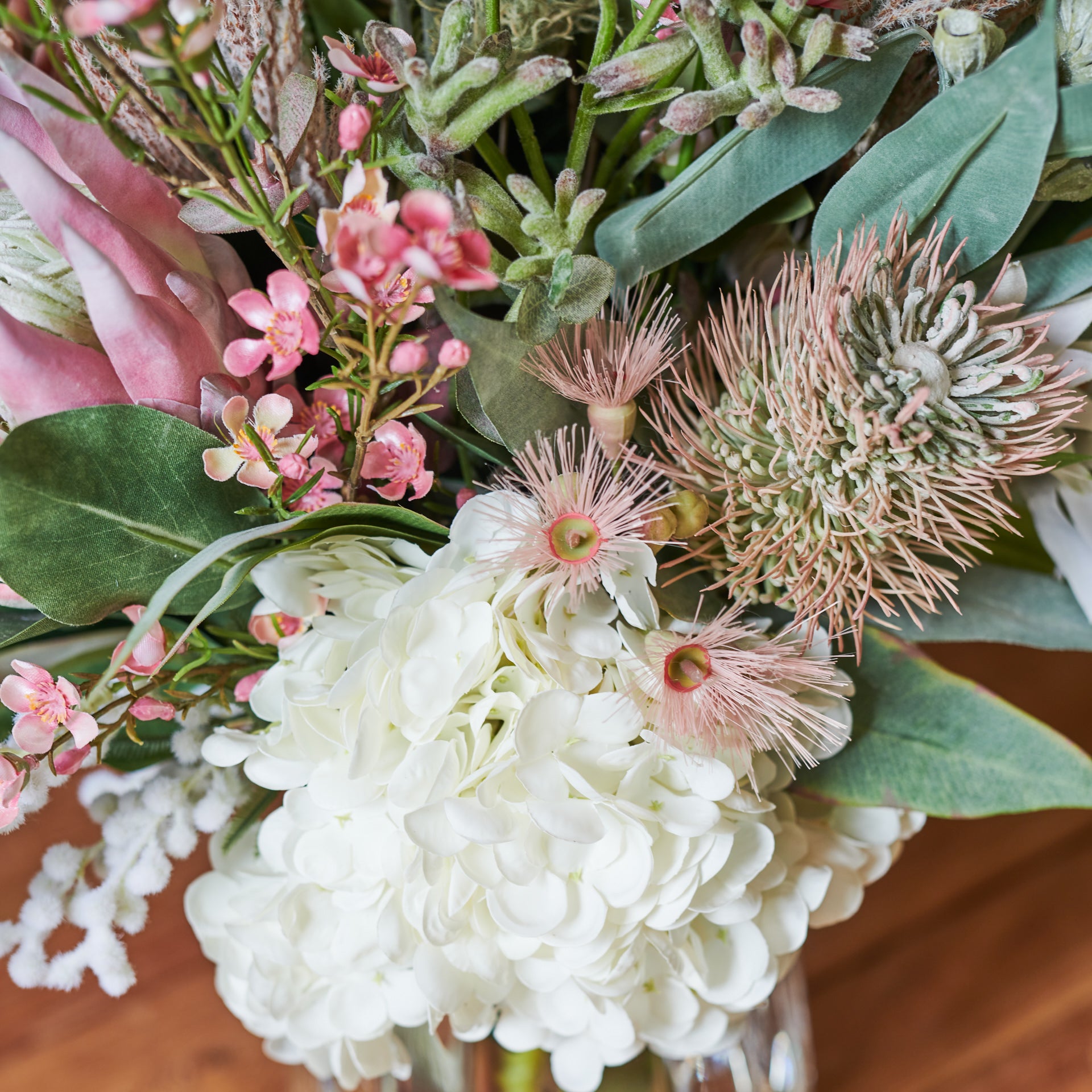 Australian Native Real Touch King Protea, Kangaroo Paw, Eucalyptus Leaves, Blossom Flower, Leucosperum Pin Cushion and Hydrangea, with Wax Flower, Flannel Flower and Tetragona in Glass Vase and Artificial Water. 360 degree flower arrangement