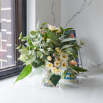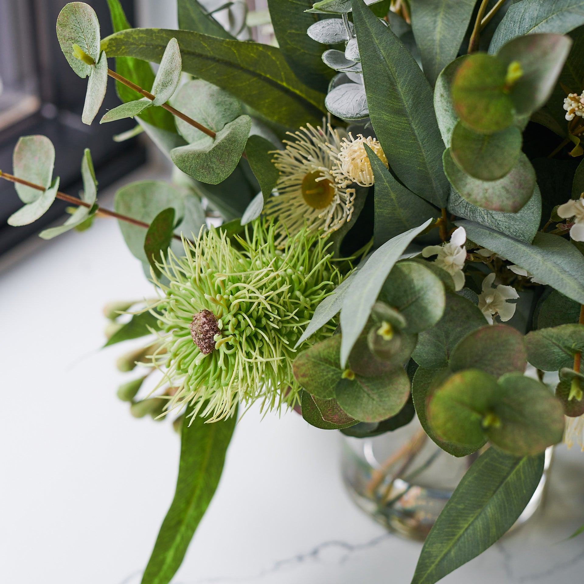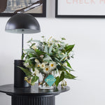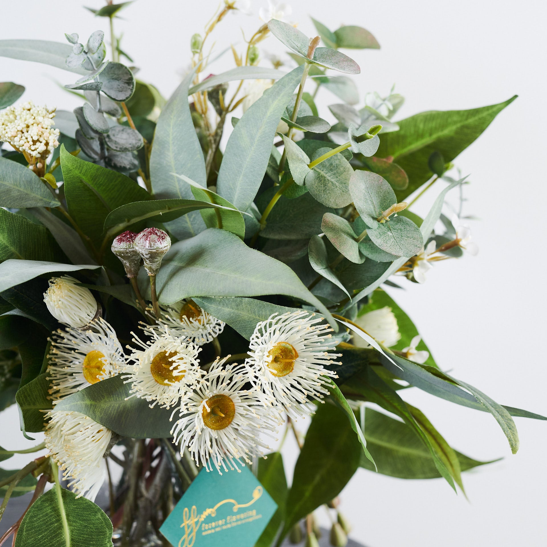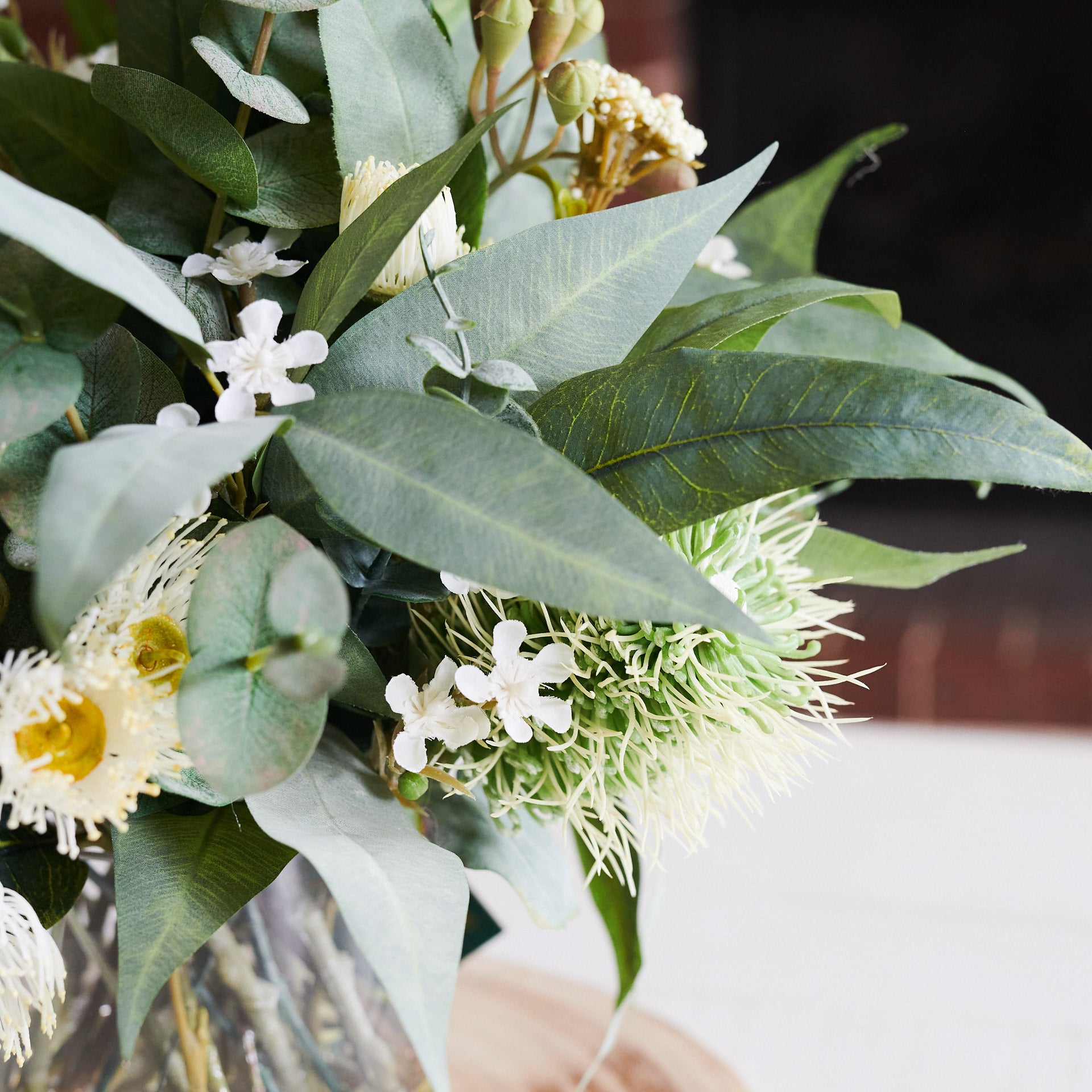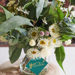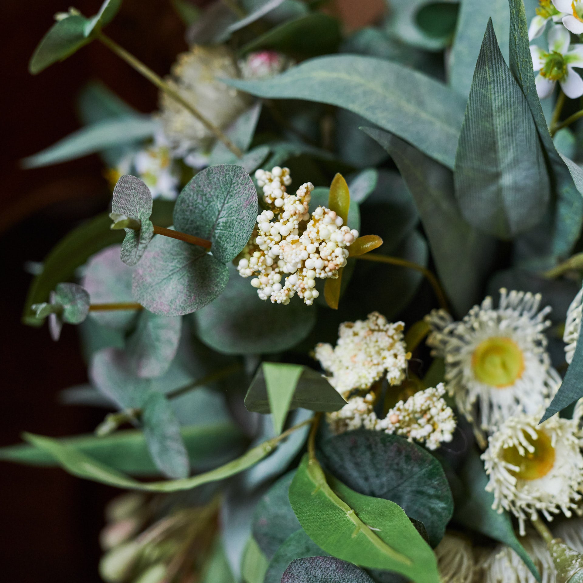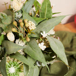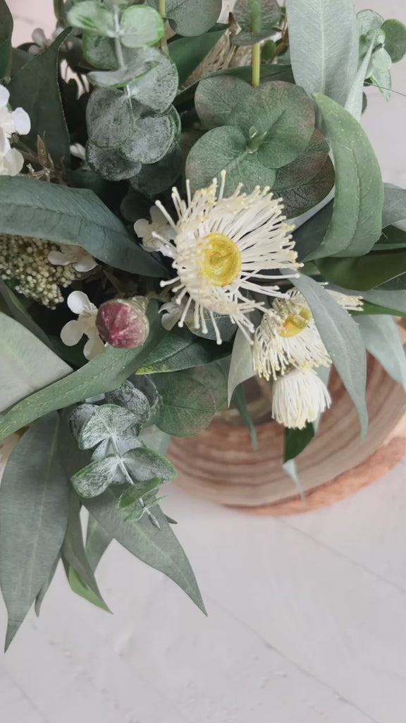 A smaller version of our best selling Drew arrangement, featuring a range of real touch eucalyptus and seed, blossom, spinning gum and wax flower.