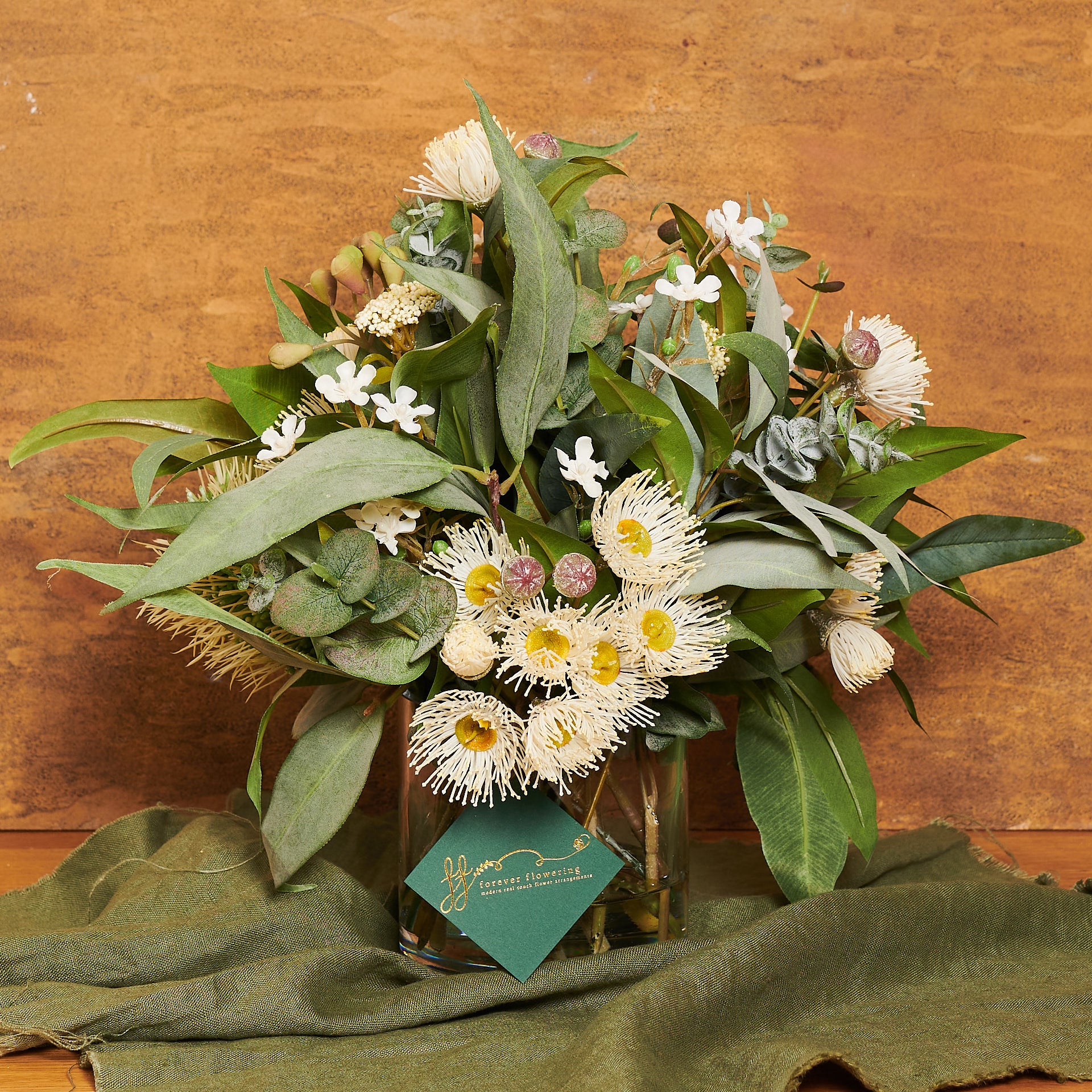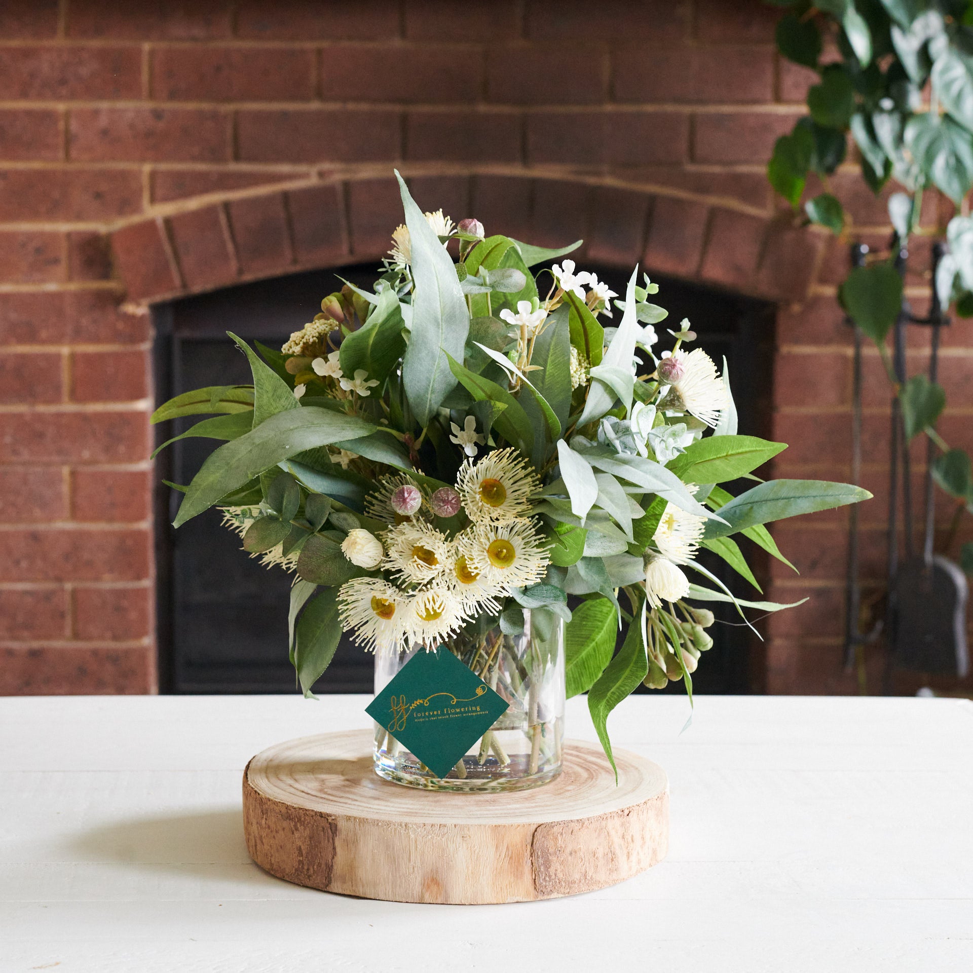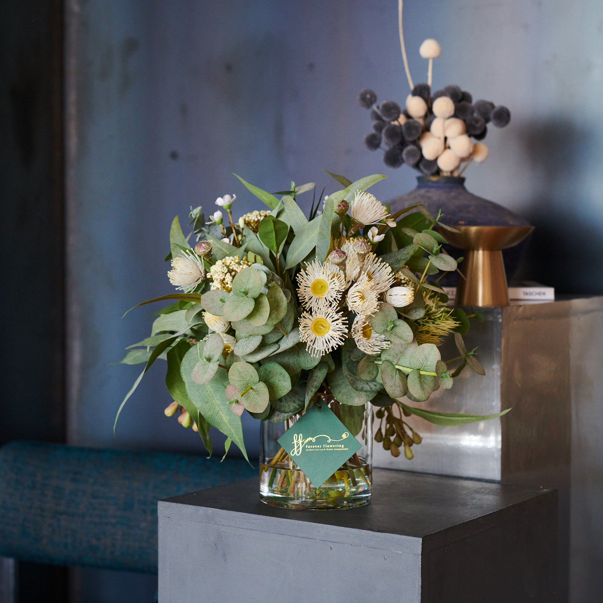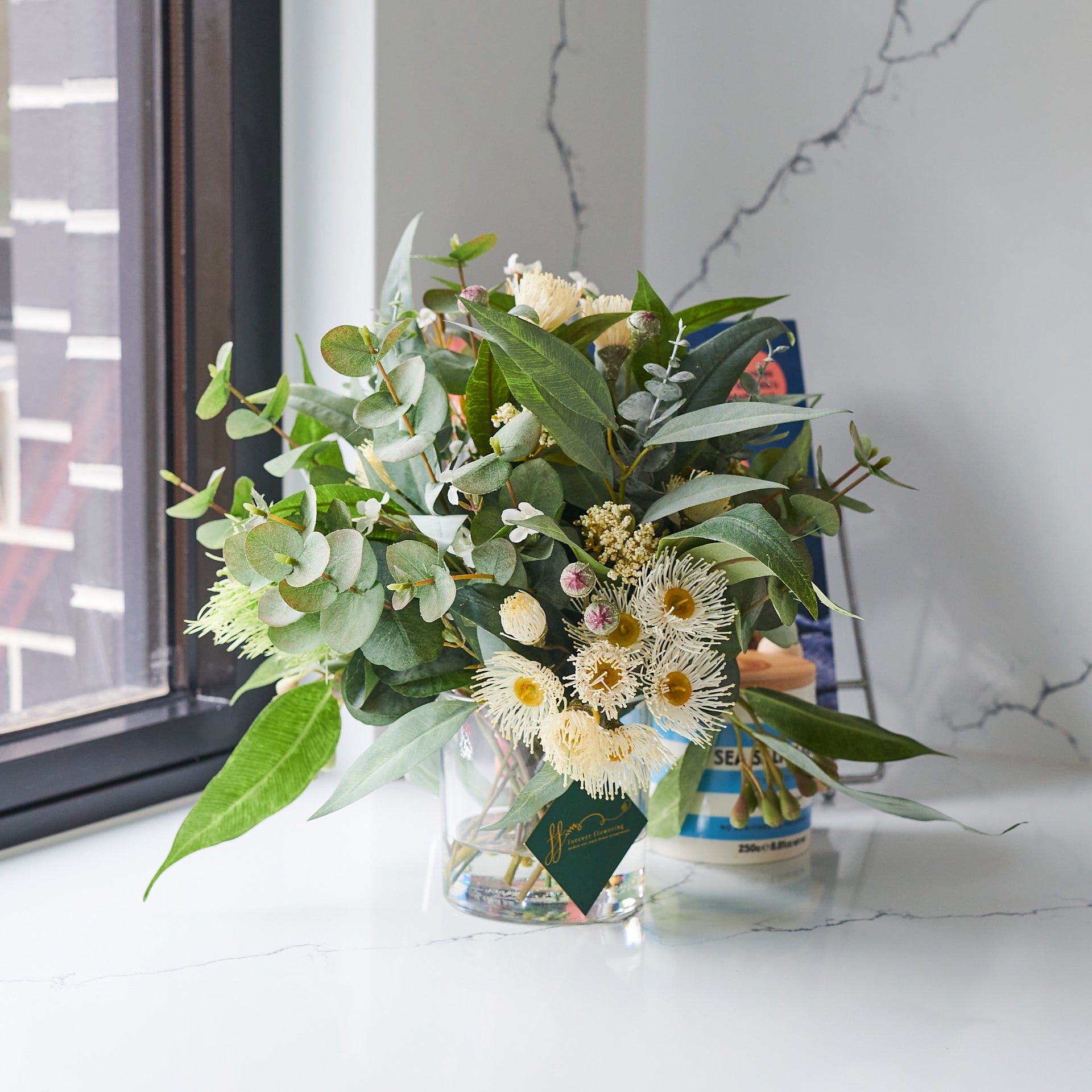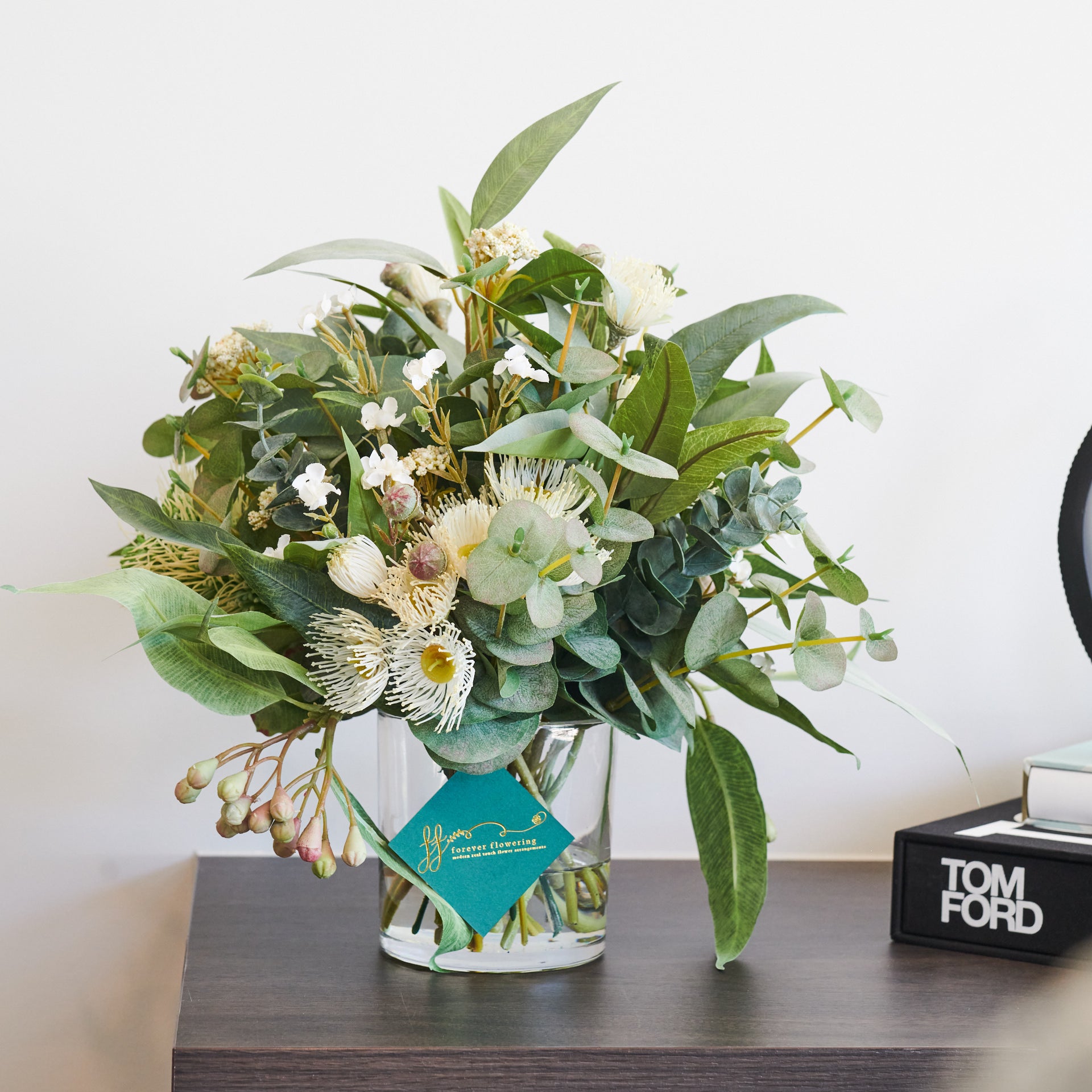 A smaller version of our best selling Drew arrangement, featuring a range of real touch eucalyptus and seed, blossom, spinning gum and wax flower.