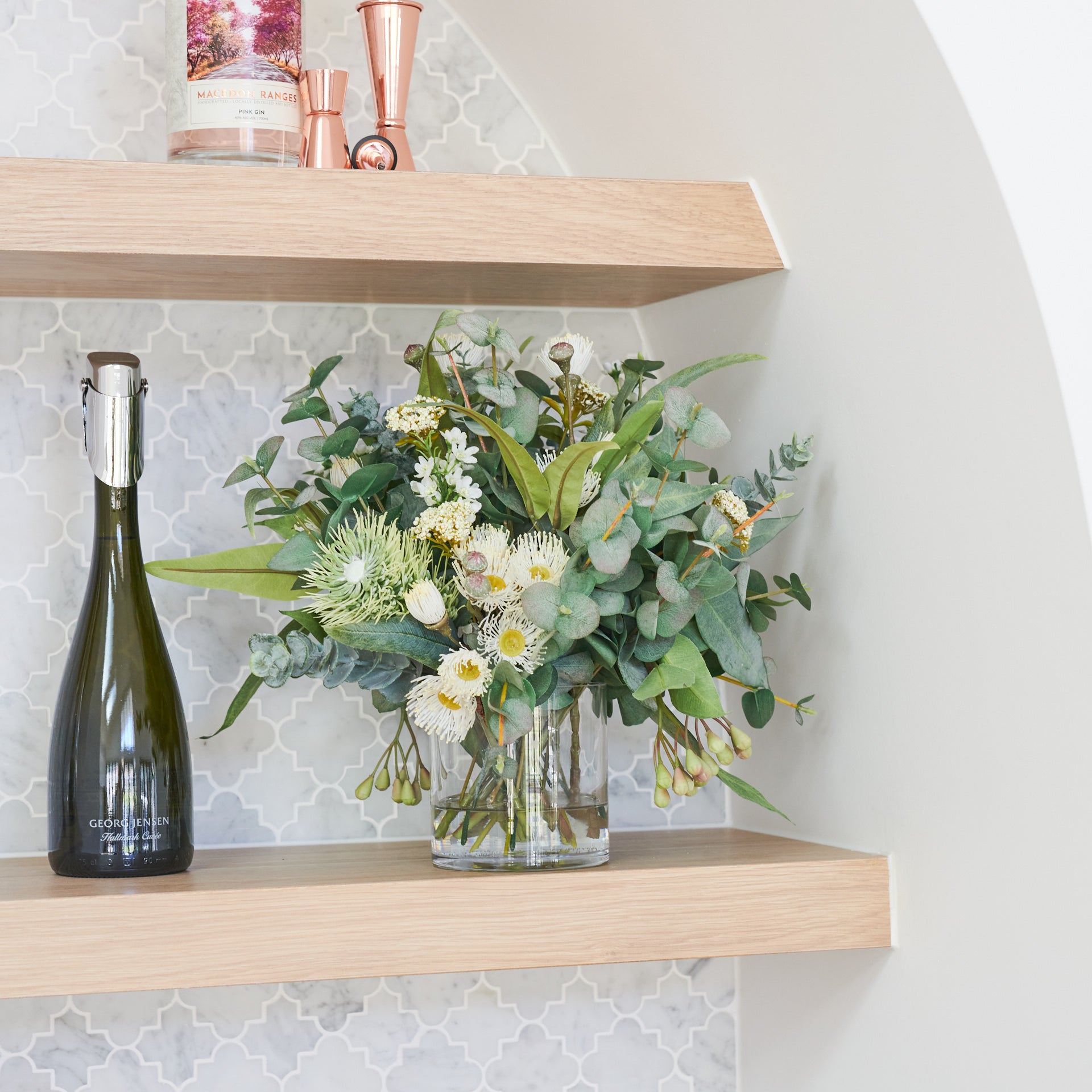 A smaller version of our best selling Drew arrangement, featuring a range of real touch eucalyptus and seed, blossom, spinning gum and wax flower.