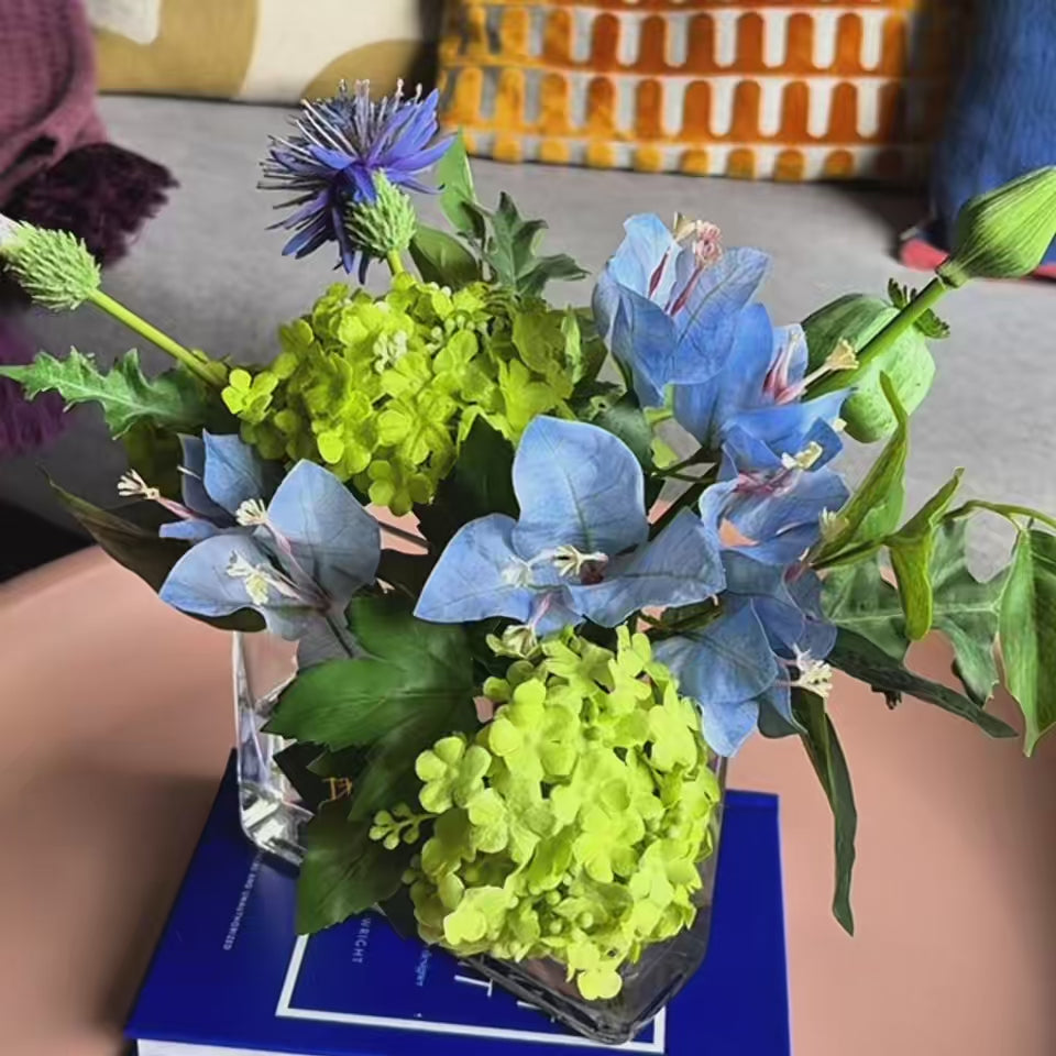 Real Touch Snowball, Bougainvillea, Poppy Seed and Thistle in a rectangle vase. Flowers are permanently set in artificial water. This is a 360-degree arrangement.