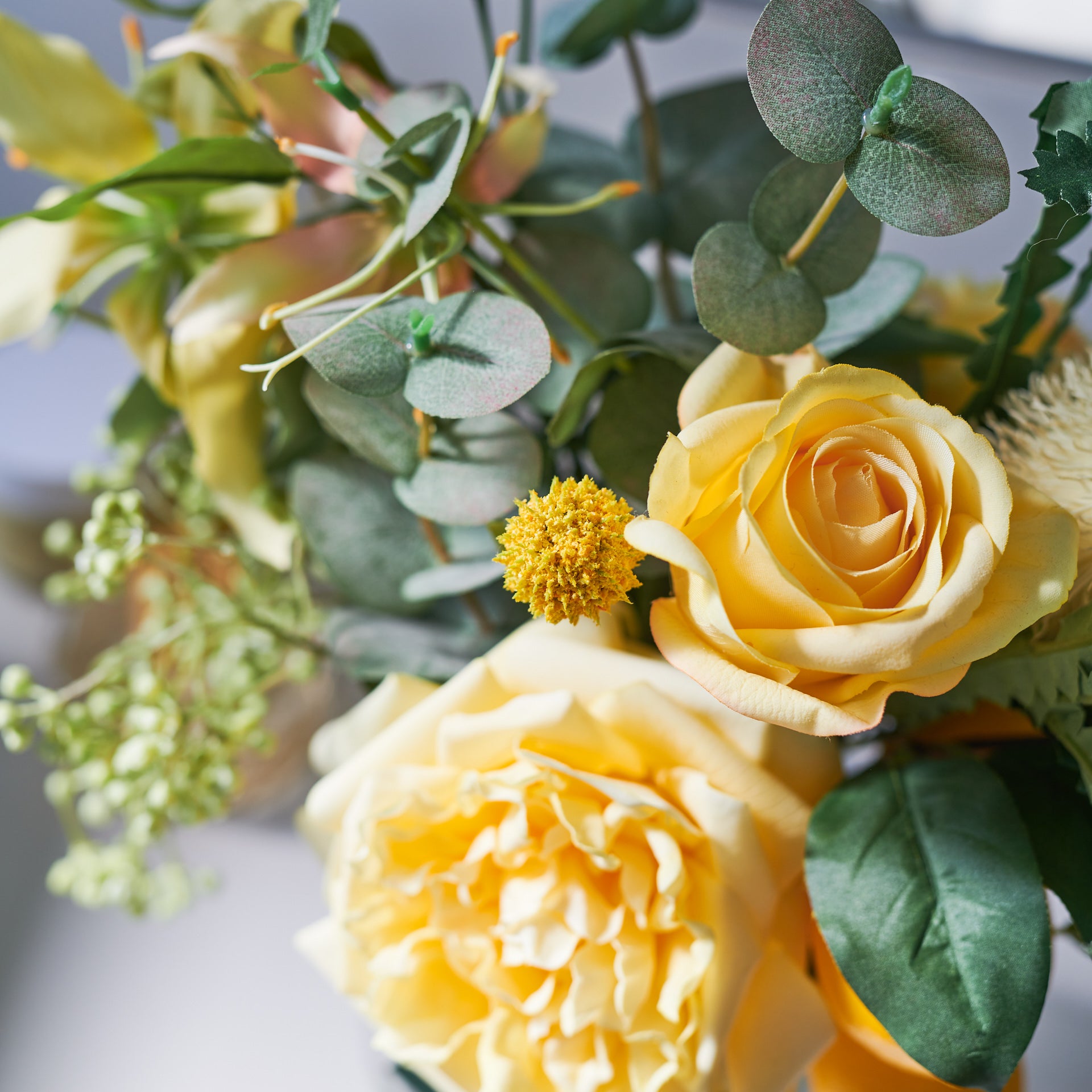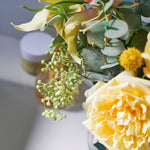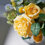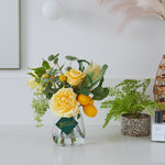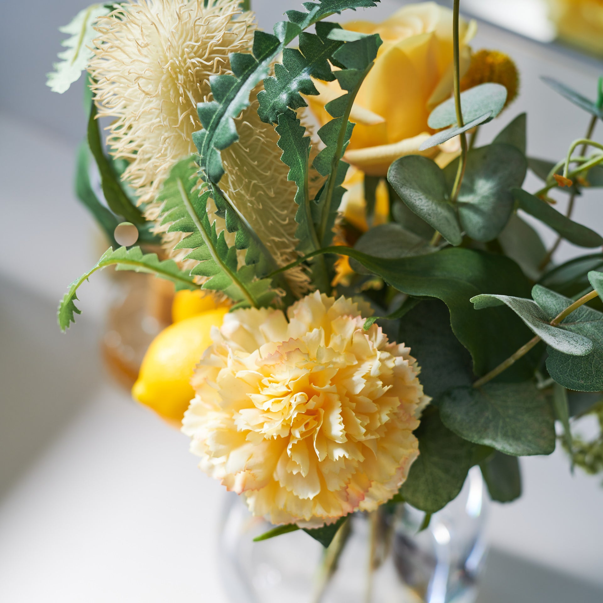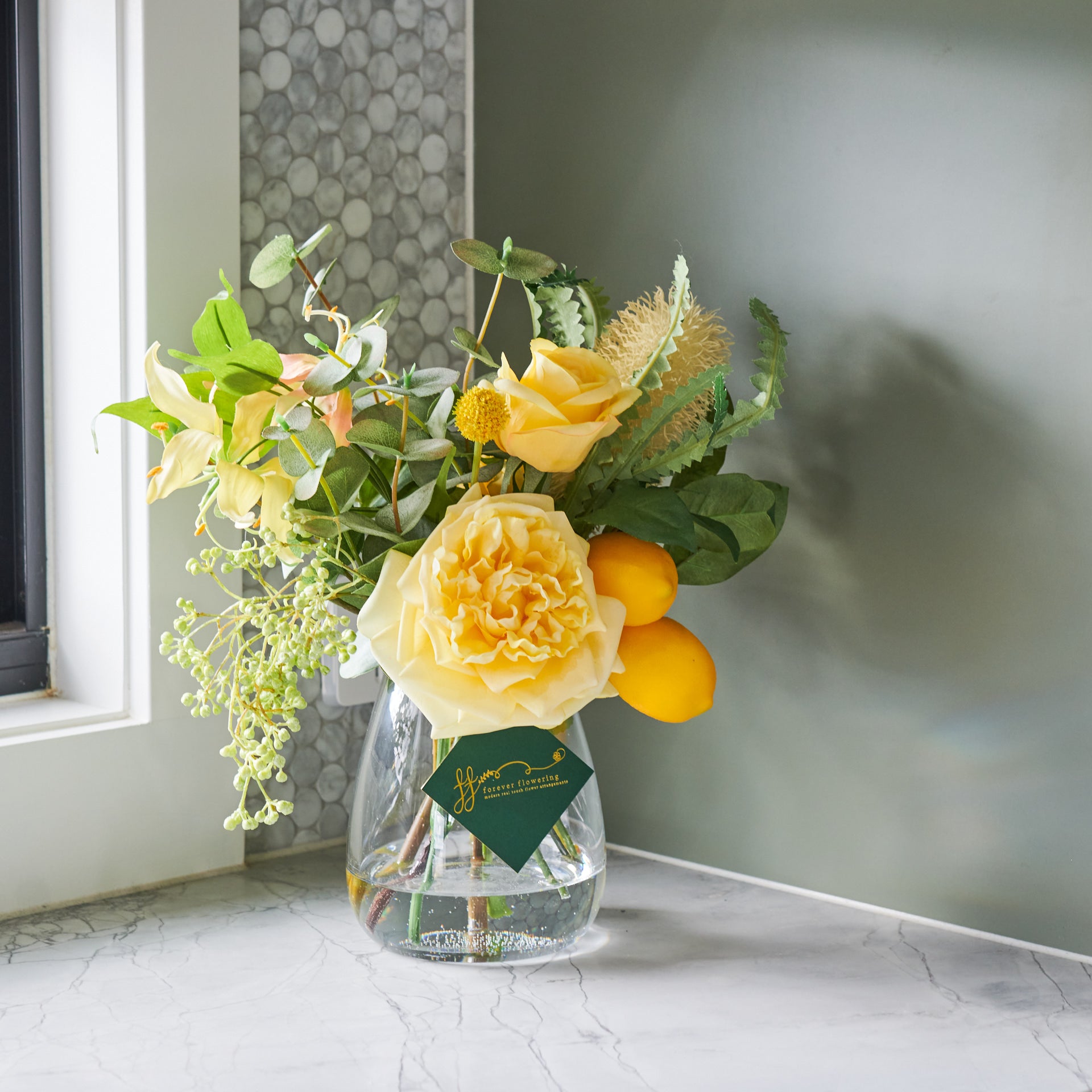 Like a delicious Limoncello, this arrangement features lemons with real touch roses, carnation and banksia with eucalyptus and seeded berry set in artificial water in a glass vase.