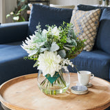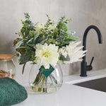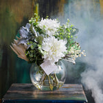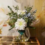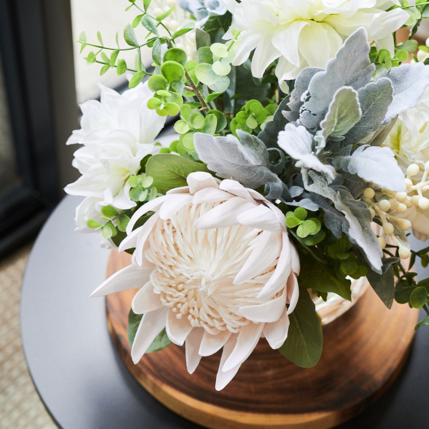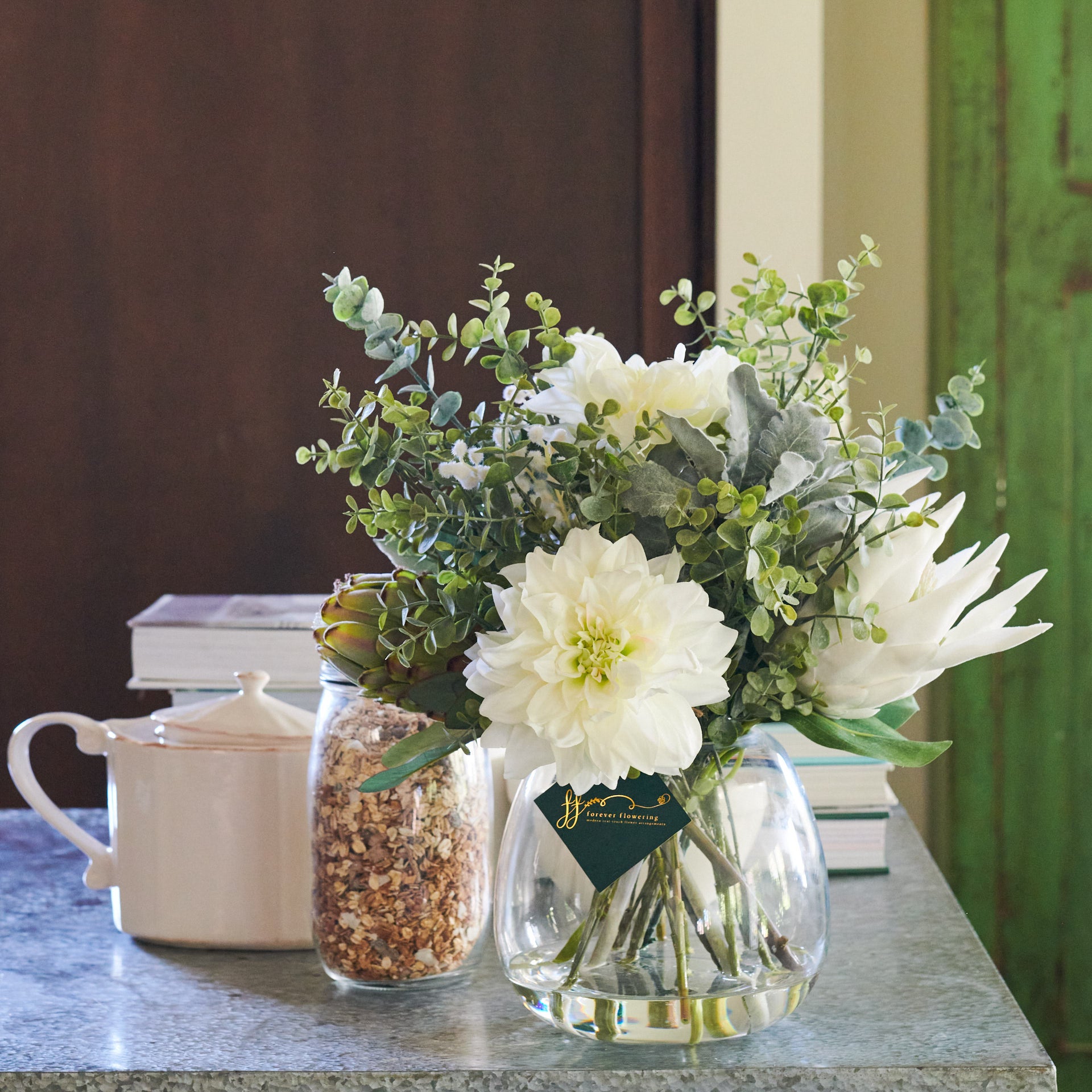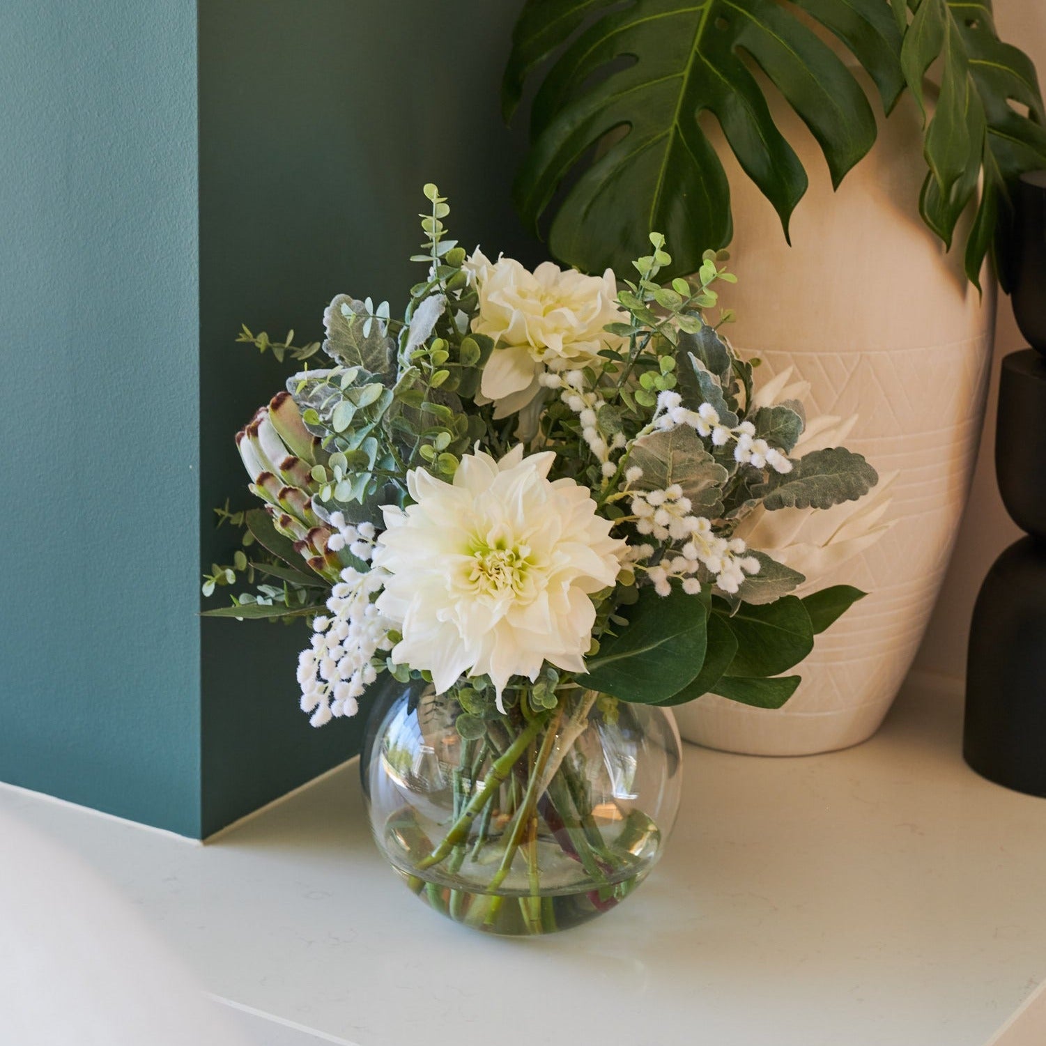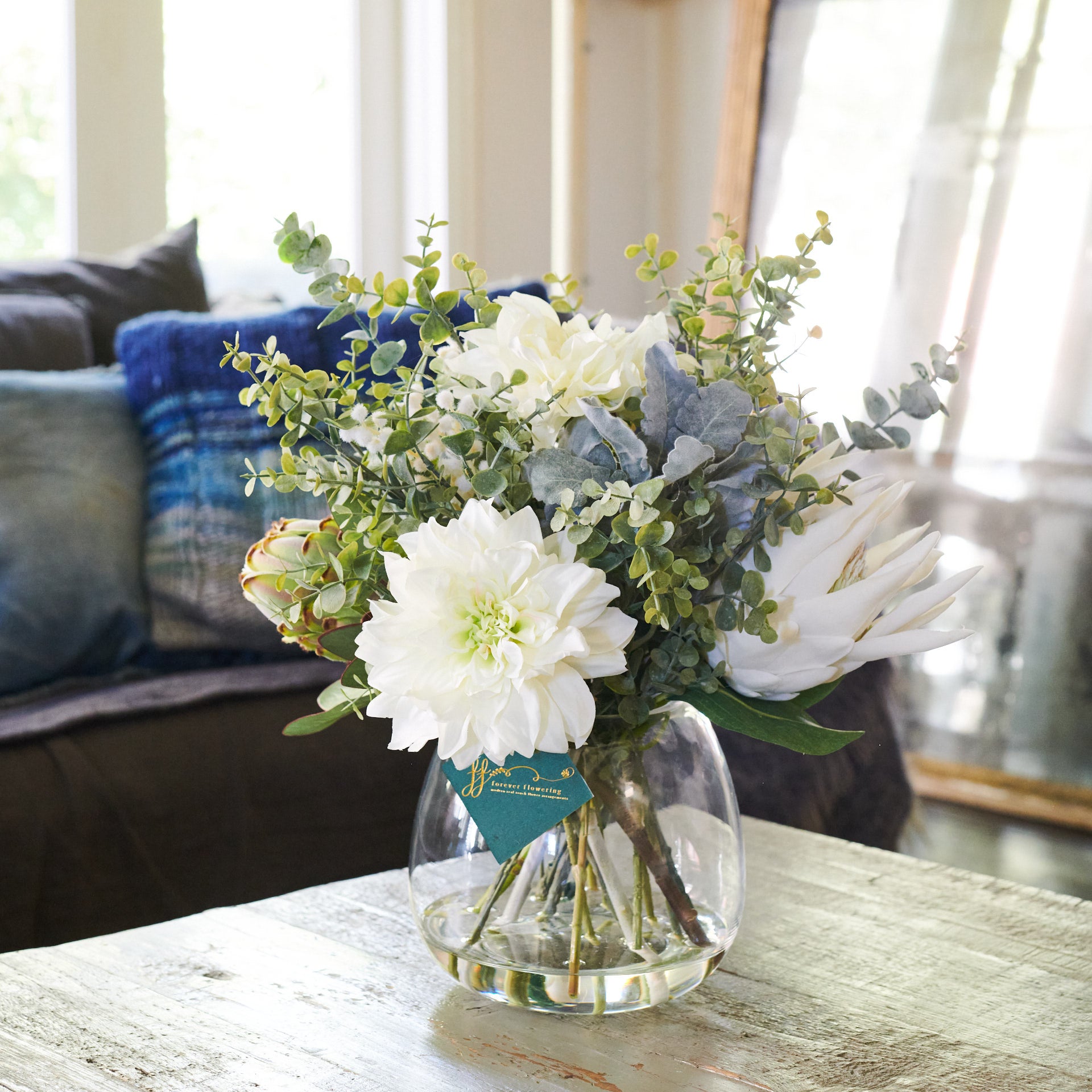 Real Touch Artificial Proteas, Wattle, Dusty Miller Lambs Ear, Dinnerplate Dahlia and Mini Gum Eucalyptus Leaves in Fishbowl Vase and Artificial Water. 360 degree flower arrangement