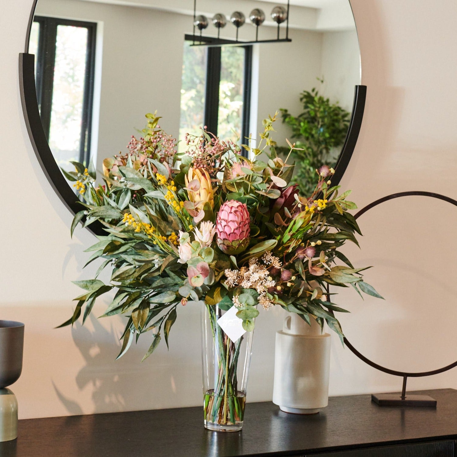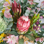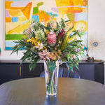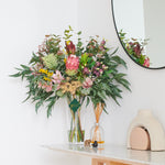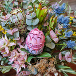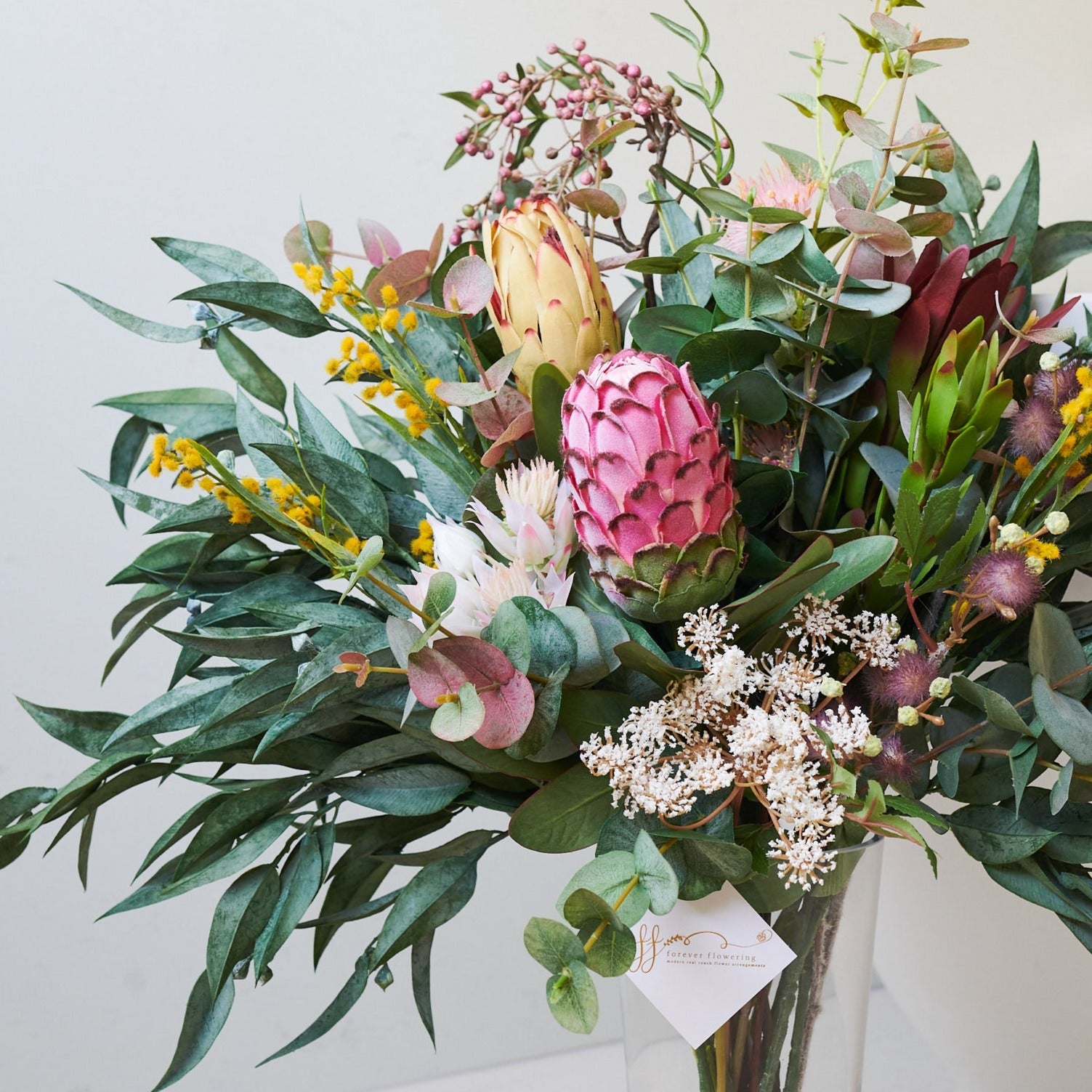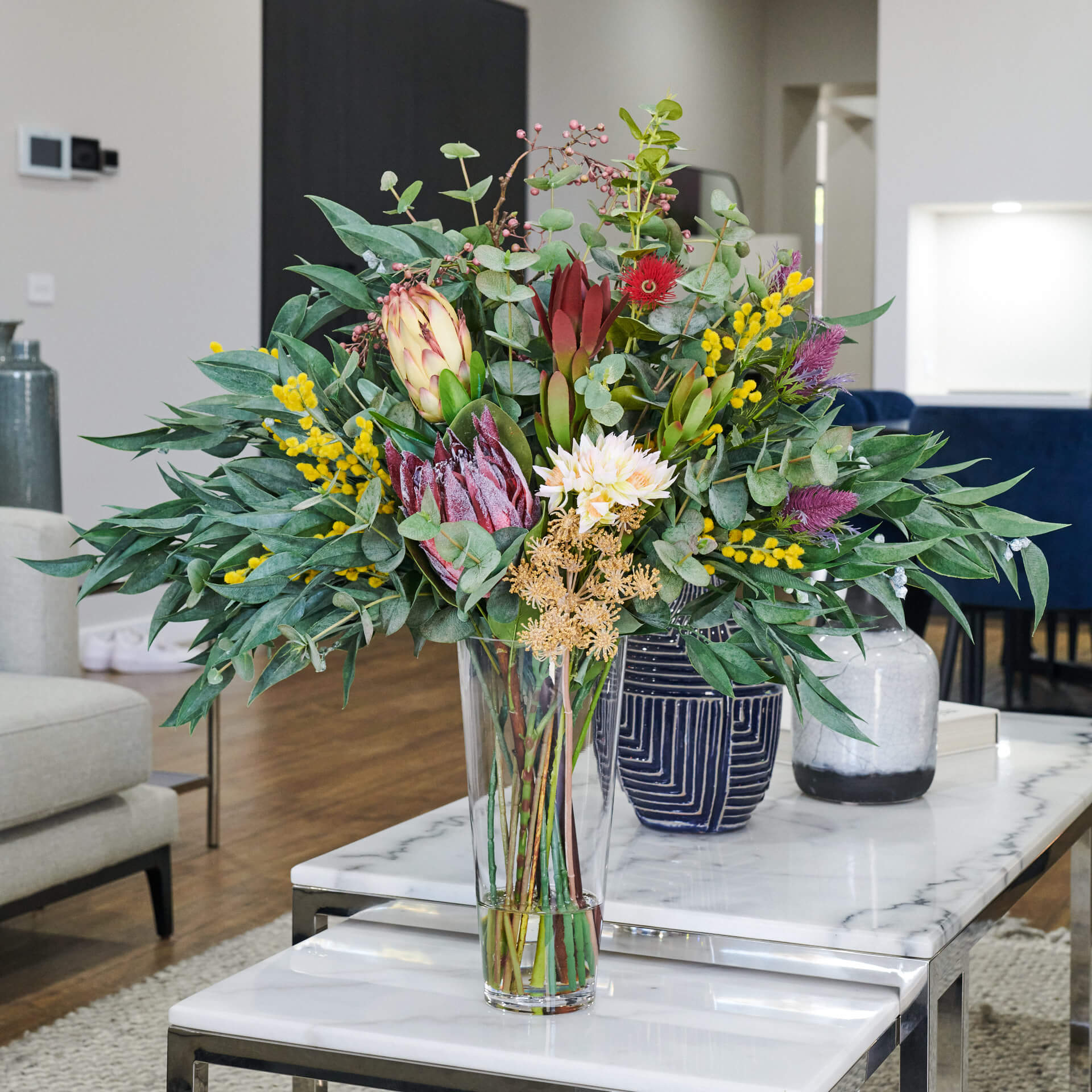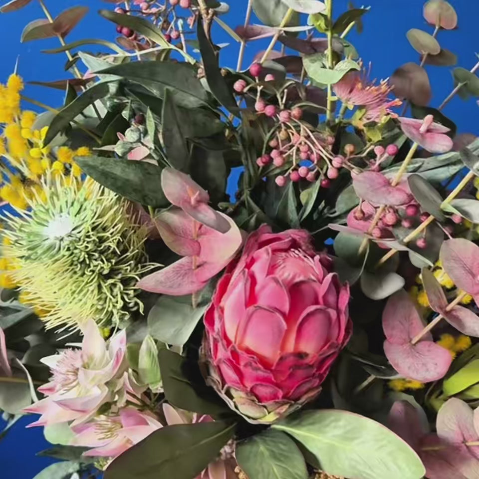 Real Touch Australian Native Proteas, Wattle, Gum nuts, Sea Holly, Peppercorn, Eucalyptus Gum Leaves, Leucadendron, Queen Anne Lace Spray in vase set in Artificial Water.