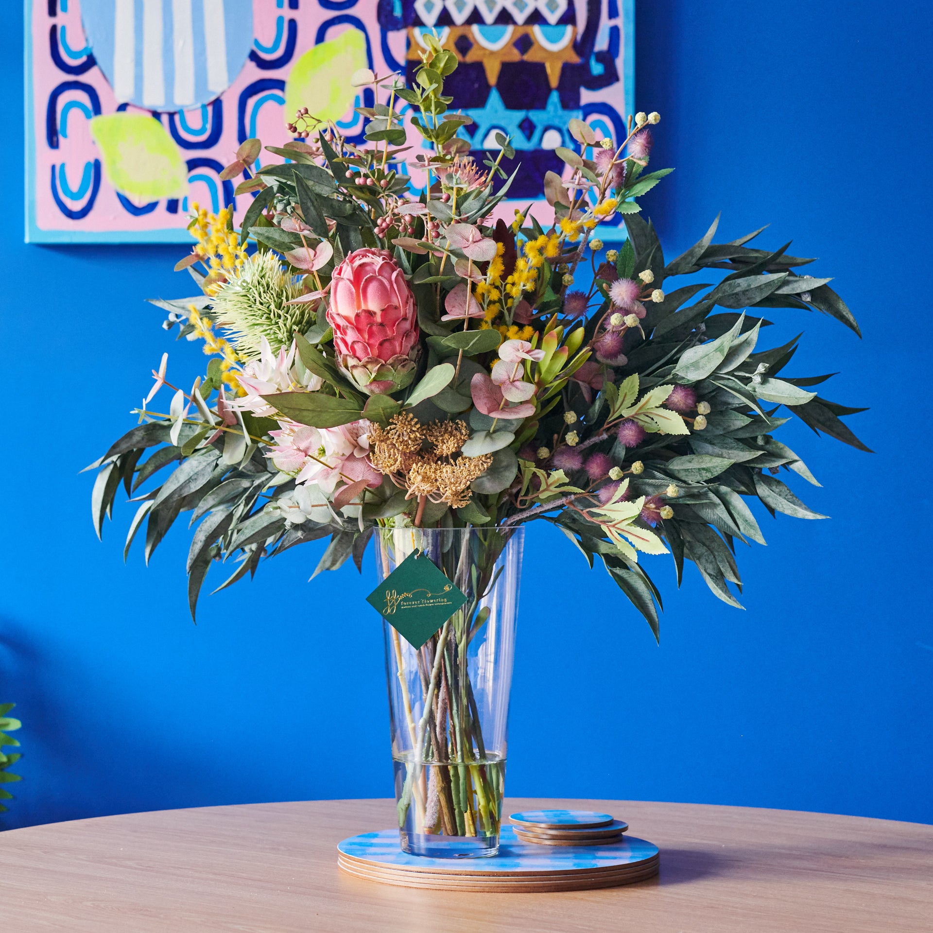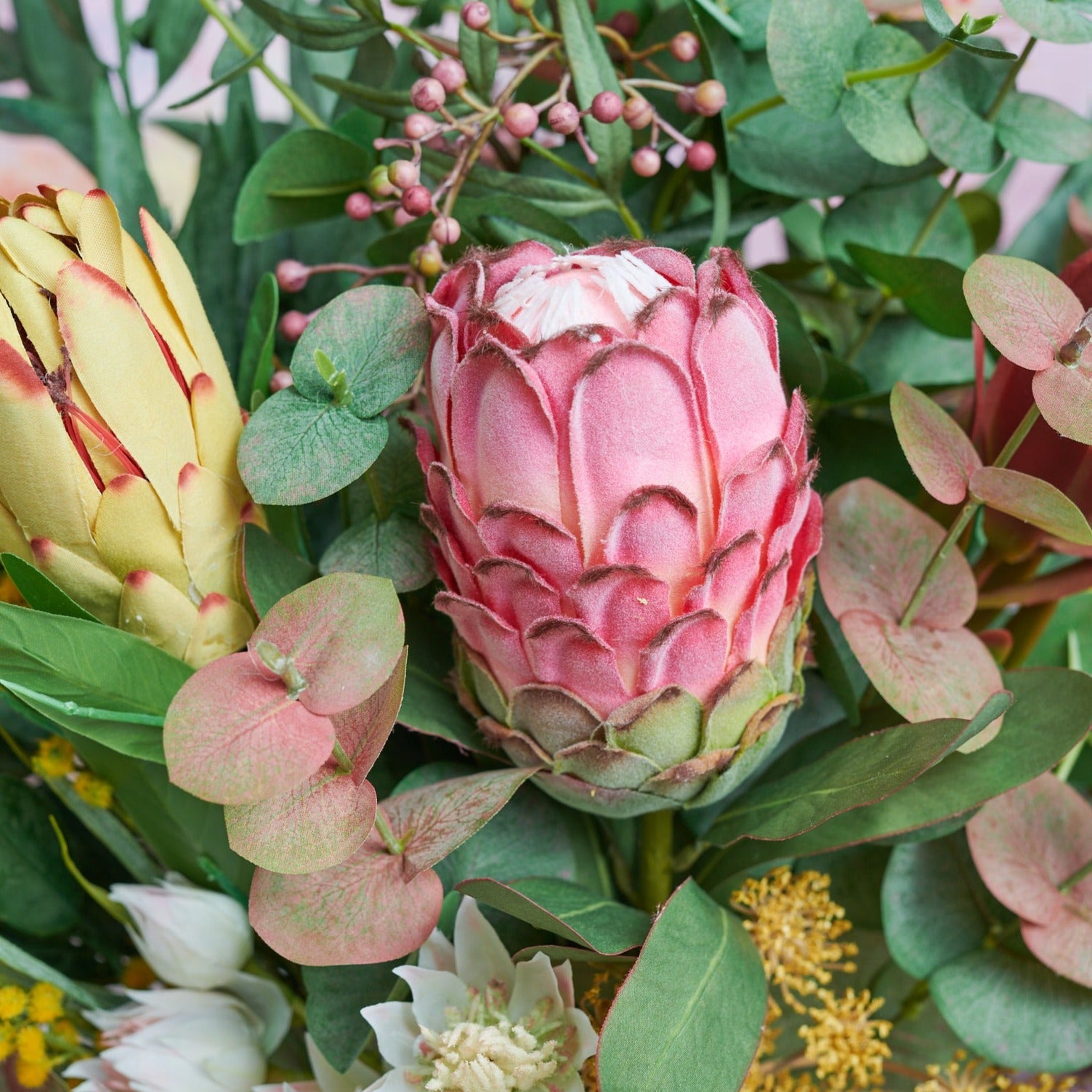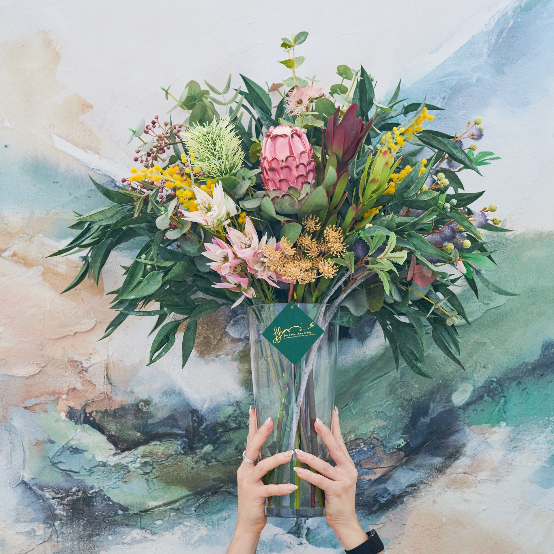 Real Touch Australian Native Proteas, Wattle, Gum nuts, Sea Holly, Peppercorn, Eucalyptus Gum Leaves, Leucadendron, Queen Anne Lace Spray in vase set in Artificial Water.