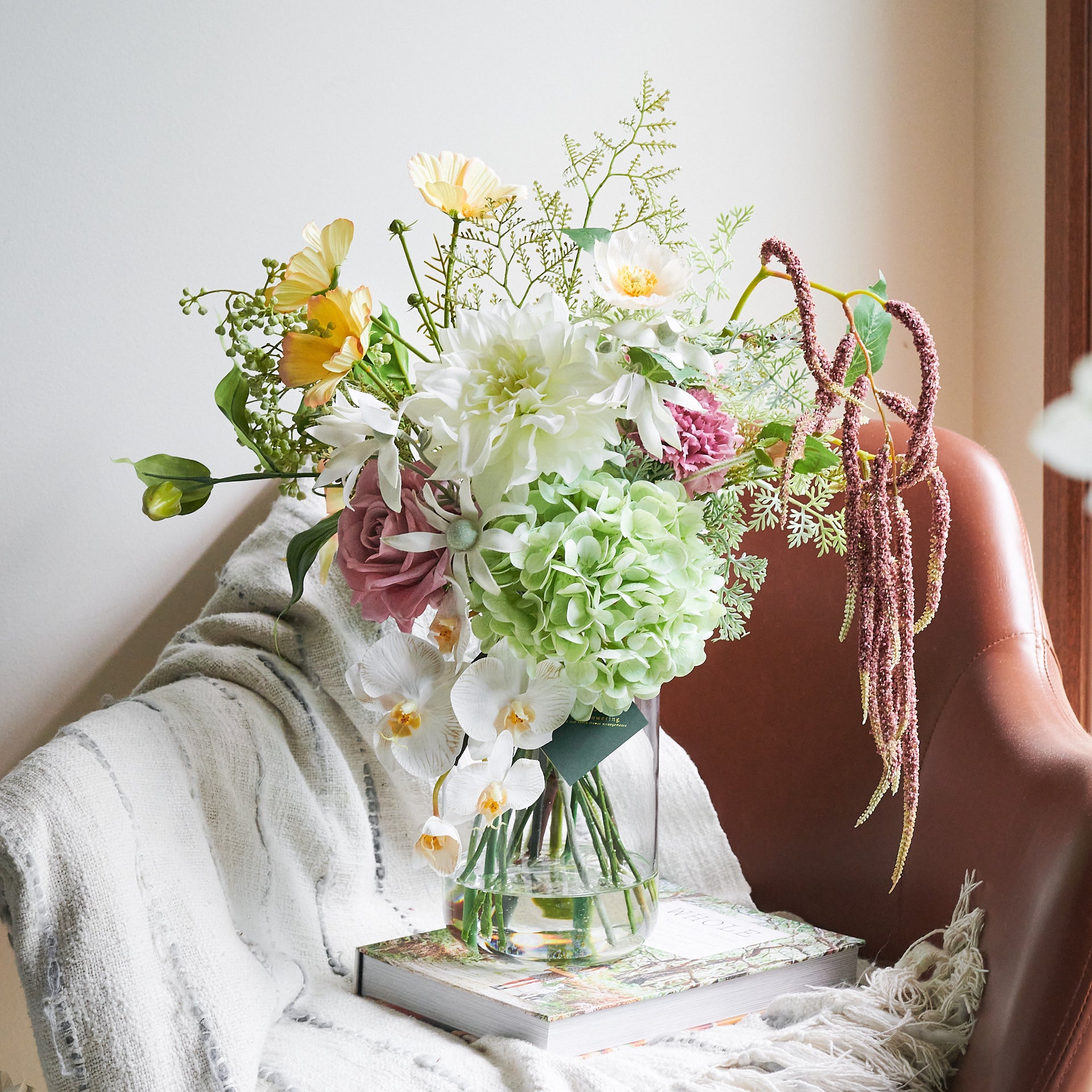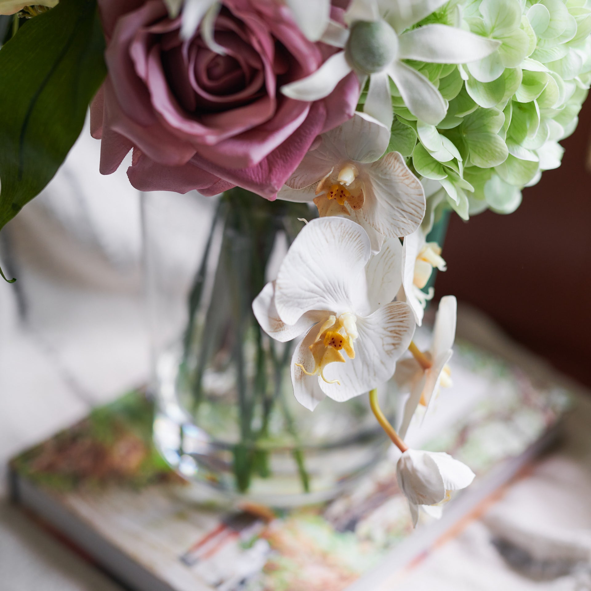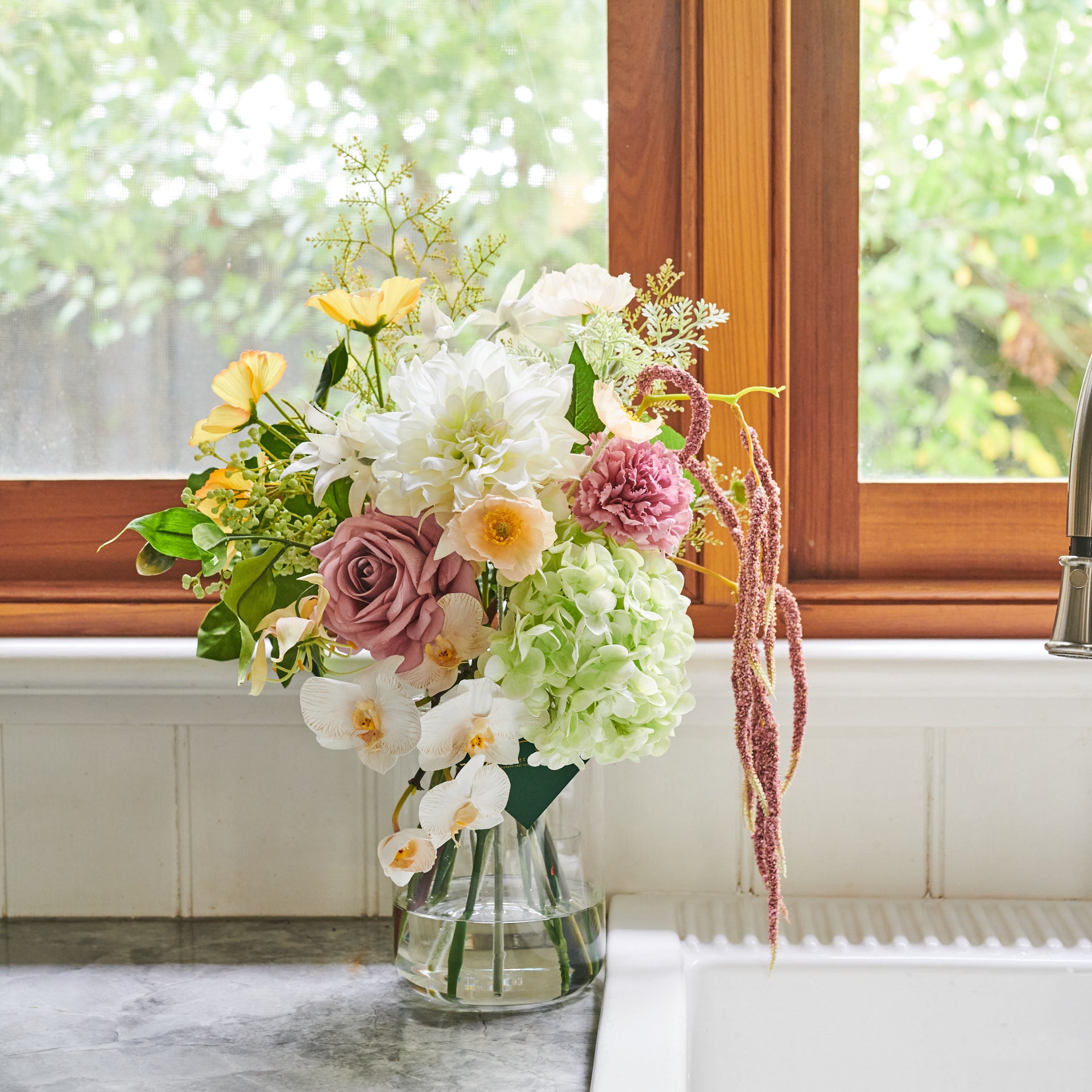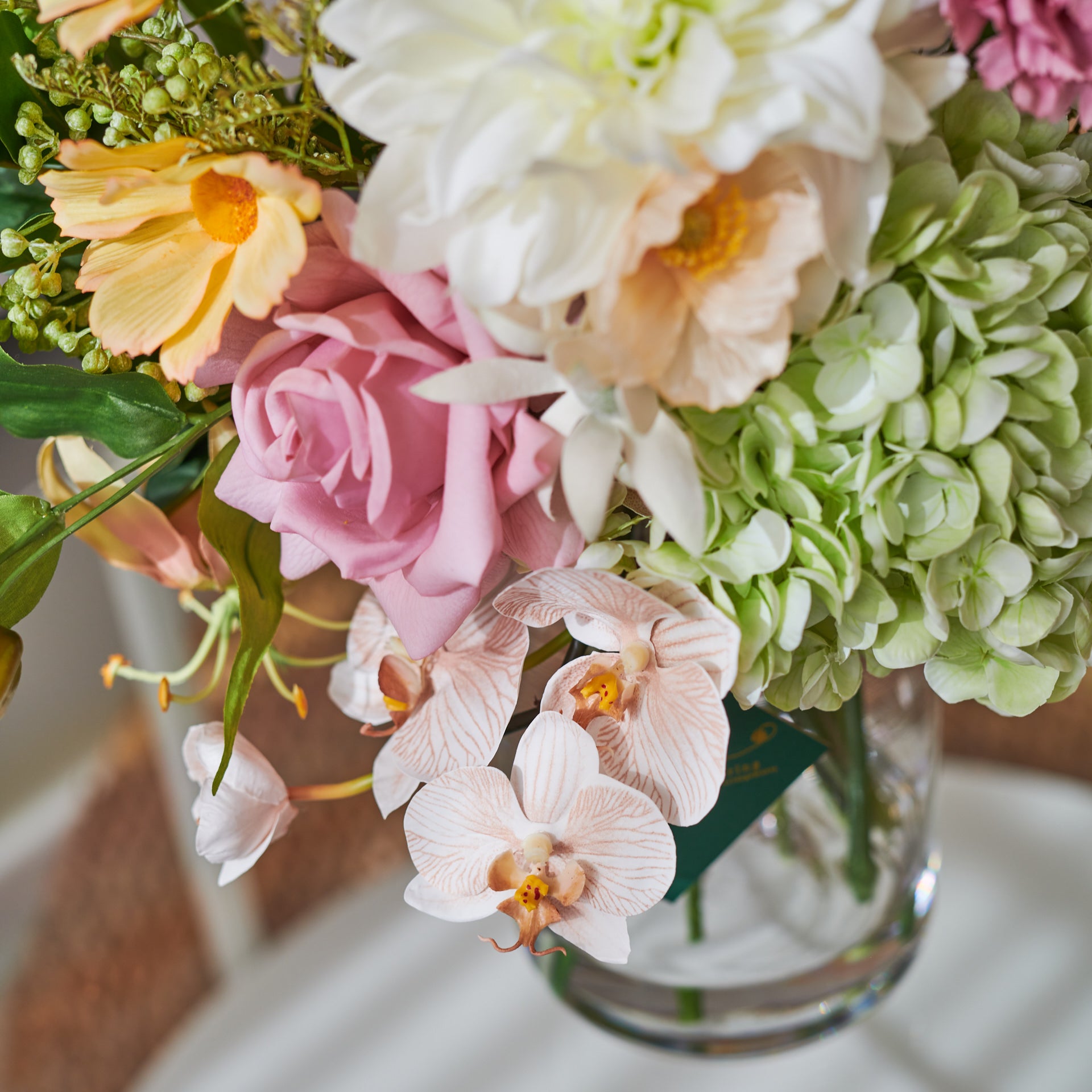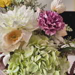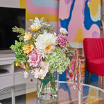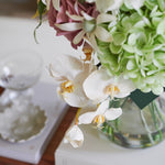 Real Touch Hydrangea, Dahlia and Orchid with Cosmo, Poppy, Limonium, Seed and Amaranthus. Set in a Glass Vase and Artificial Water.