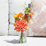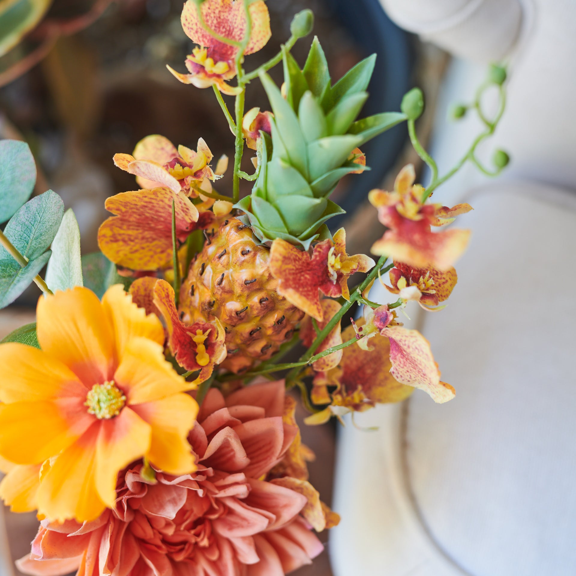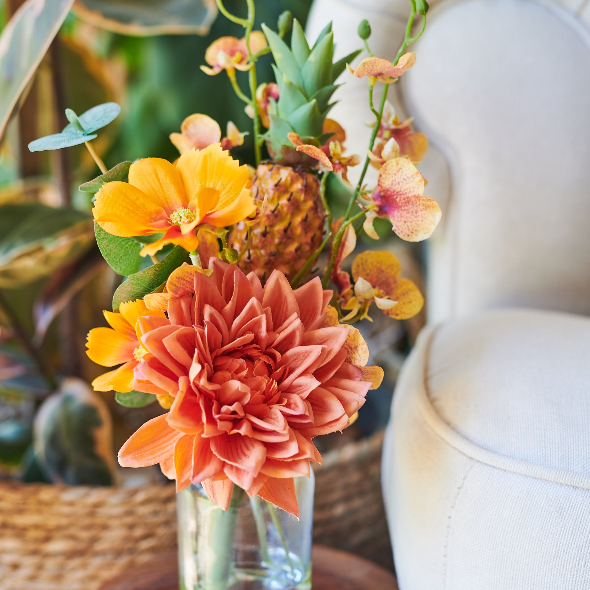 Real Touch Dahlia with Pineapple, Dancing Orchid and Cosmo set in Glass Vase in Artificial Water.