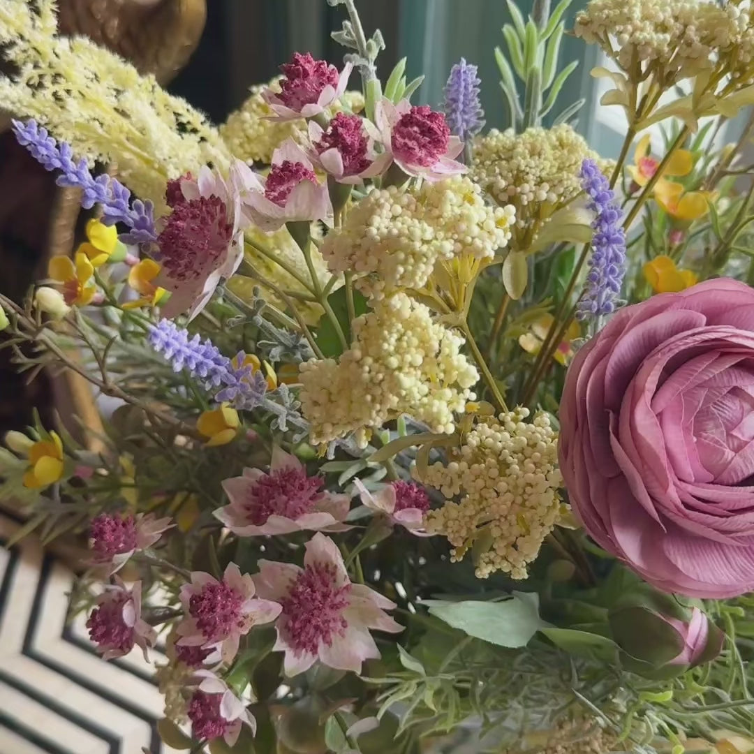 Real Touch Ranunculus, Queen Annes Lace, Astrantia, Carnation, Flannel Flower, Wax Flower and Lavender Bush in a Rectangle Vase with Artificial Water. This is a 360-degree flower arrangement.