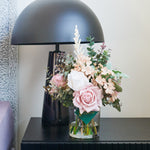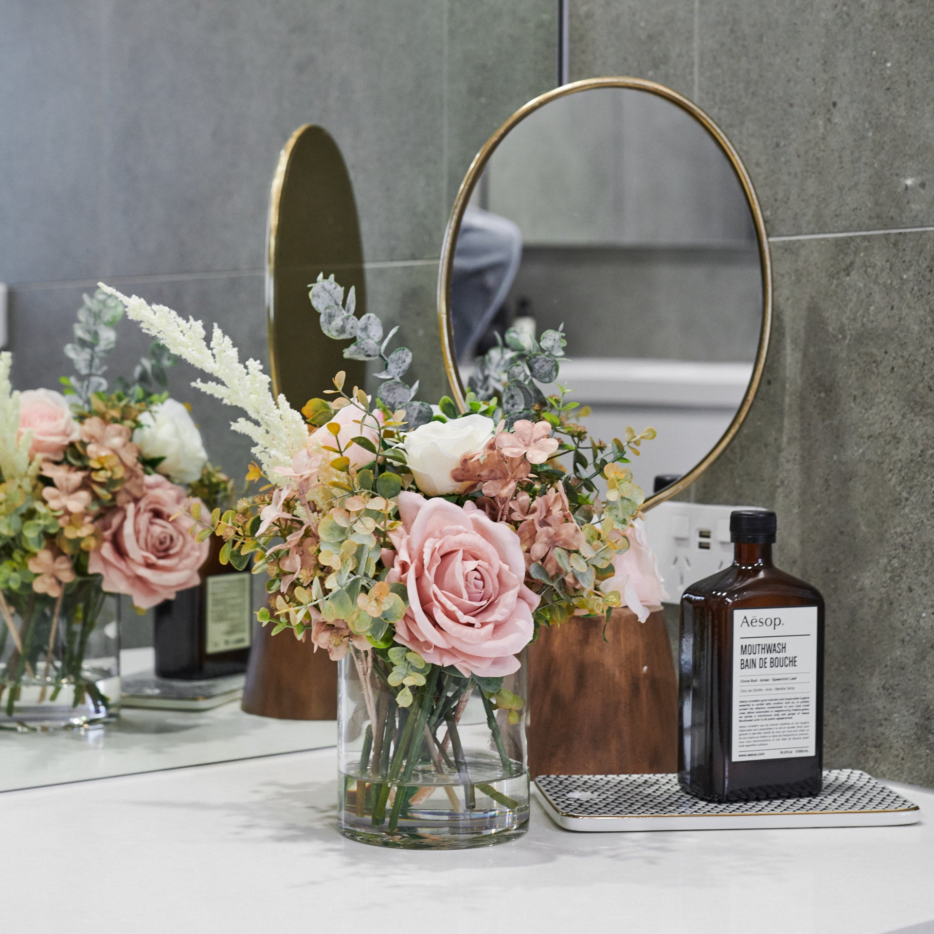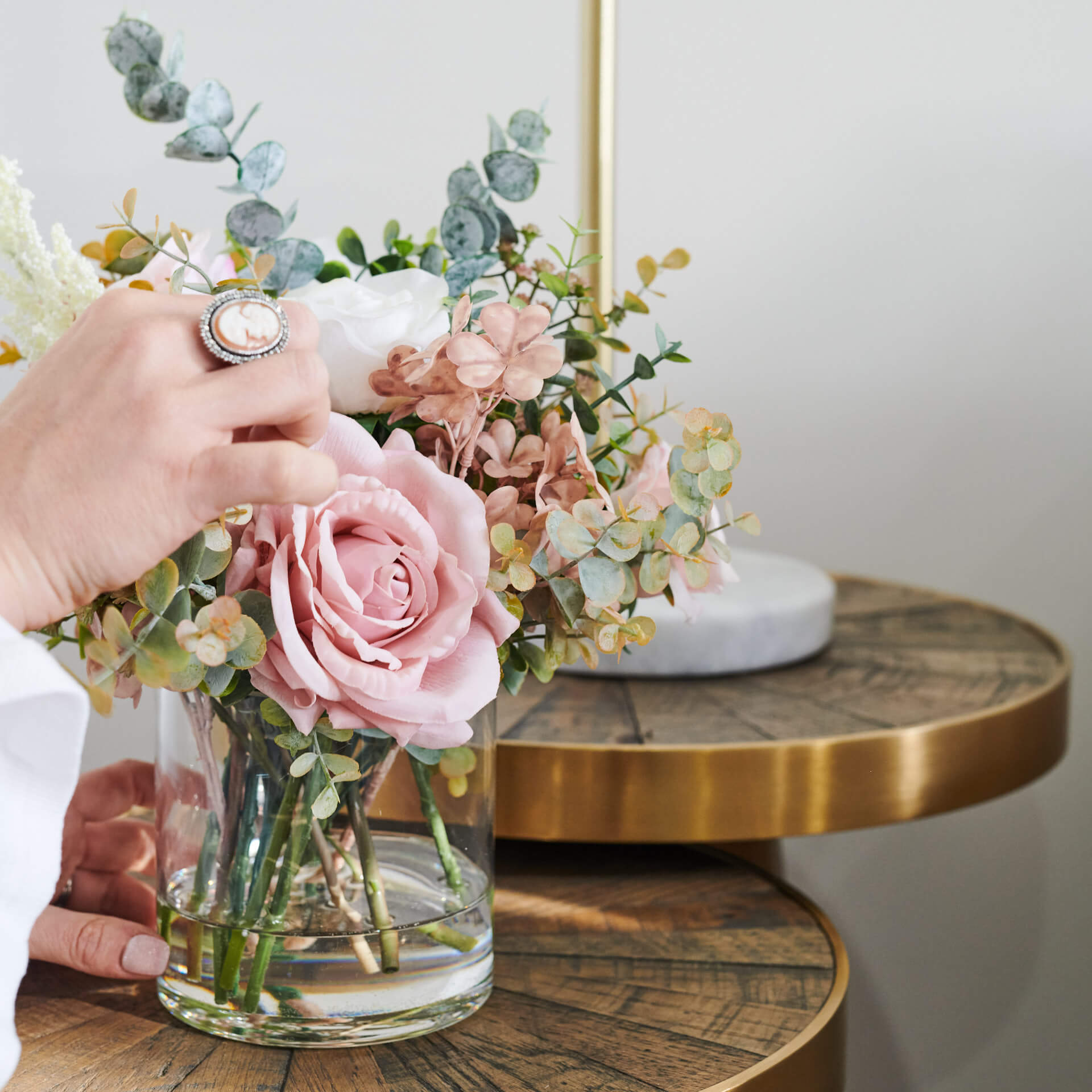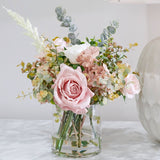 Real Touch Clover Spray, Spinning Gum Leaf, Astilbe, Mini Gum Eucalyptus Spray, Roses, Babys Breath and Dusty Miller in a Cylinder Vase and Artificial Water. This is a 360-degree flower arrangement.