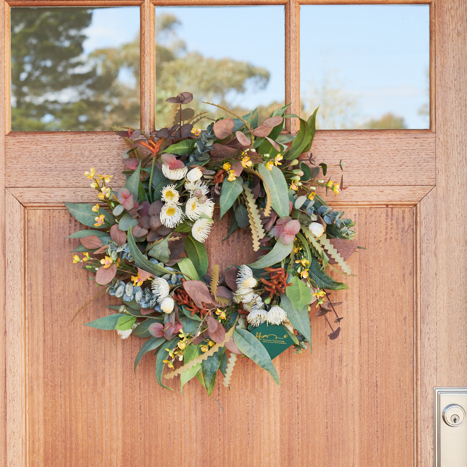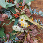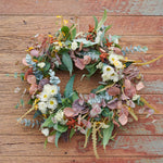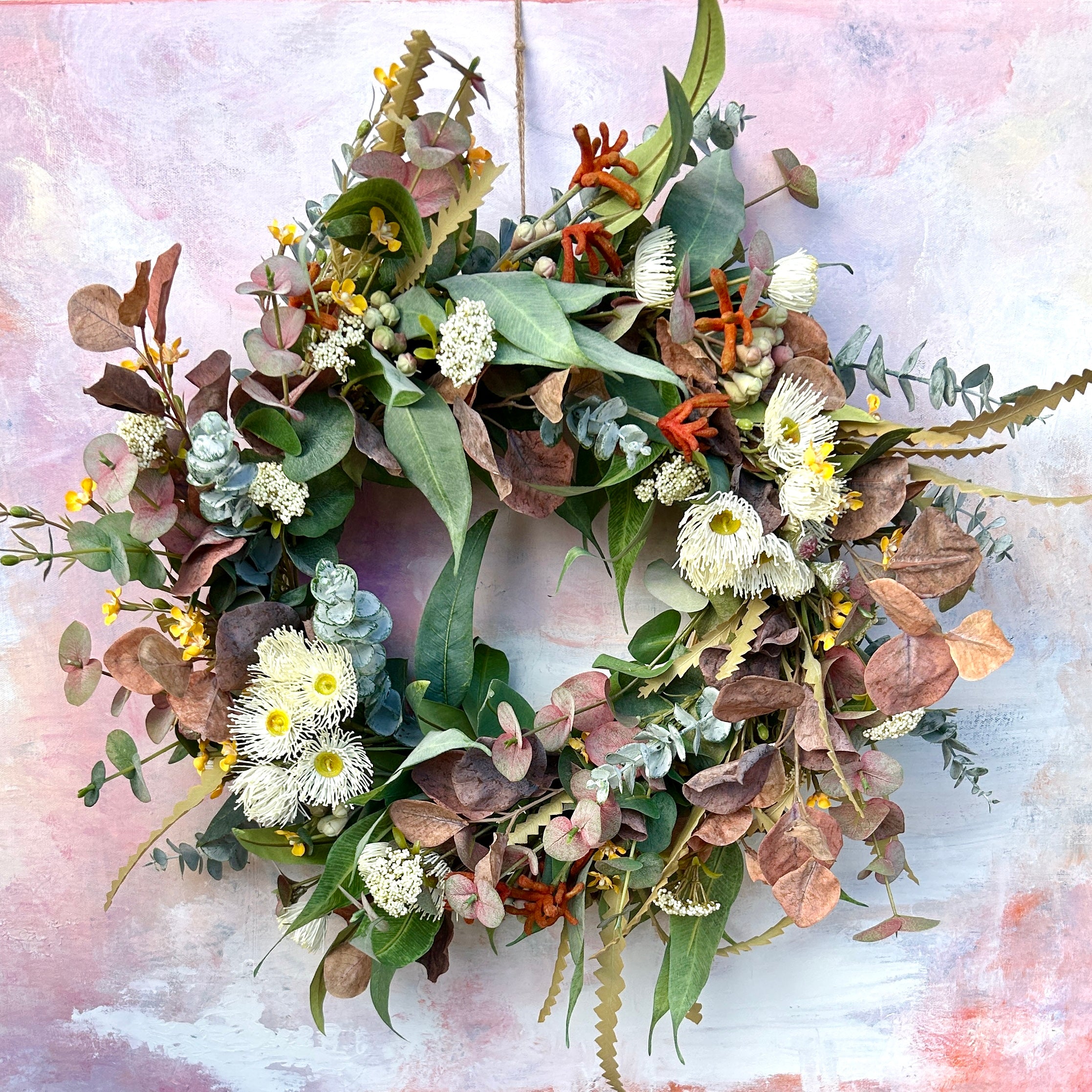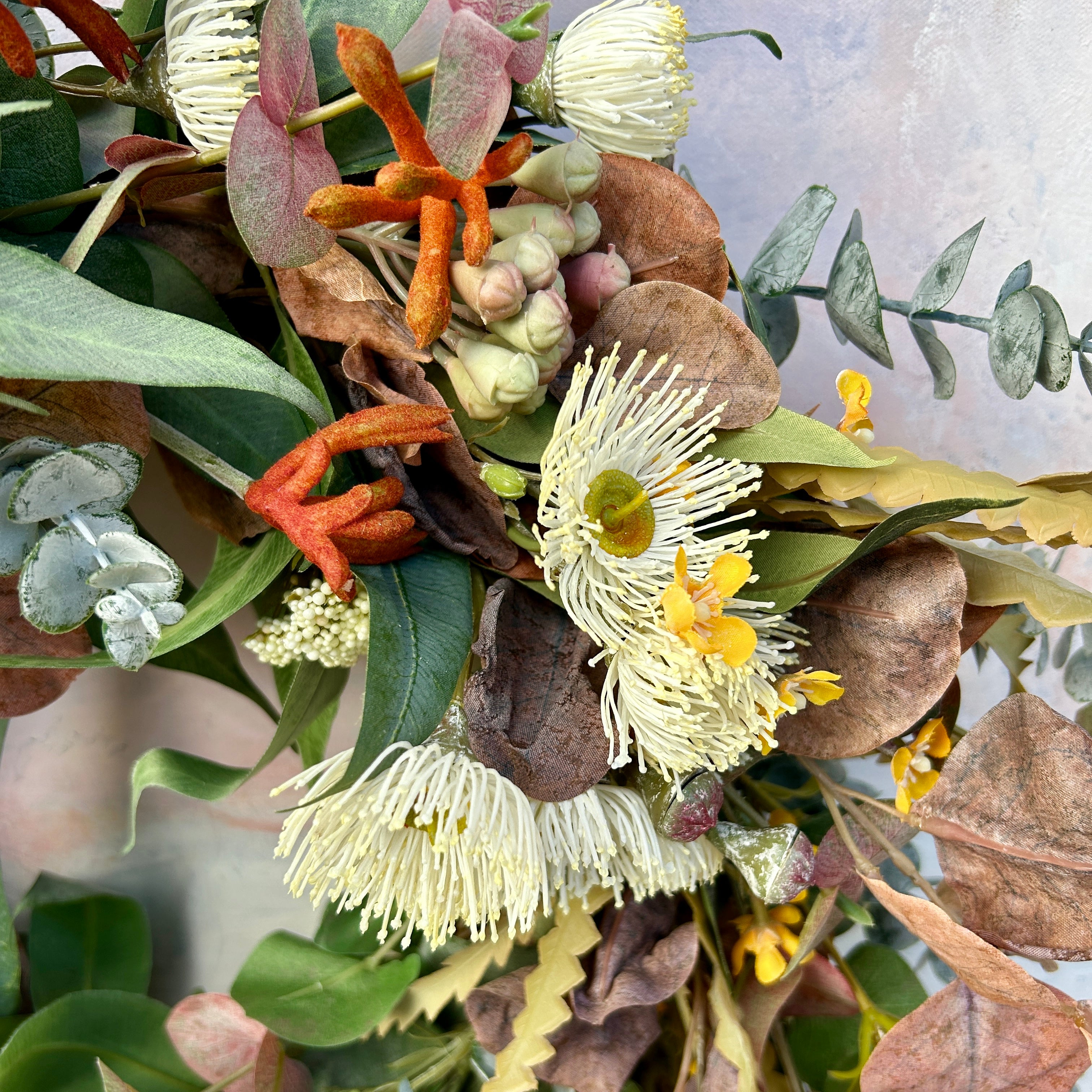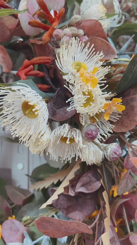Handmade Wreath for Christmas or all year round! Made with a combination of Real Touch Eucalyptus, Blossom, Seeded Gum, Spinning Gum, Queen Annes Lace, Kangaroo Paw and Wax Flower.