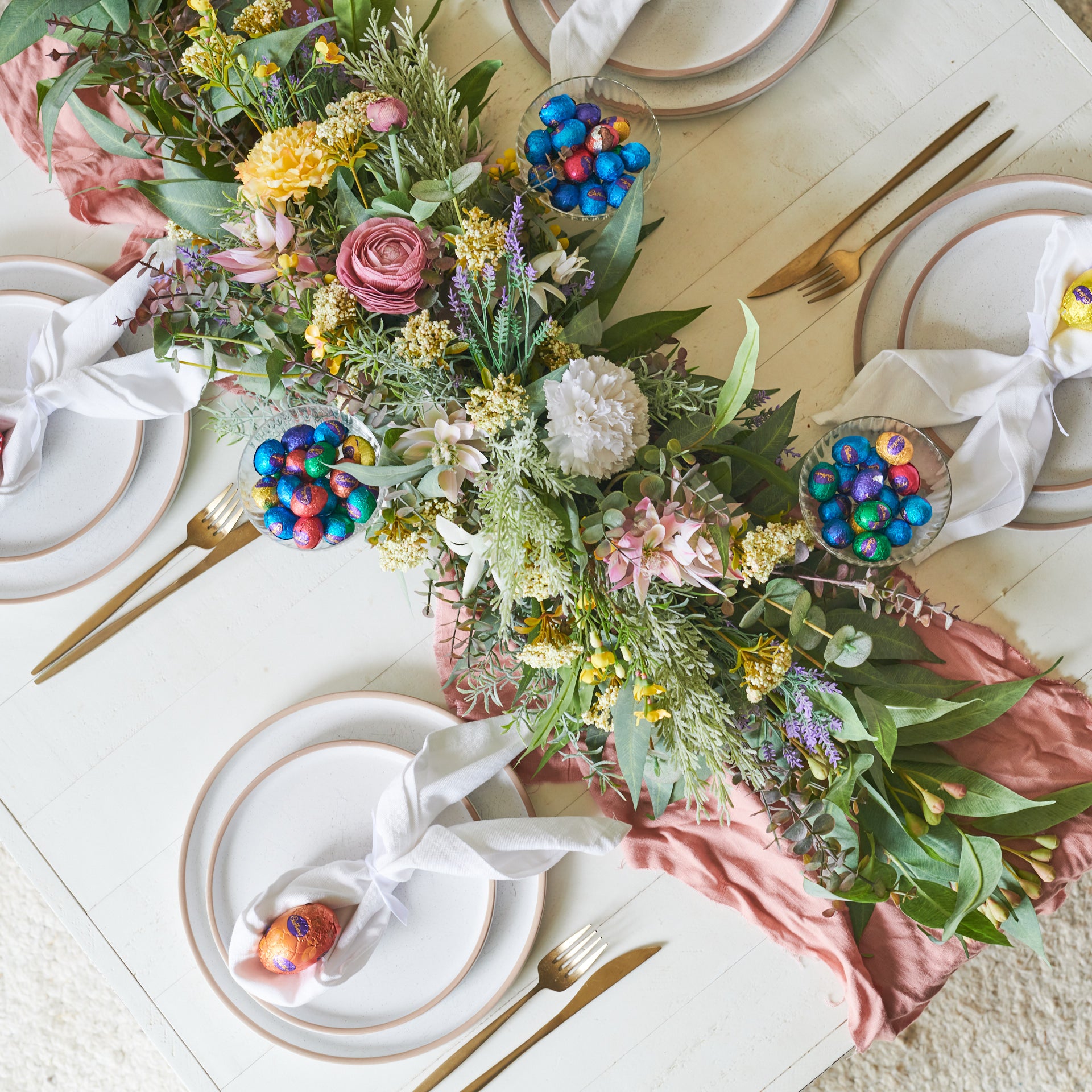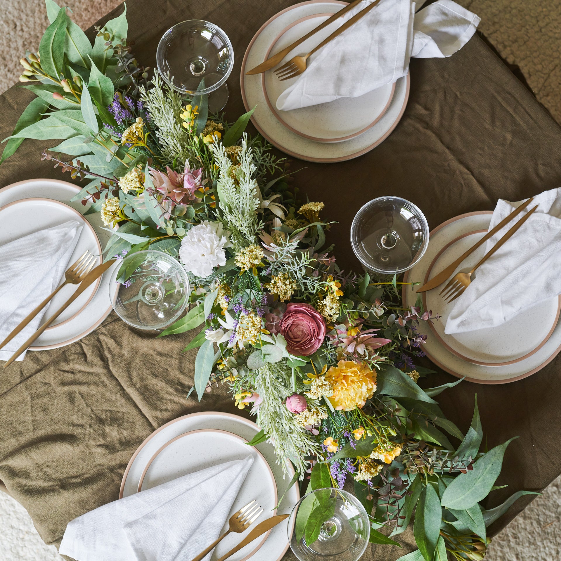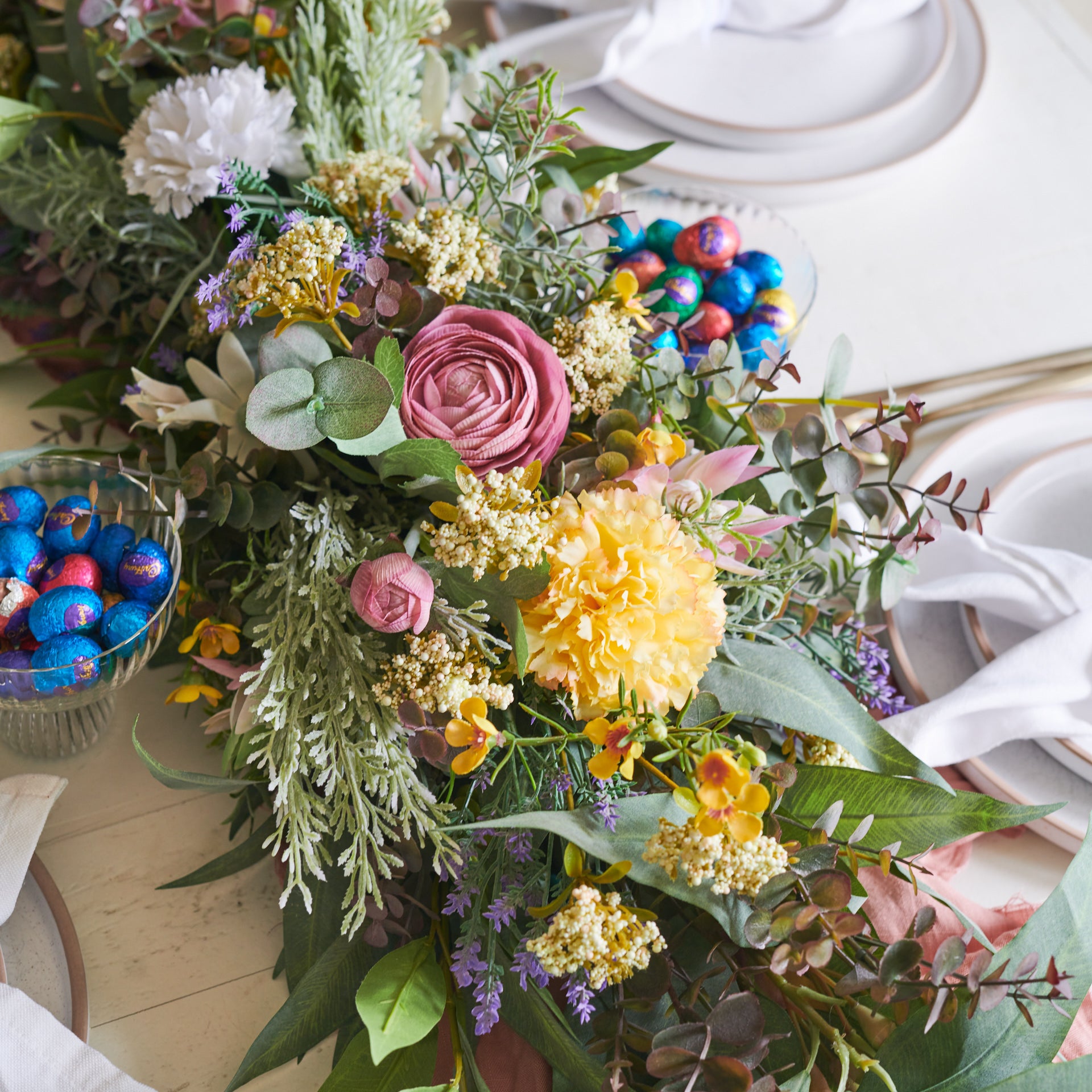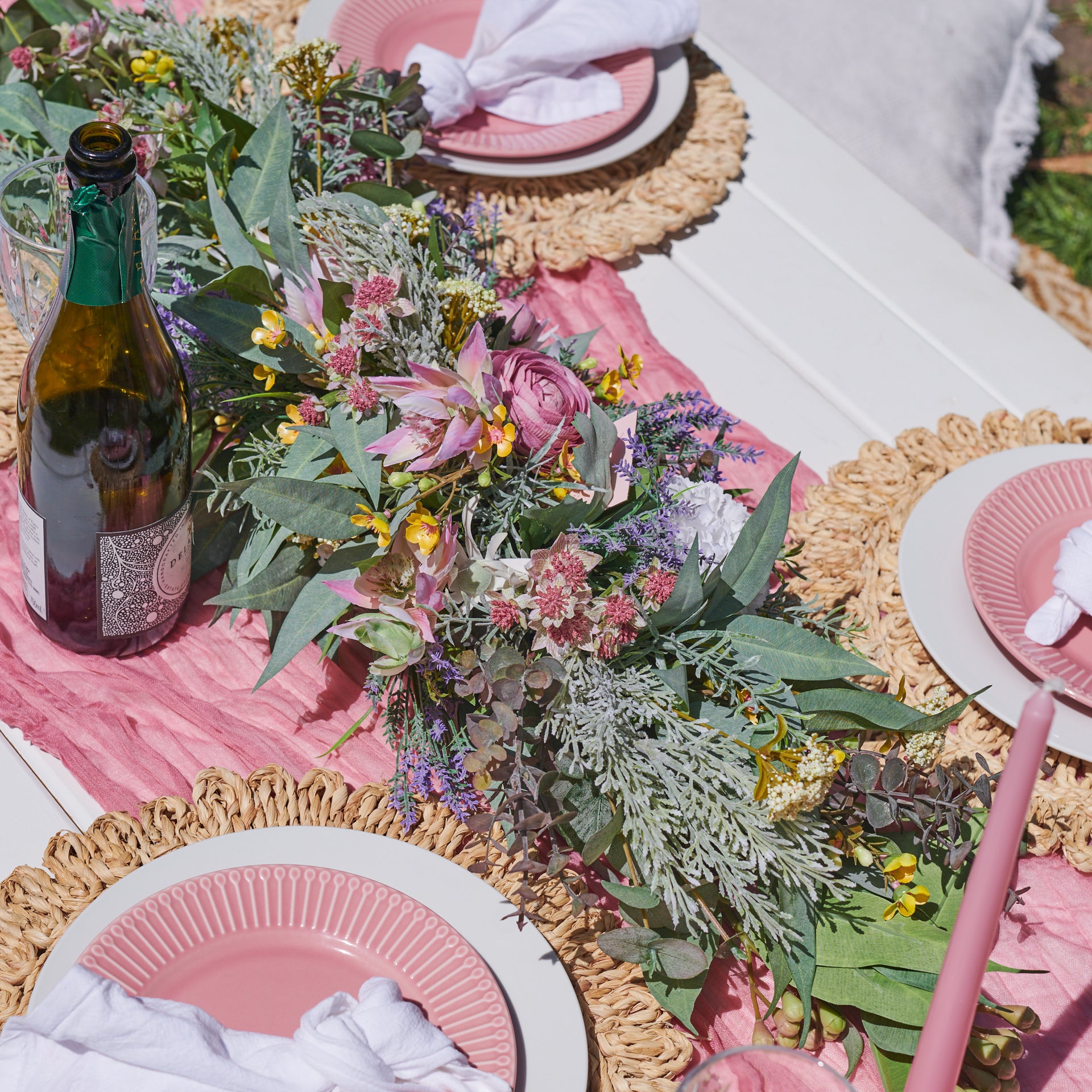 Handmade Table Garland of Ranunculus, Carnation, Eucalyptus, Blushing Bride, Queen Annes Lace, Lavender and Wax Flower