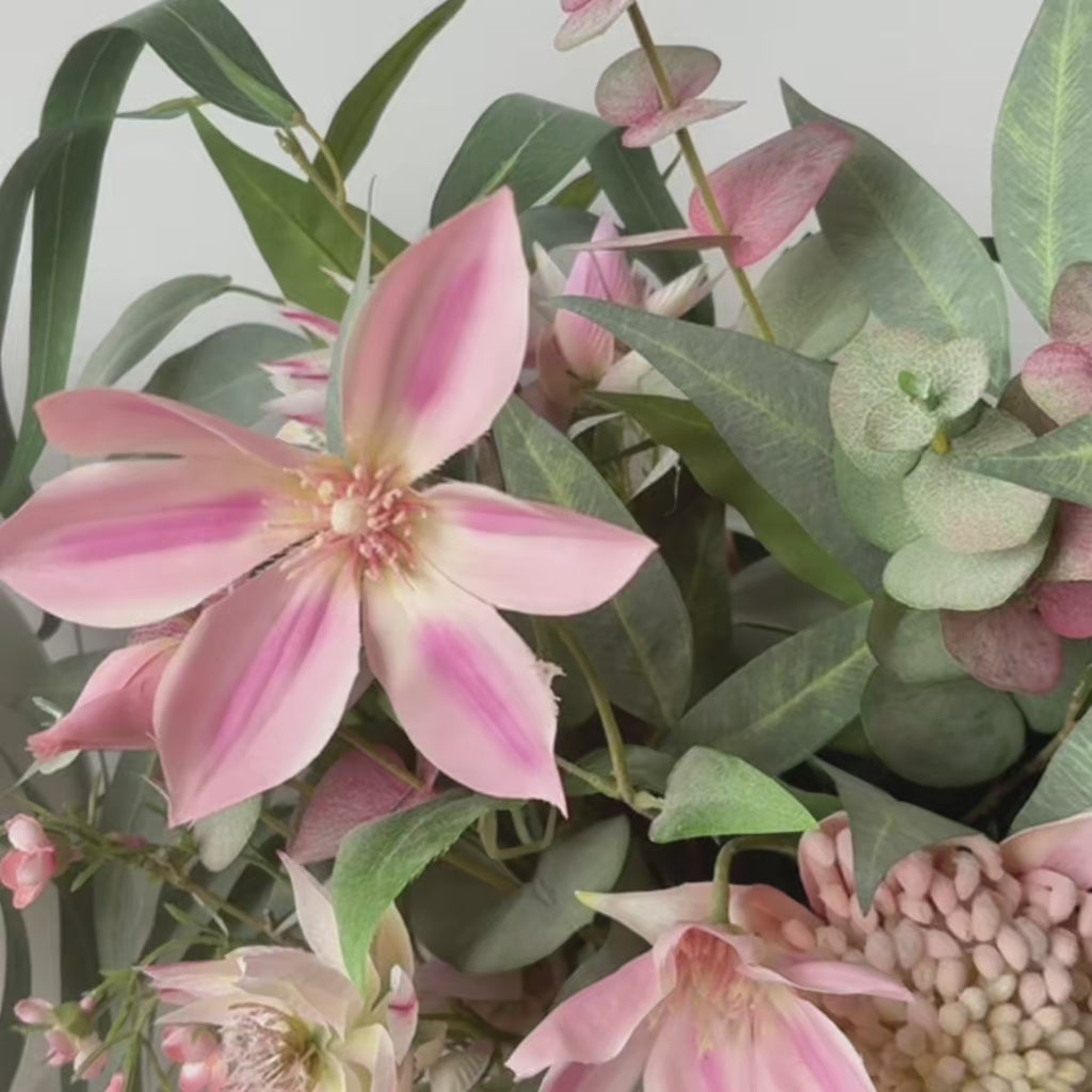 Real Touch Artificial Waratah, Clematis and Eucalyptus Leaves with Wax Flower and Blushing Bride set in Rectangle Vase with Artificial Water. 360 degree flower arrangement