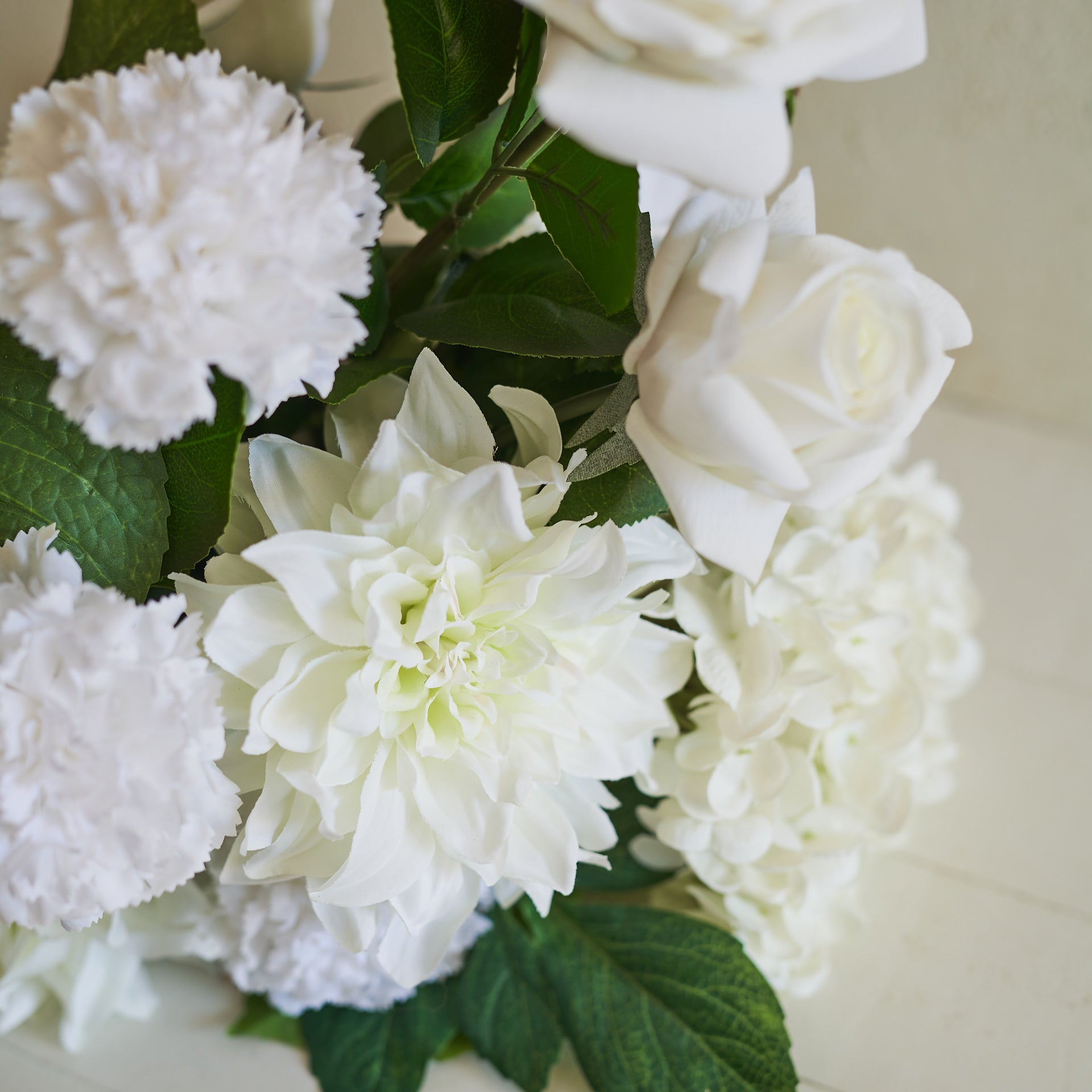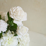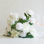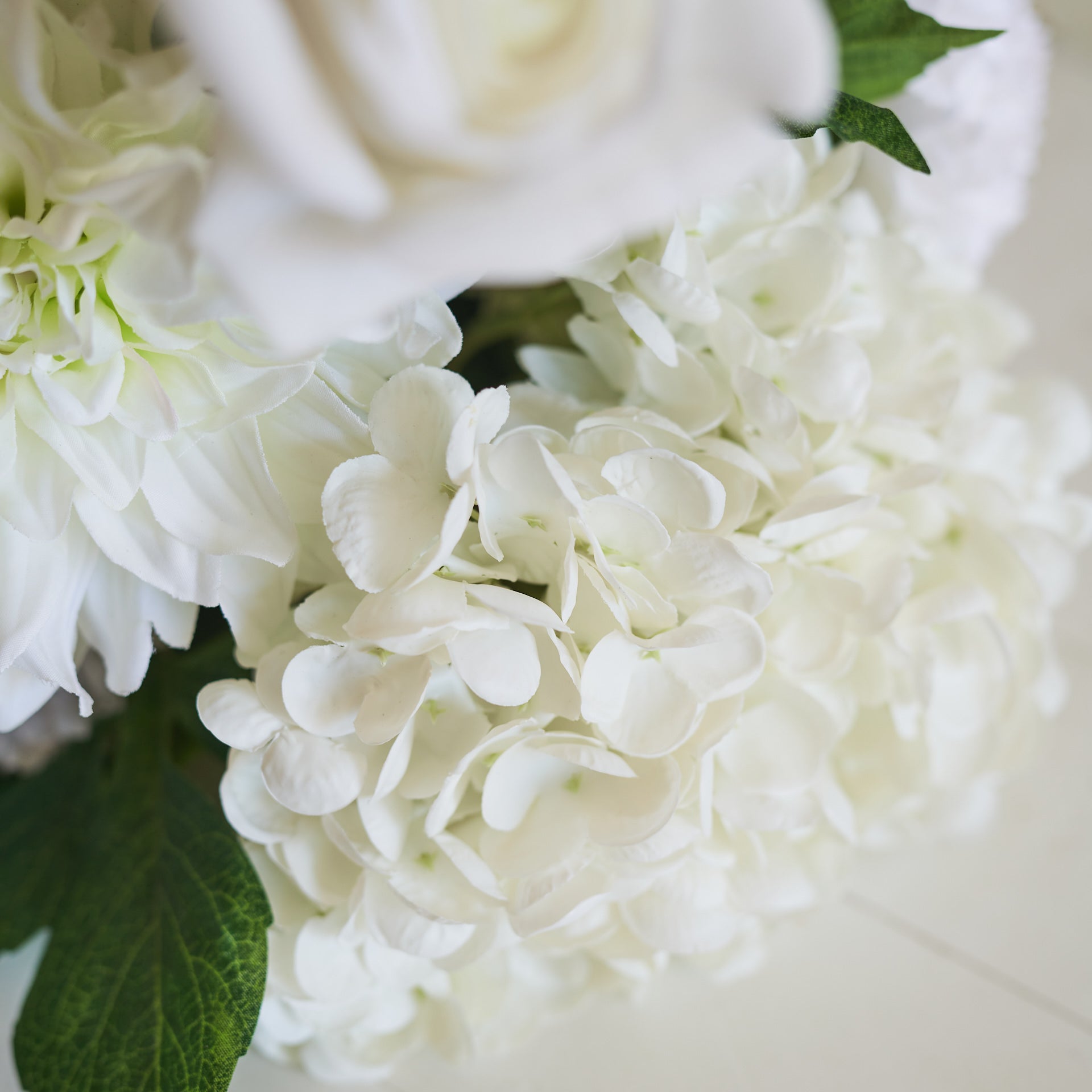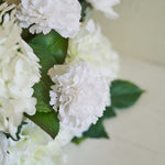 Real Touch Hydrangea, Dahlias, Carnations and Roses set in a foam base designed as table decor.