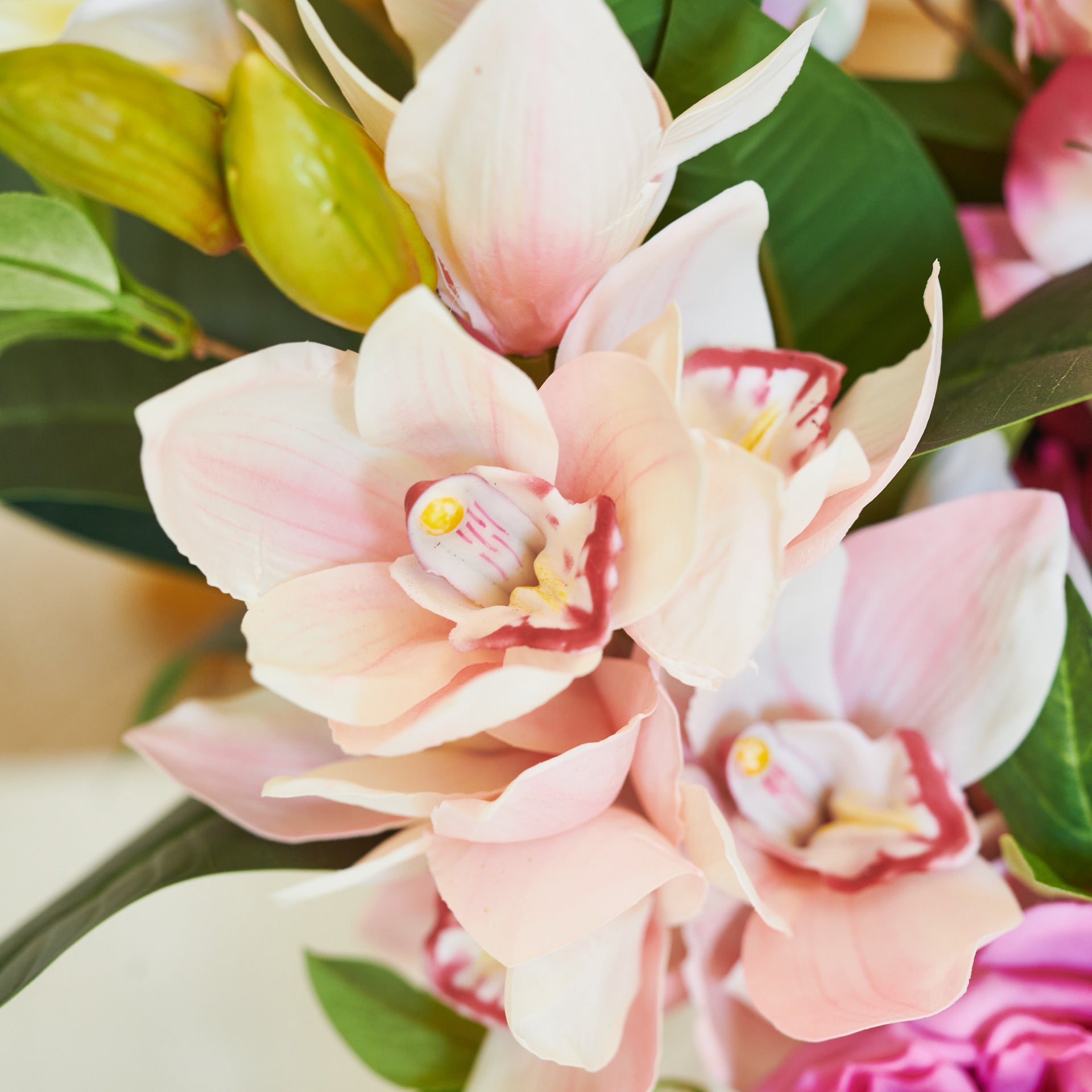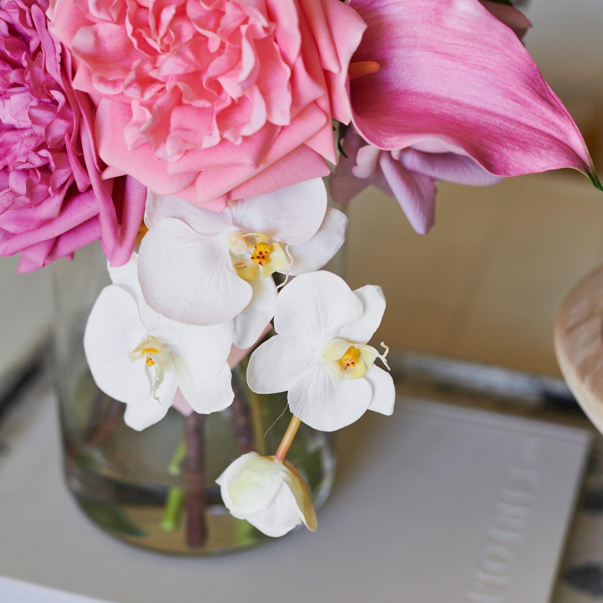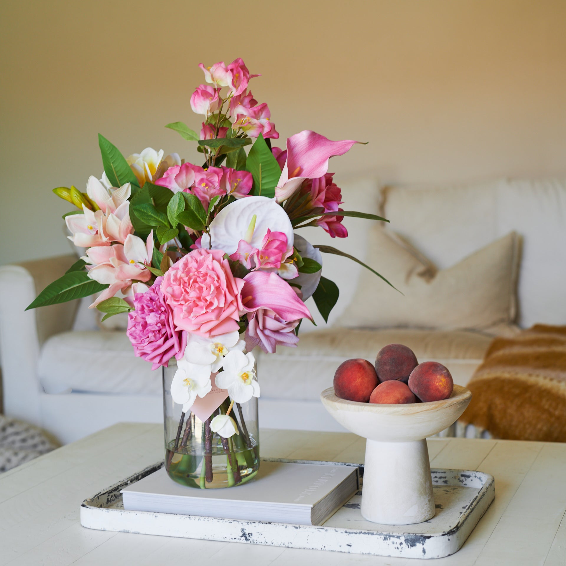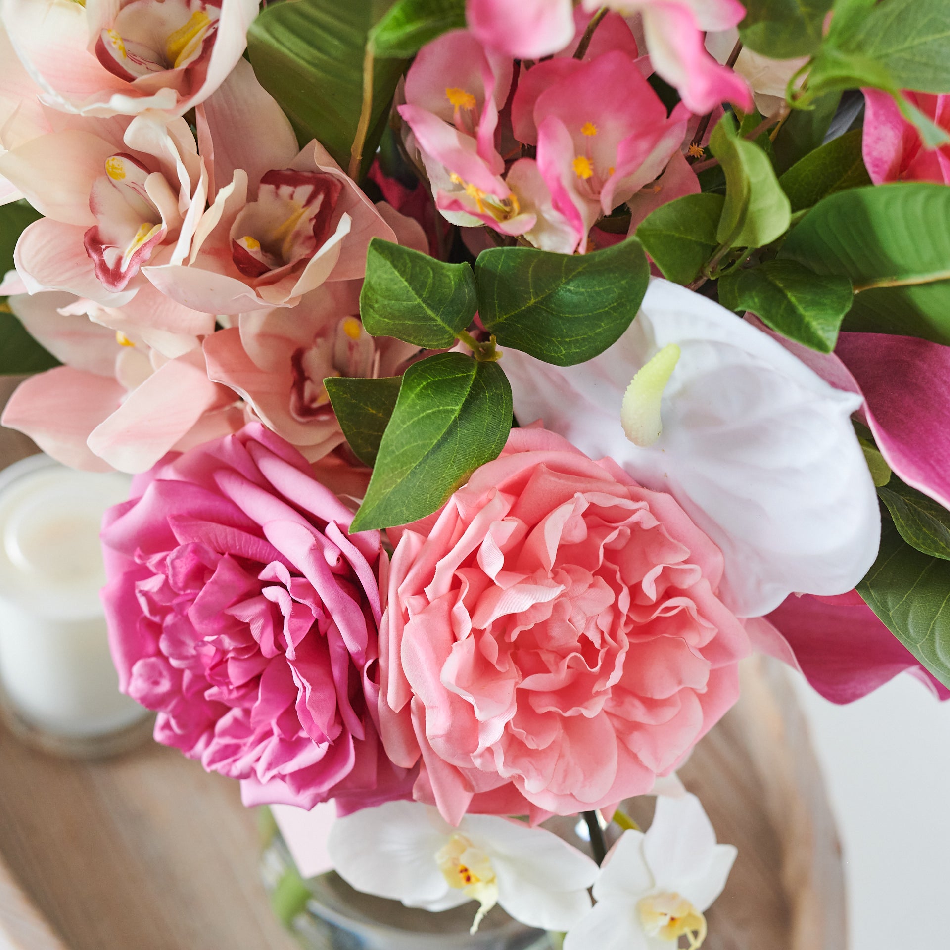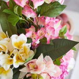 Real Touch Frangipani, Lily and Orchid's, with Anthurium and Bougainvillea. Set in a Glass Vase and Artificial Water.