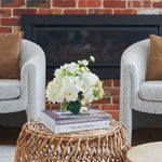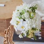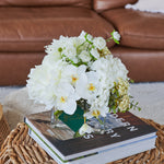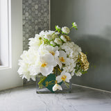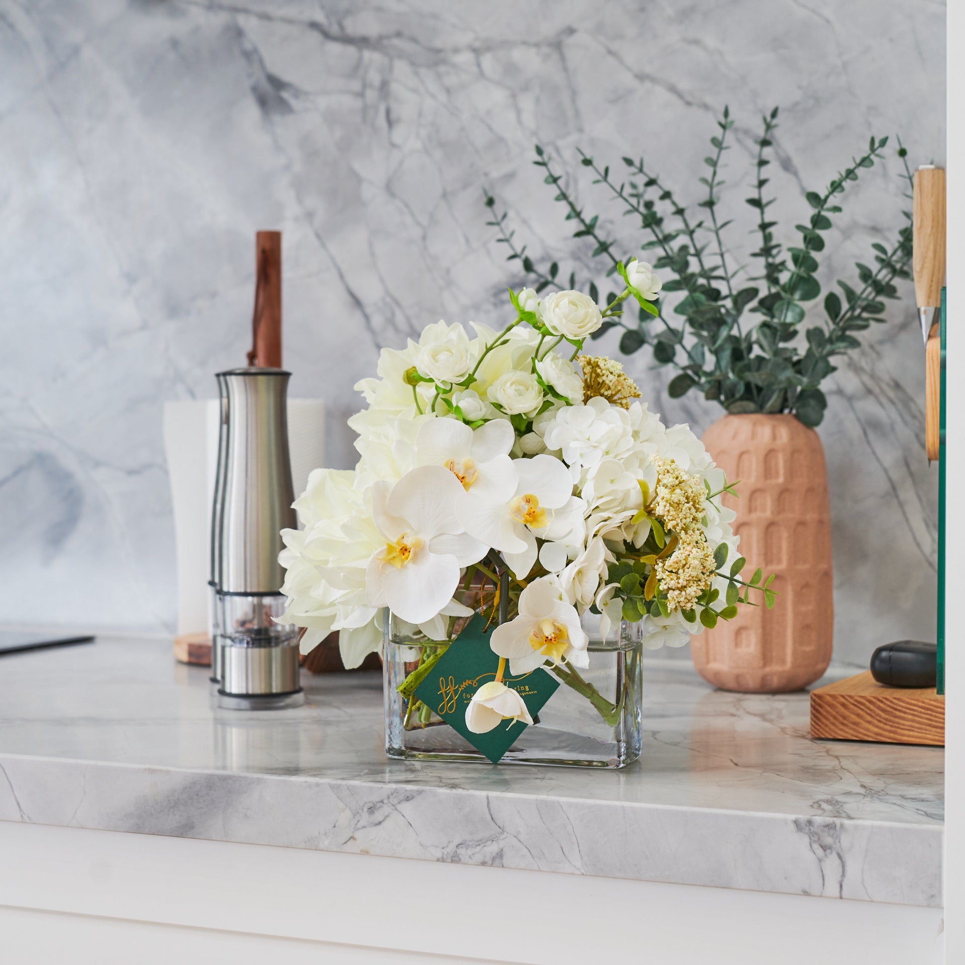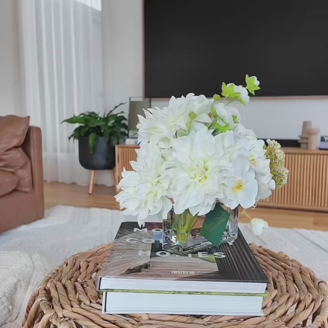 Real Touch Phalaenopsis Orchid, Dahlias, Ranunculus, Hydrangea and Queen Anne’s Lace in a rectangle vase. Flowers are permanently set in an artificial water. This is a 360-degree arrangement.