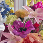A colourful arrangement including Real Touch Clematis, Austin Rose and Snowball with Billy Buttons, Larkspur, Carnation, Enki Leaf and Bougainvillea set in a Glass Vase in Artificial Water