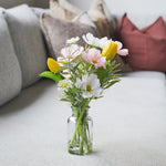 Real Touch Cosmo and Tulips with Acacia leaf and Wildflower set in Glass Vase and Artificial Water. This is a 360 degree flower arrangement.