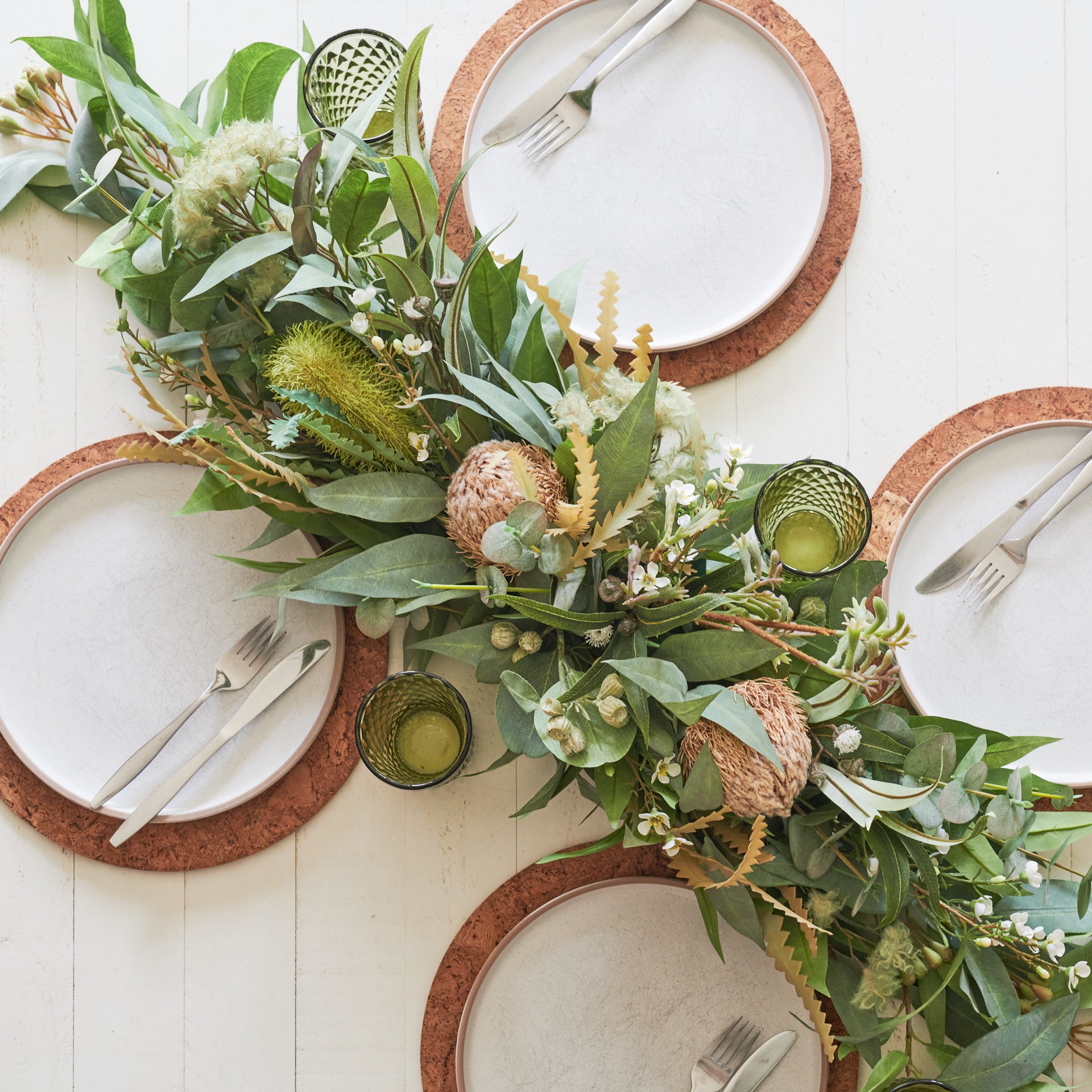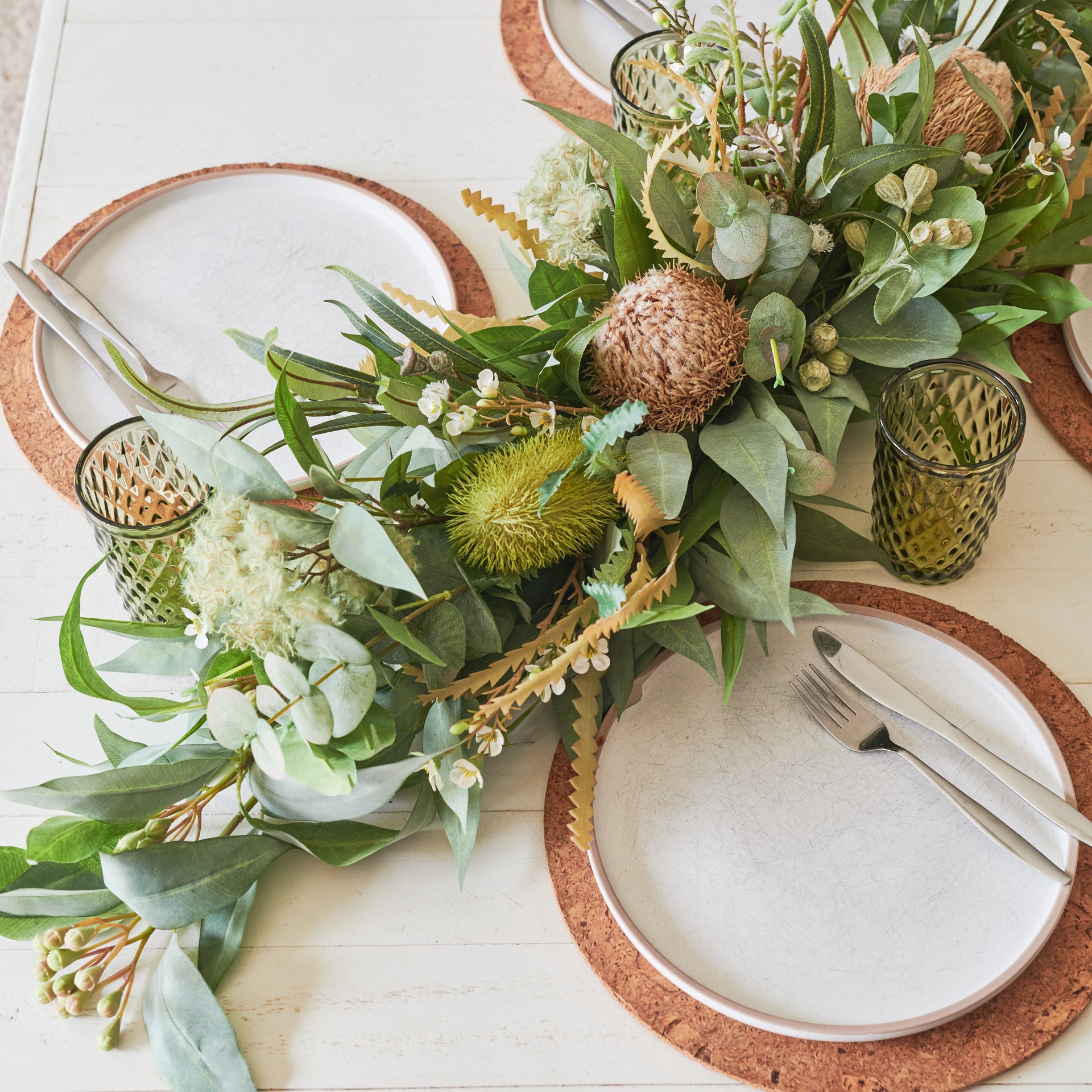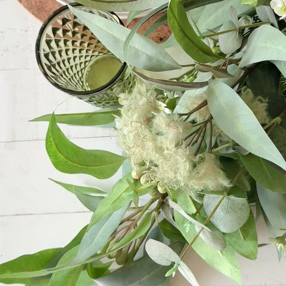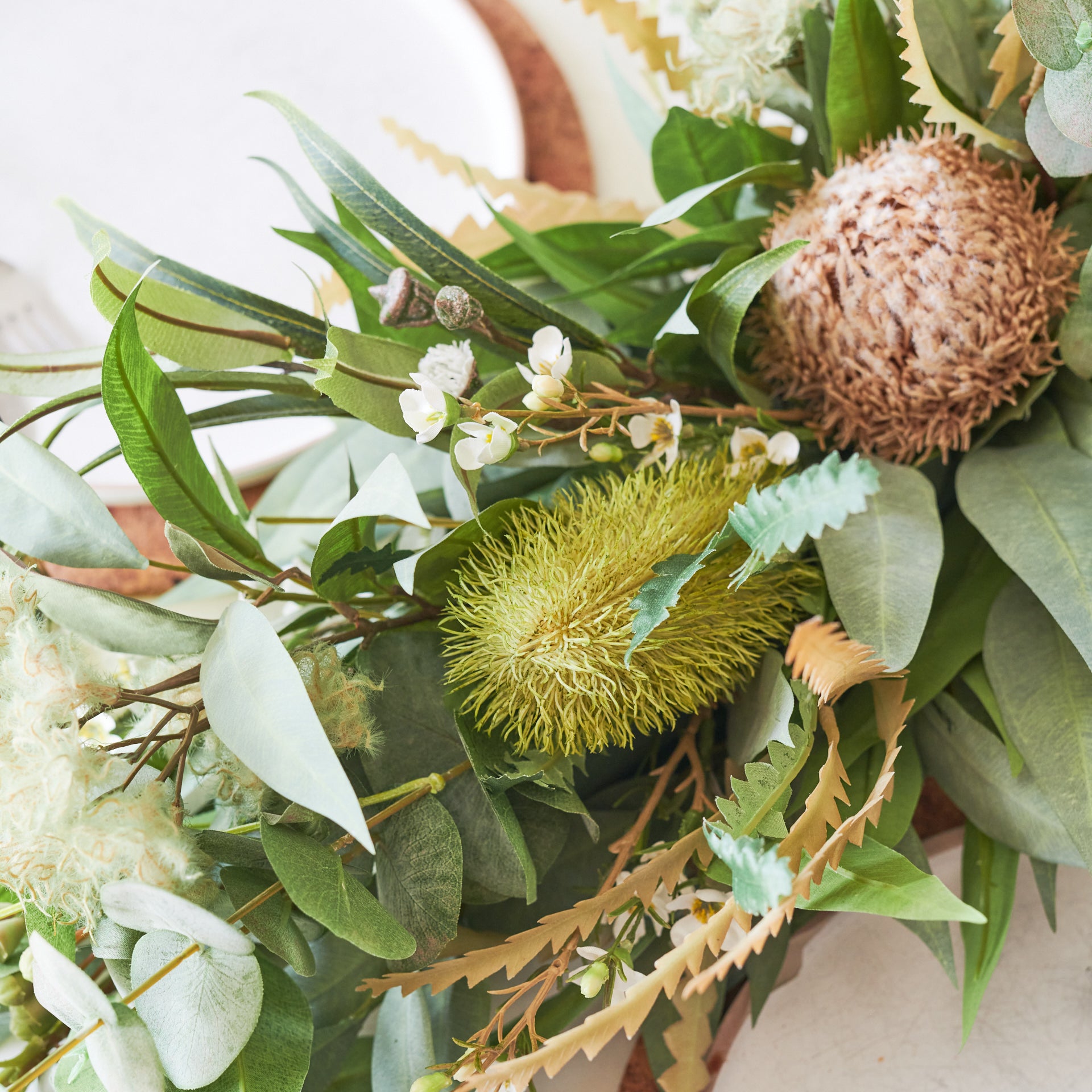 Handmade Garland featuring a realistic combination of Real Touch Australian Natives including Eucalyptus and Gum Nuts, Smoke Bush, Banksias, Kangaroo Paw and Wax Flower.