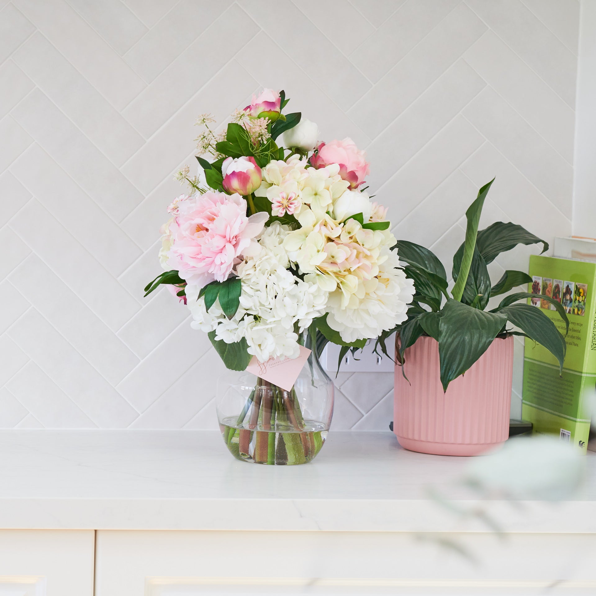 An abundant mix of Peony Roses and Hydrangea, accented with delicate Queen Annes Lace and Mini Cosmo set in Glass Vase in Artificial Water.