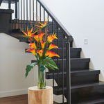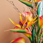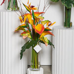 Mix of Real Touch Calla Lilies, Birds of Paradise flowers, Twig Branches and Calla Leaves in a cylinder vase permanently set in an artificial water.