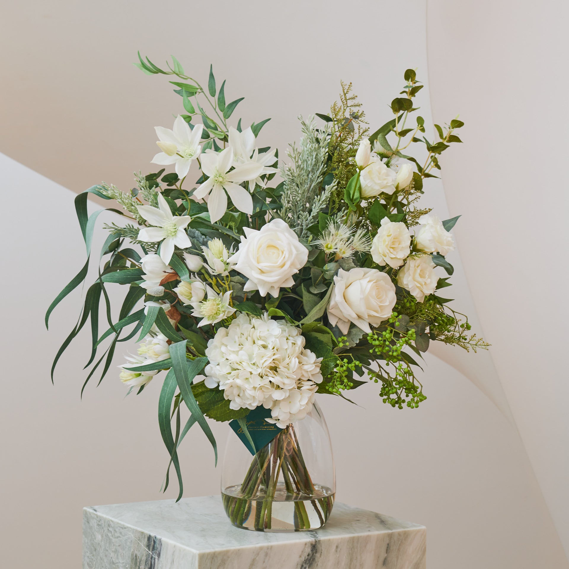 A timeless statement piece featuring Real Touch Eucalyptus, Blossom, Hydrangea, Clematis and Lisianthus with Blushing Bride, Dusty Miller, Austin Roses, Seeding Berry and Long Leaf Set in a Belly Vase with Artificial Water.