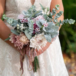 A romantic fusion of soft, feminine tones and Australian native textures, this handcrafted bridal bouquet captures the perfect balance between elegance and earthiness. Designed with lifelike faux blooms and beautifully layered foliage, including classic native eucalyptus, it offers an ethereal, wind-swept feel that’s made to last.