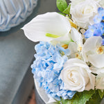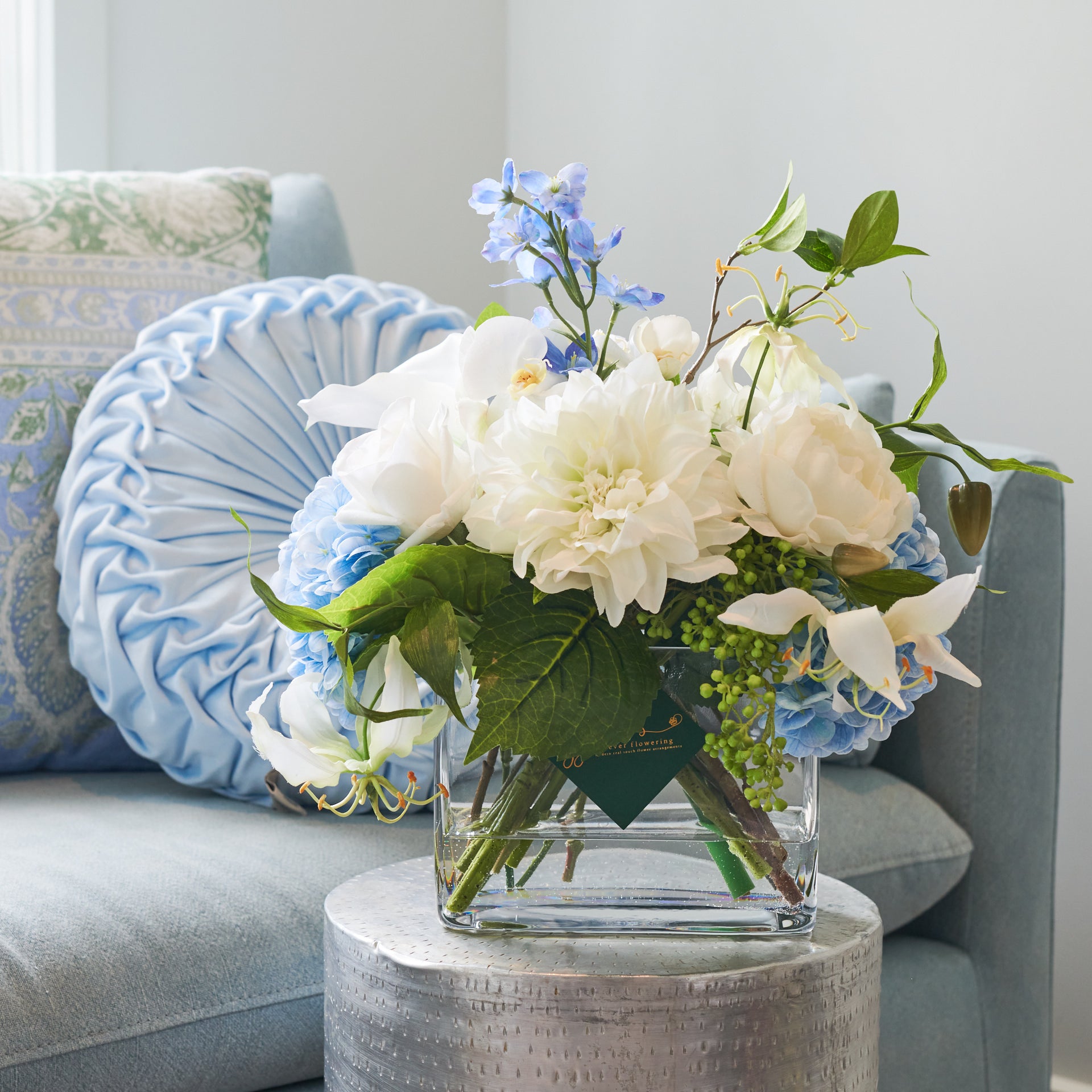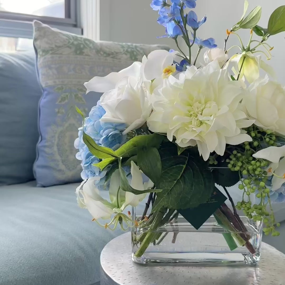 A beautiful 360' floral arrangement with real touch hydrangeas, gloriosa, orchid, frangipani and roses set in a rectangle glass vase in artificial water.