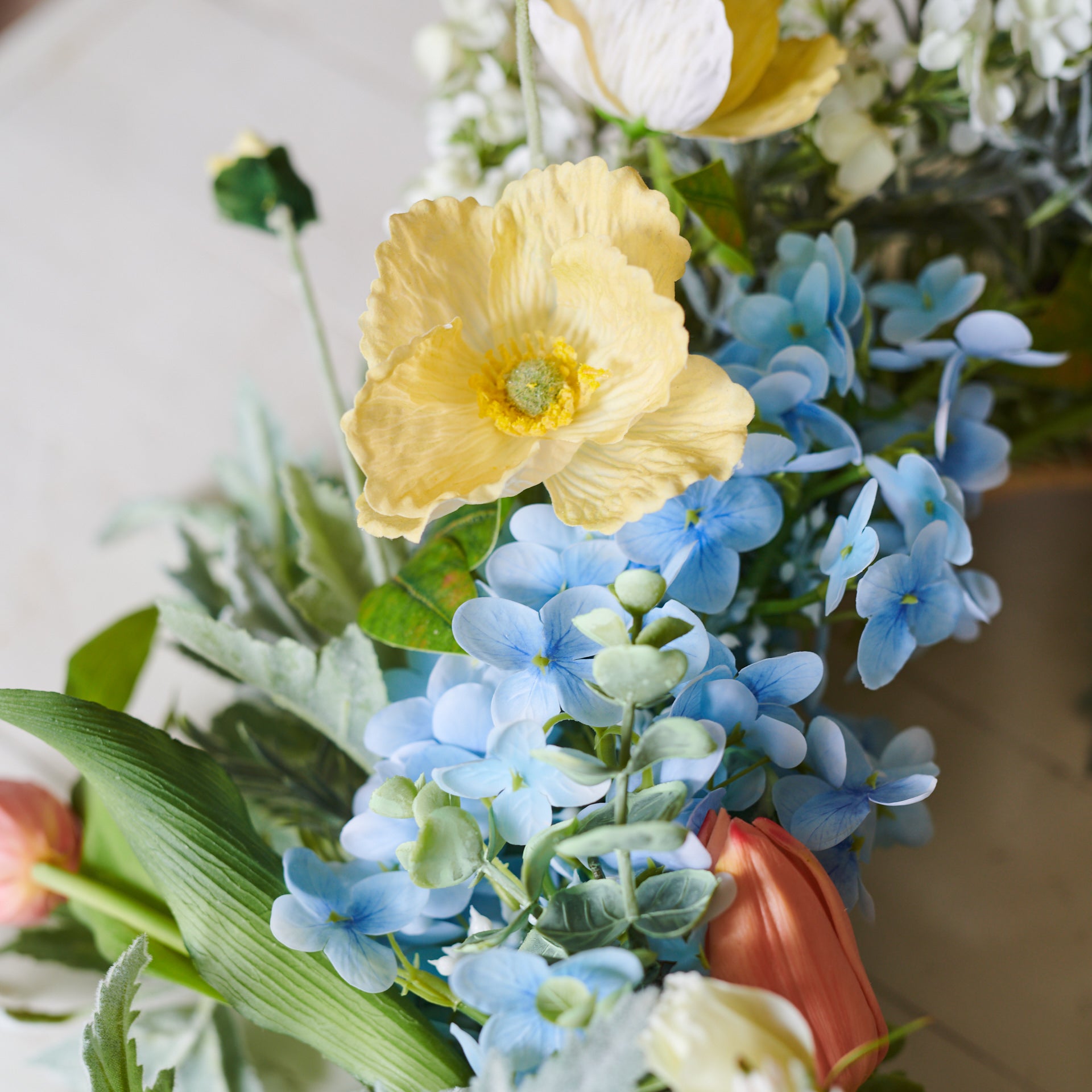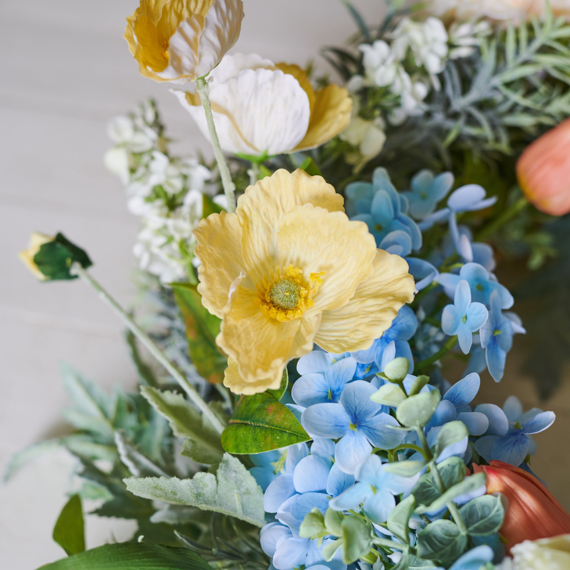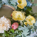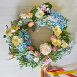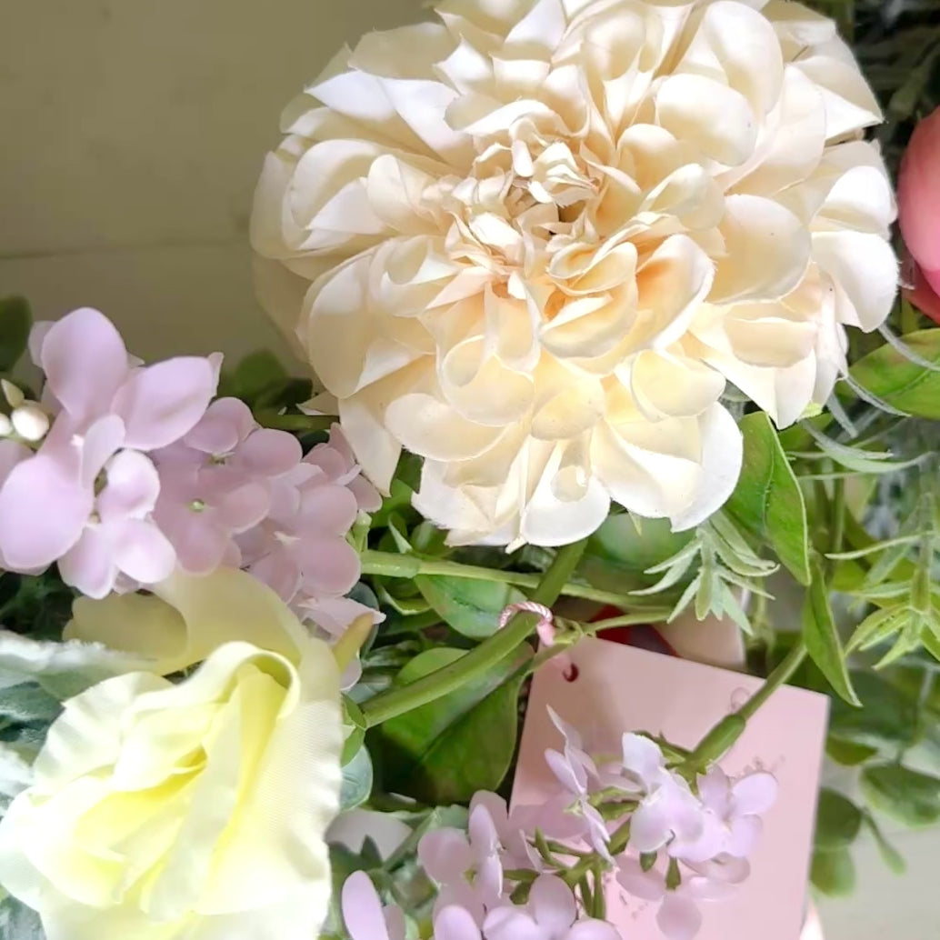Handmade Wreath featuring Real Touch Pom Dahlias, Hydrangea's and Lilacs with Poppies and Tulips in soft pastel tones.