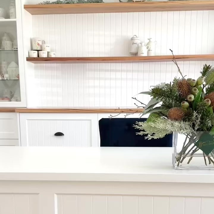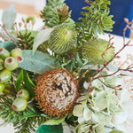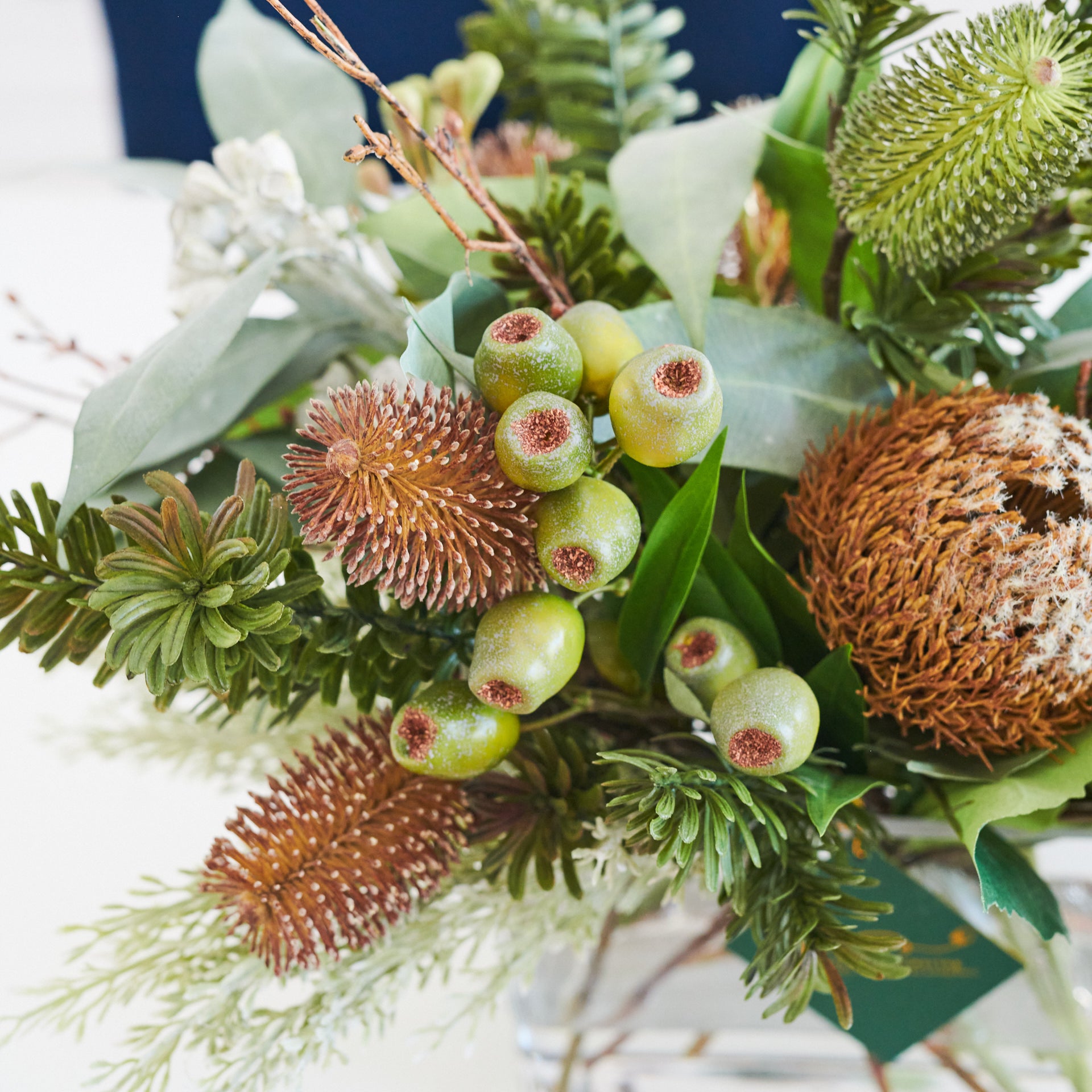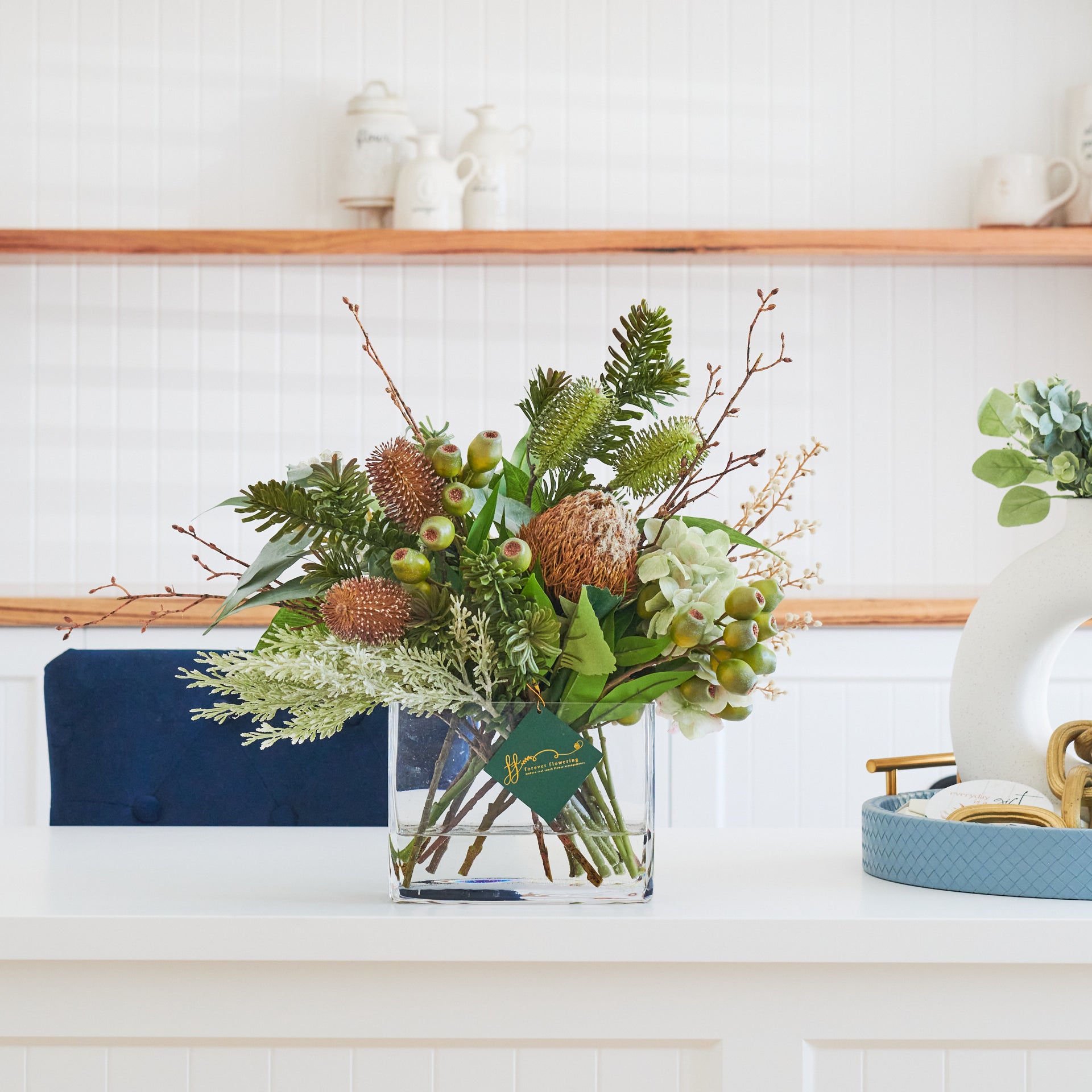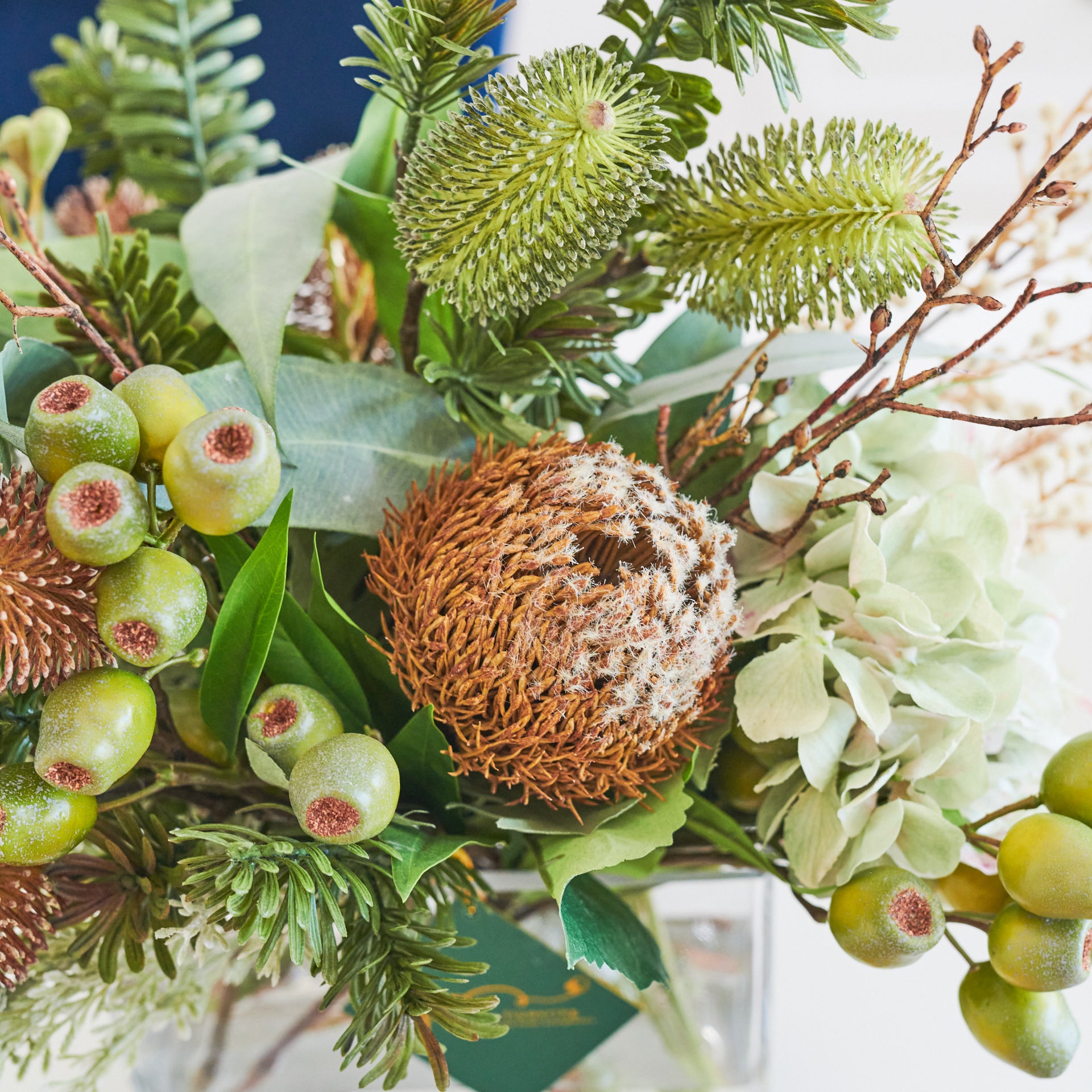 A natural arrangement featuring Real Touch Eucalyptus, Banksia's, Gumnuts and Hydrangea, with Willow and Sticks permanently set in a rectangle vase and artificial water. This is a 360-degree flower arrangement.
