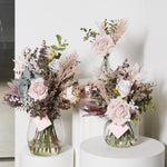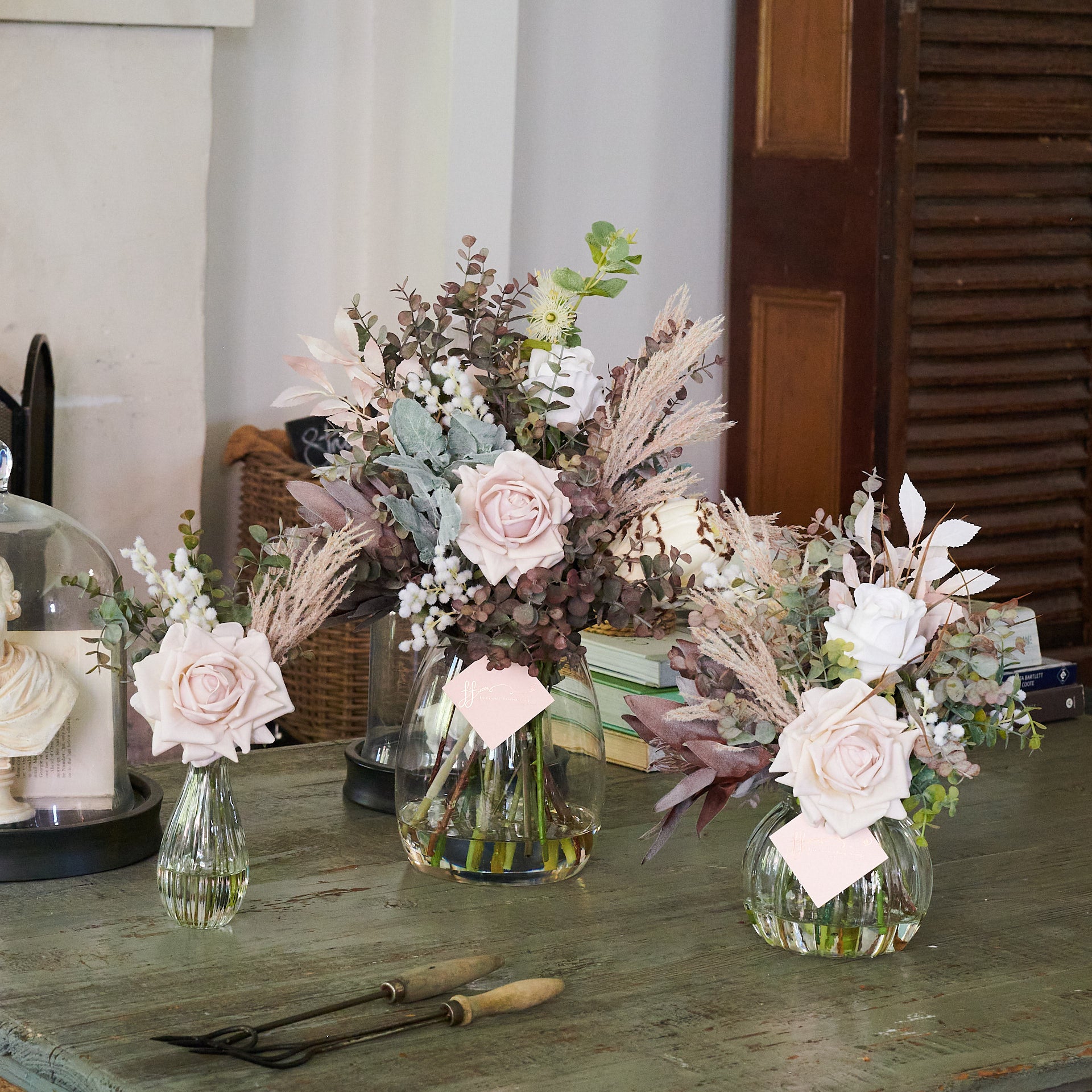 Real touch Rose, Reed Grass, Wattle and Mini Eucalyptus Gum in vintage glass bottle and Artificial Water.