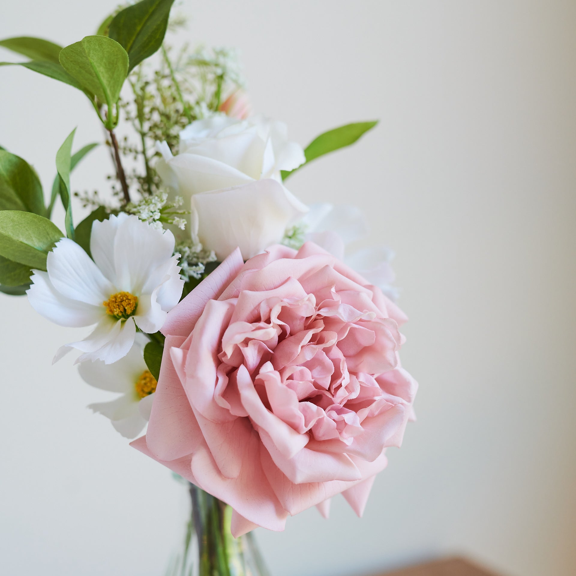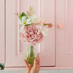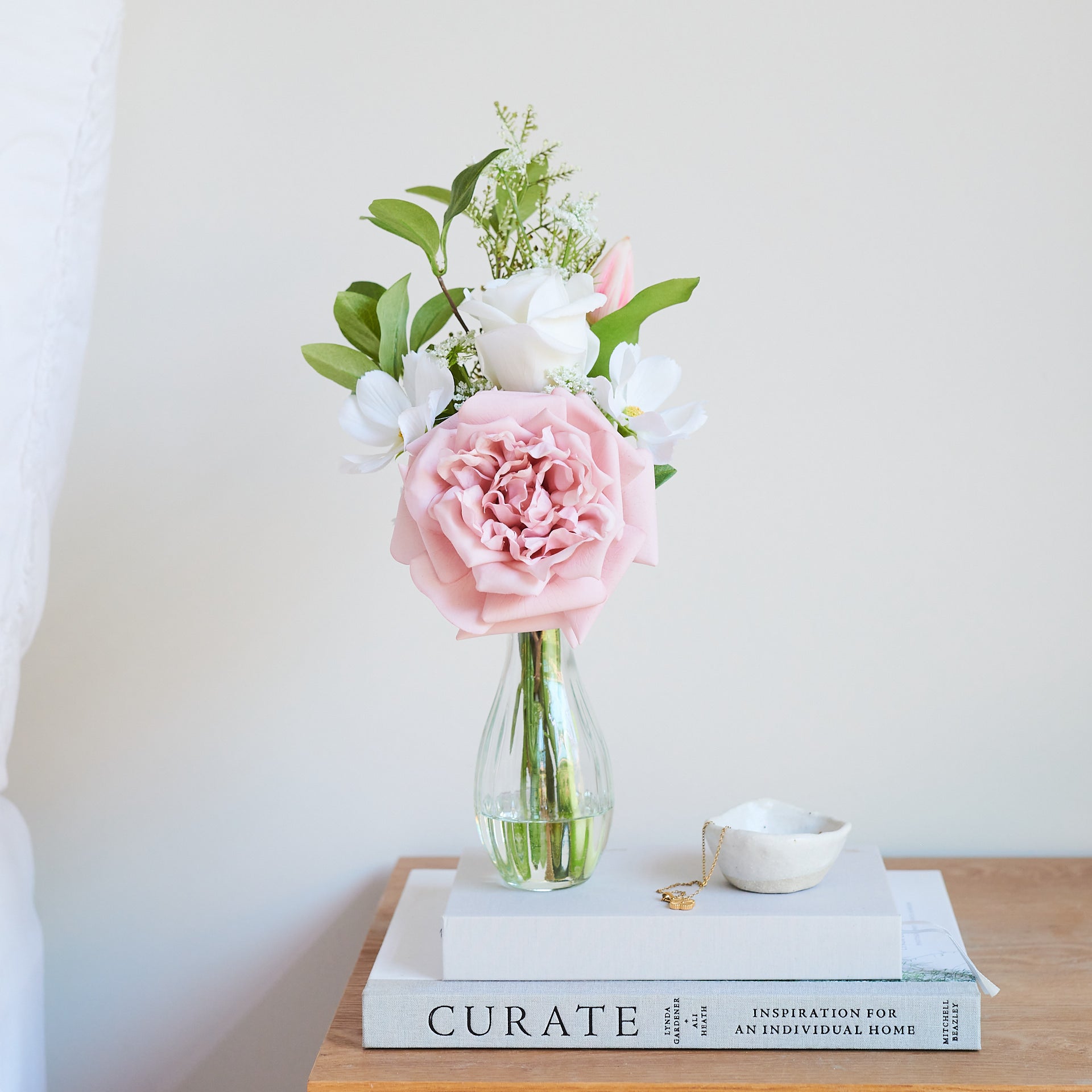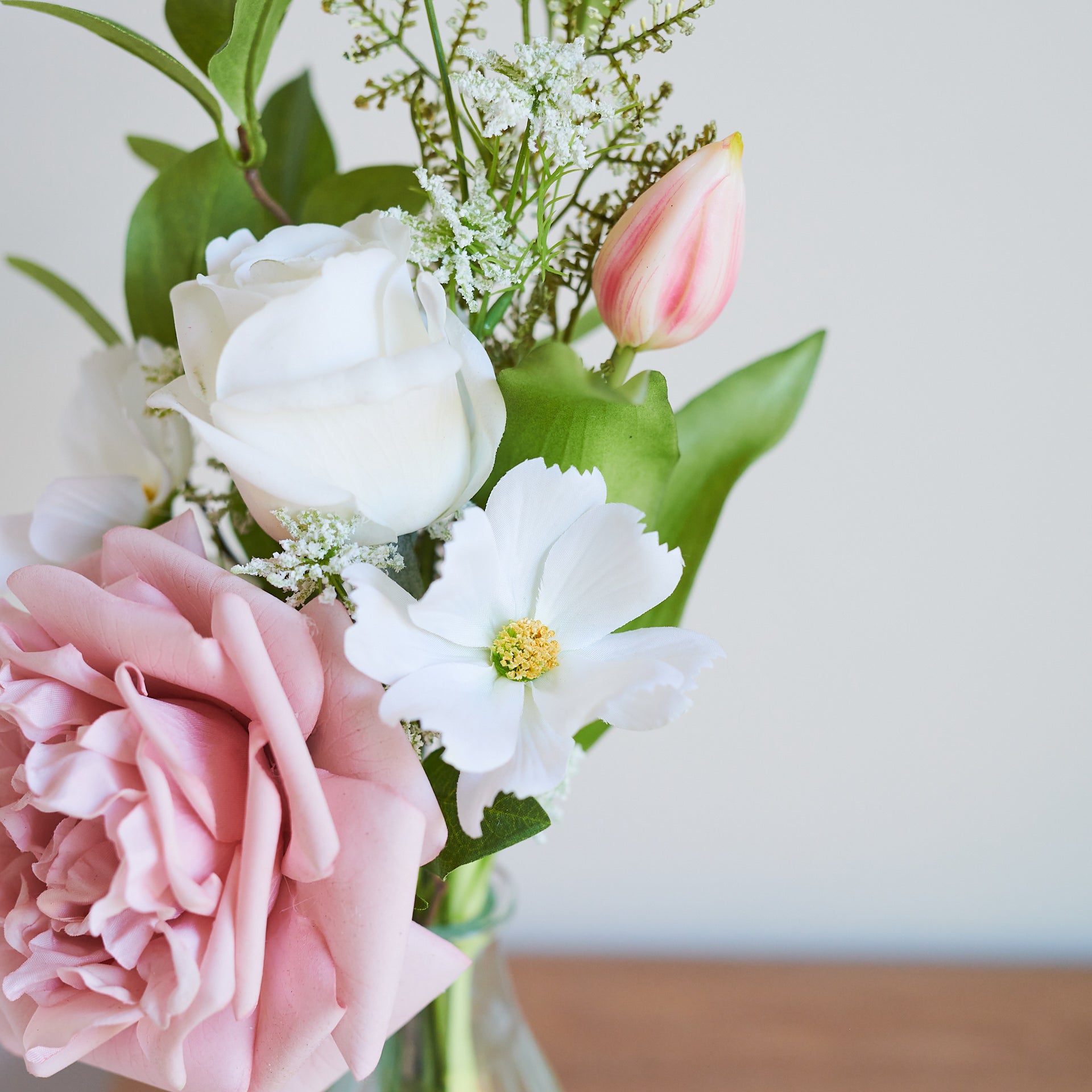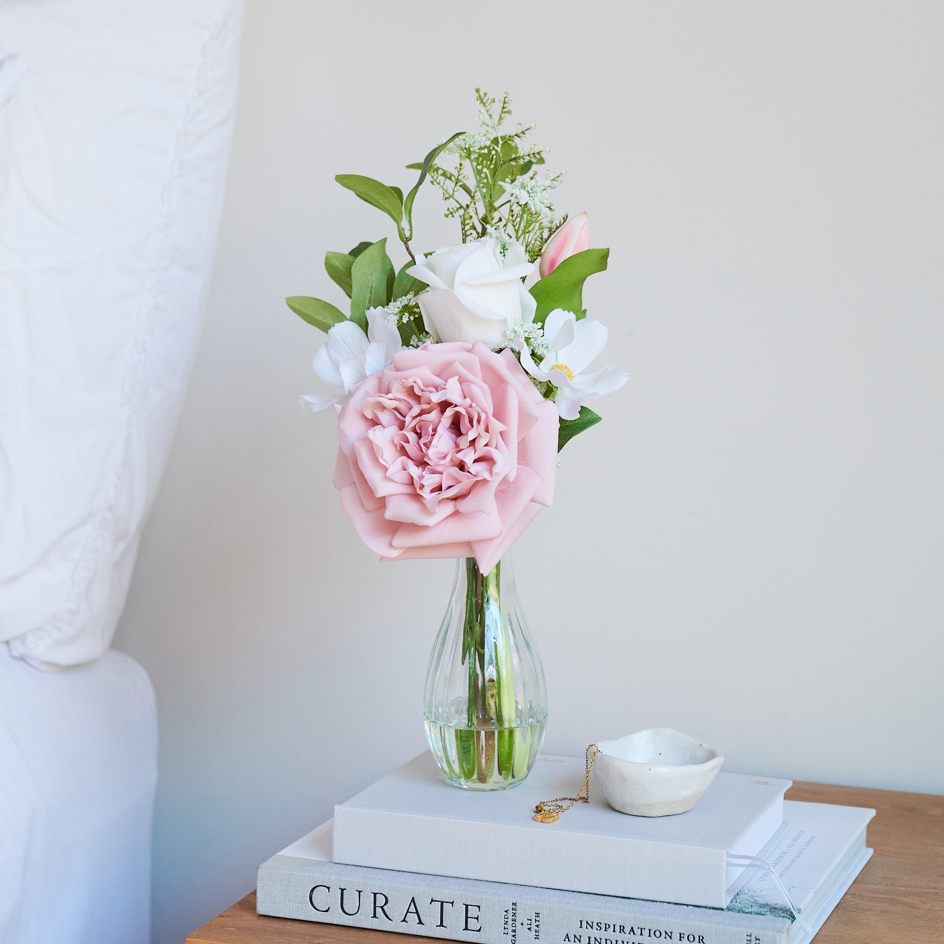 Real Touch Austin Rose, Cosmo and Queen Annes Lace Set in Glass Vase in Artificial Water