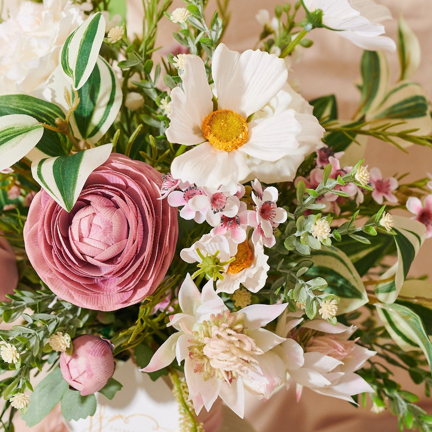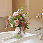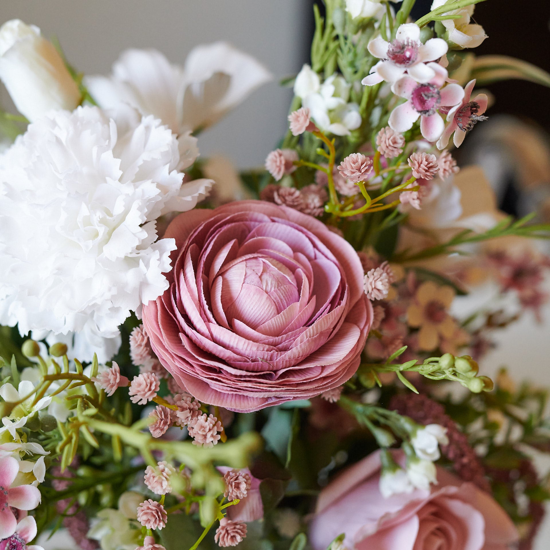 Real touch Wax Flower, Ranunculus, Rose, Carnation, Lisianthus, Cosmos Spray, Blushing Bride, Amaranthus, Baby Breath Bush and Tradescantia Leaf Spray in glass vase and artificial water. This is a 360-degree flower arrangement.