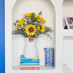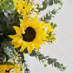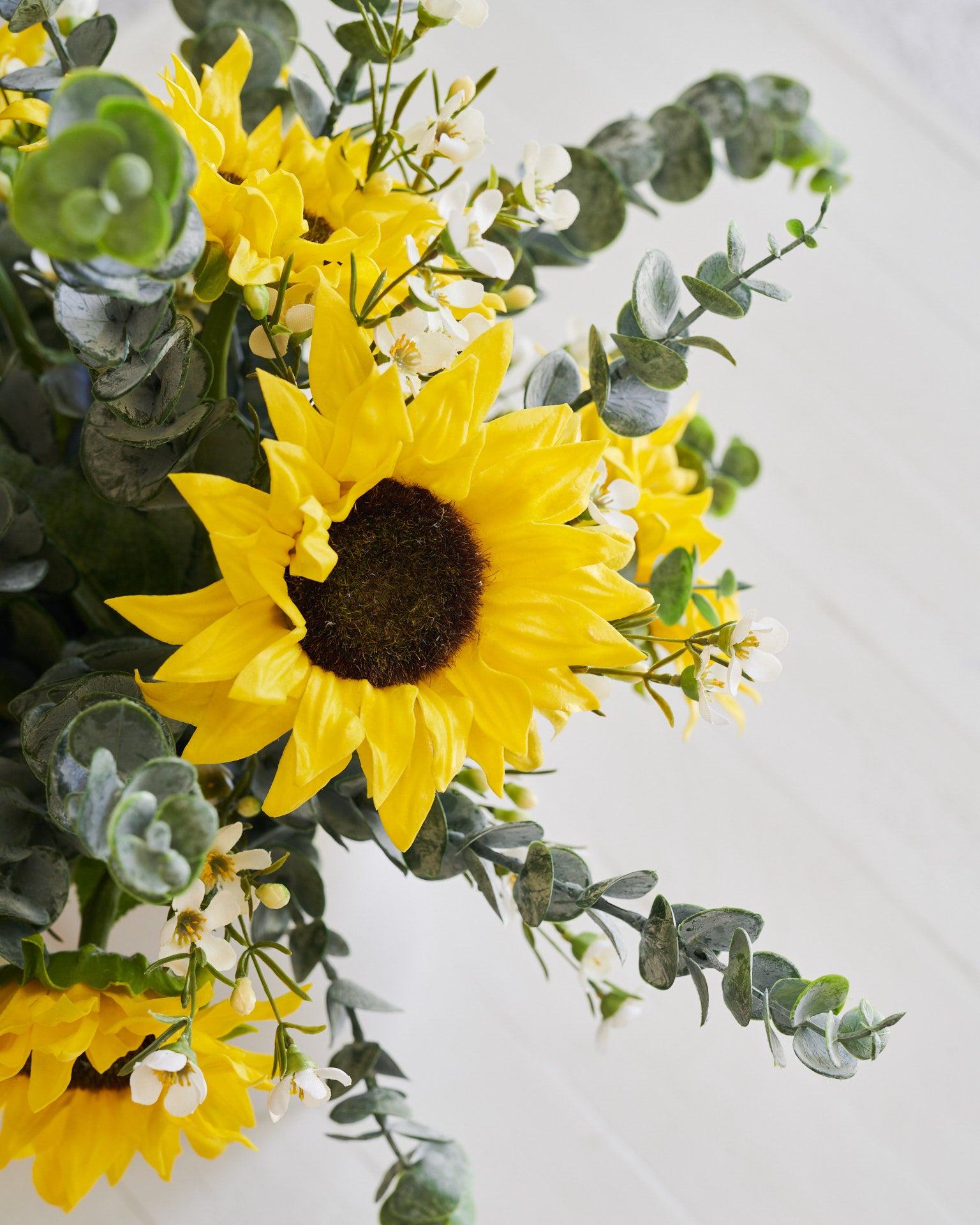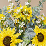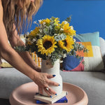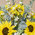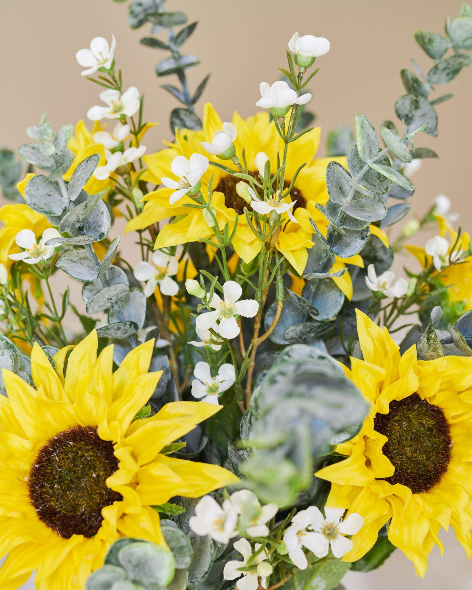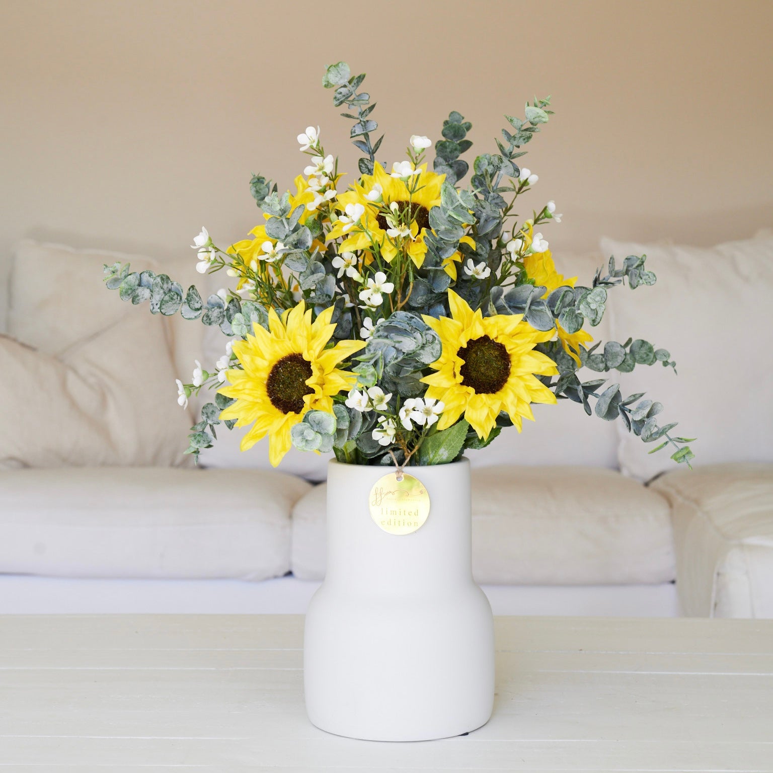 Real Touch Sunflowers, Spinning Gum and Wax Flower set in a ceramic vase.