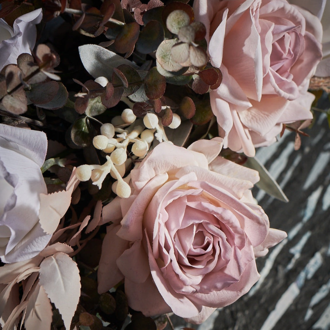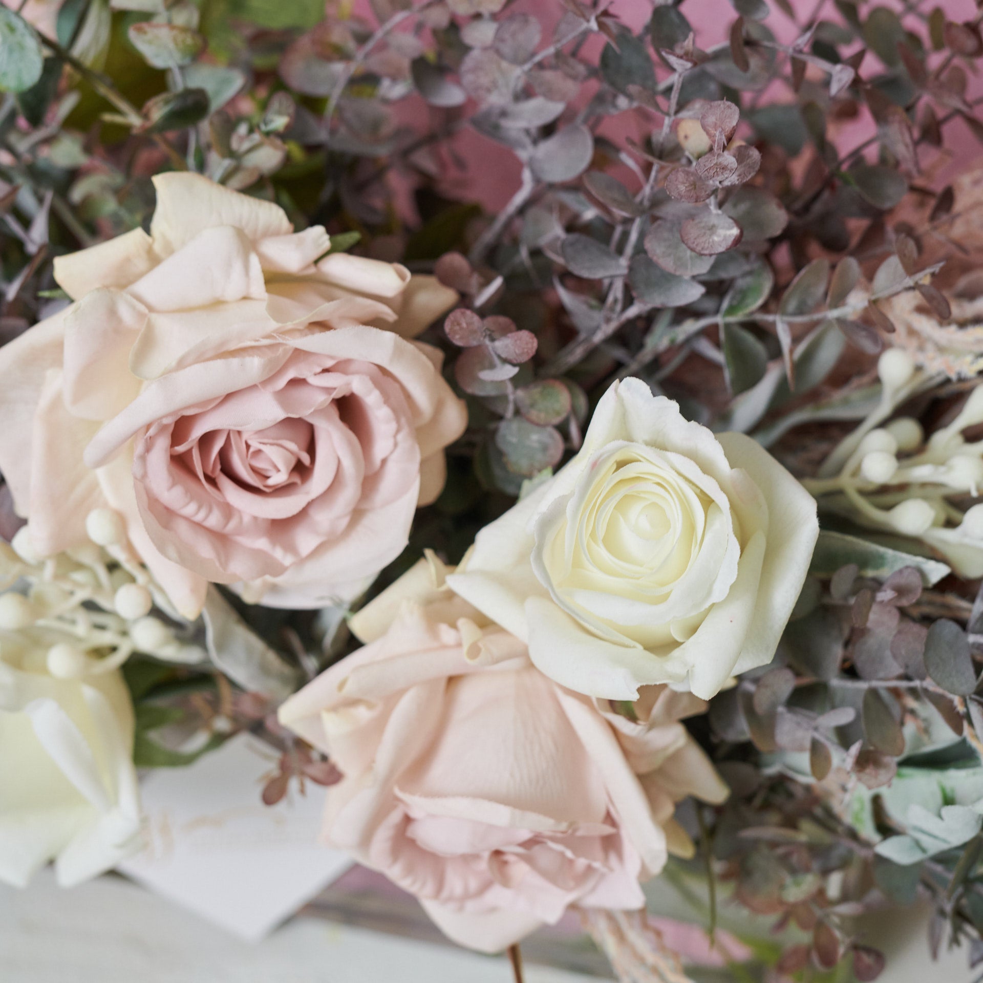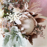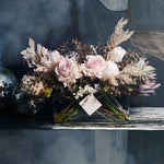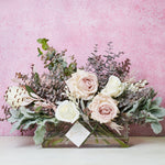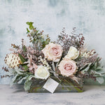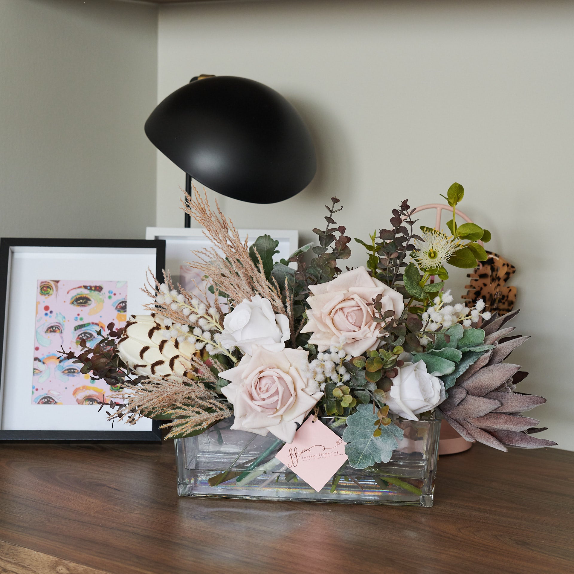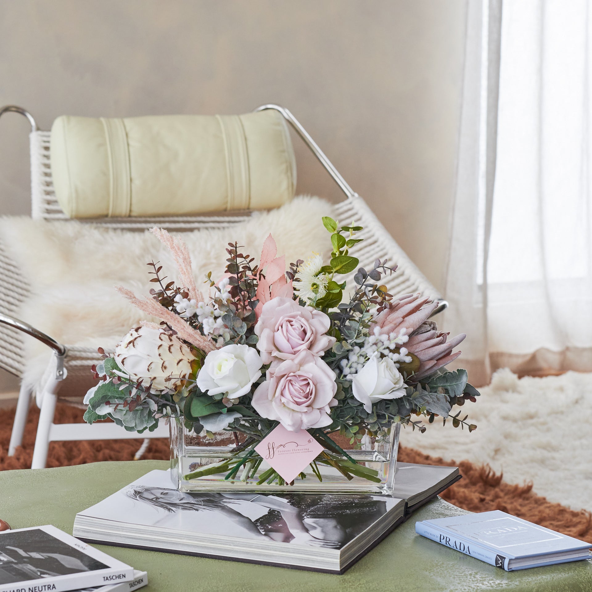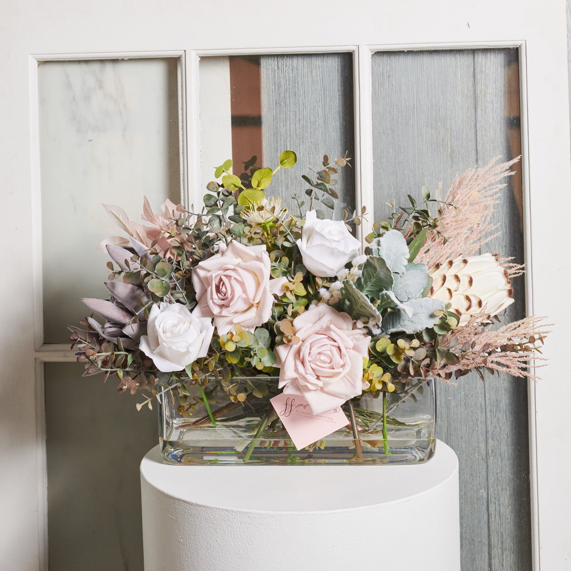 Real Touch Roses, King and Queen Proteas, Dusty Miller, Berry Mini Gum Eucalyptus Spray, Reed Grass Spray and Camellia Leaf Spray in Rectangle Vase and Artificial Water.