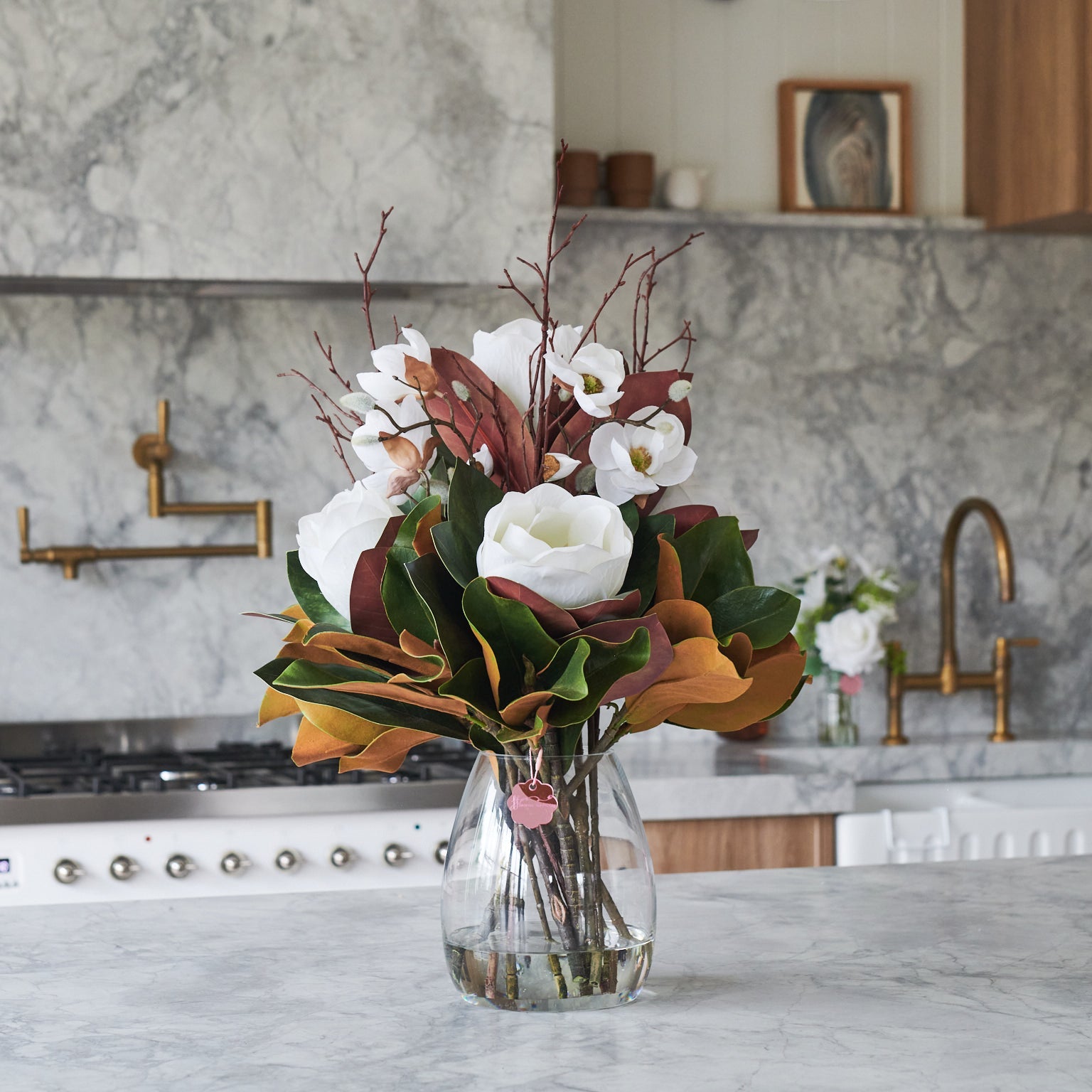 Real Touch Magnolia Flowers, Magnolia Leaves, Willow Branch Sticks and Magnolia Japanese Spray in a Belly Vase and Artificial Water. This is a 360-degree flower arrangement.