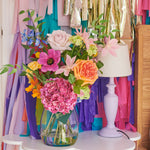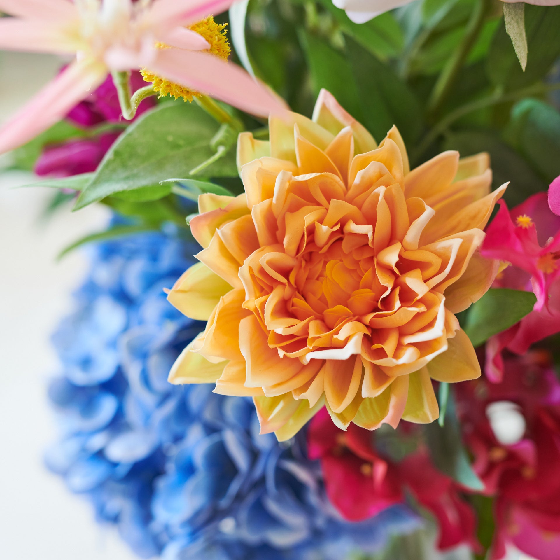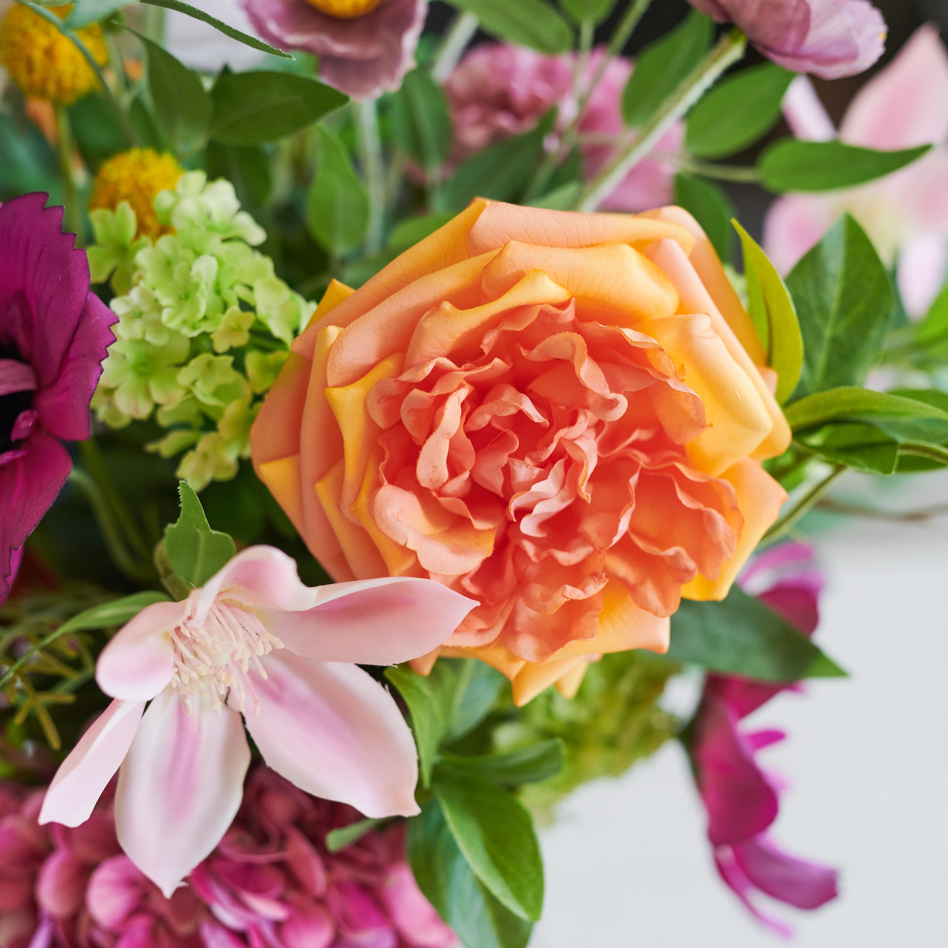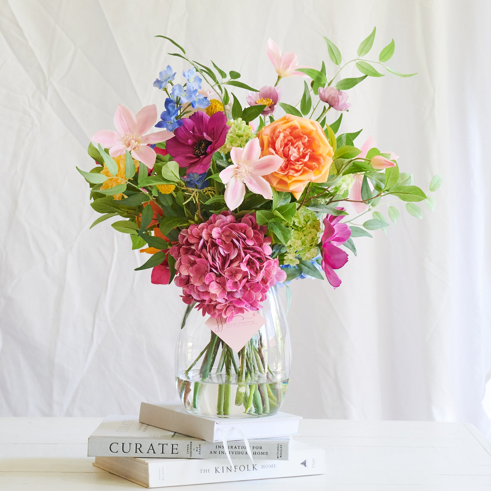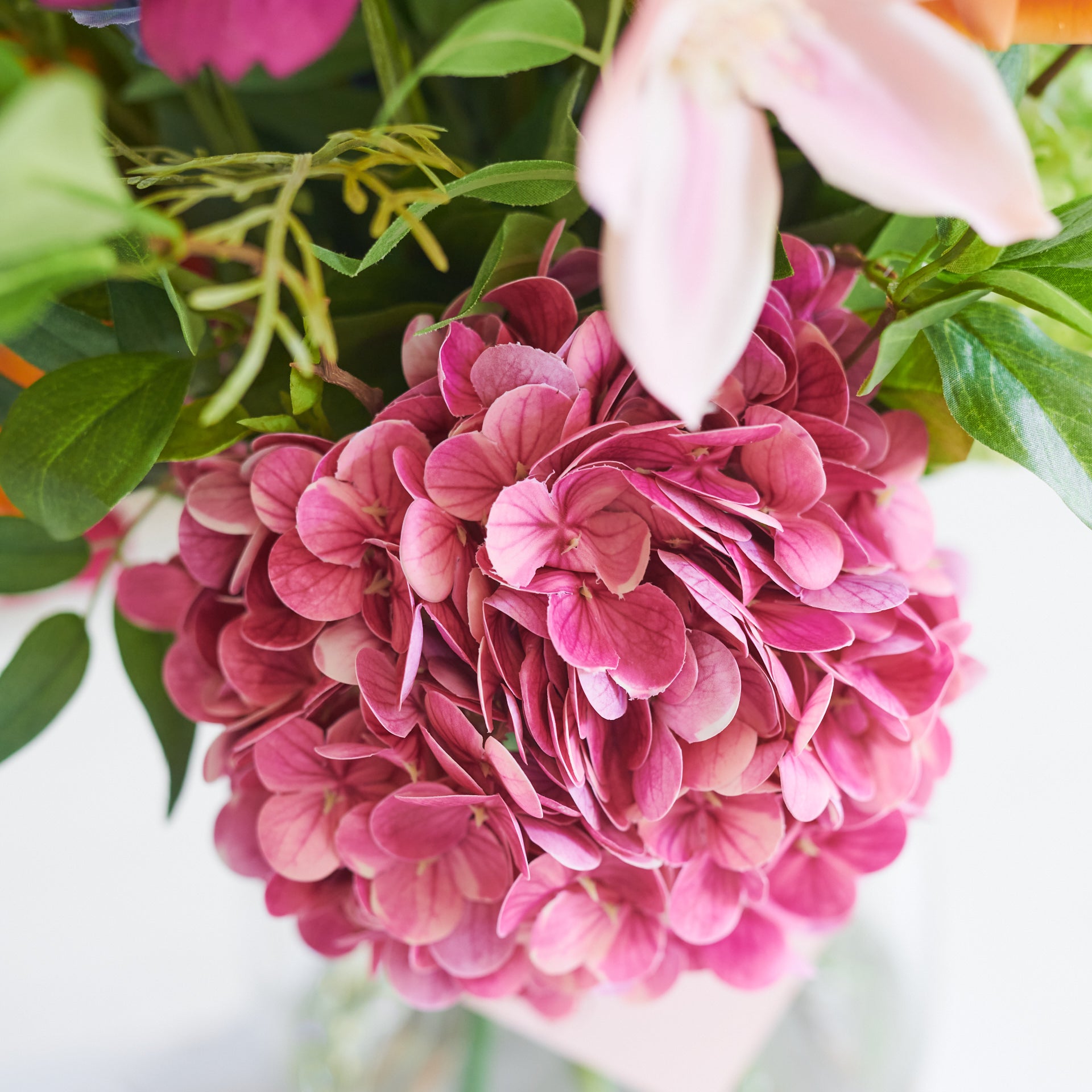 A colourful spring arrangement featuring Real Touch Hydrangea, Poppy's Clematis and Snowball with Enki Leaf, Billy Buttons, Carnations and Bougainvillea, in a Belly Glass Vase and Artificial Water. This is a 360-degree flower arrangement.