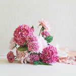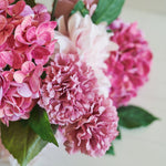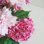 Real Touch Hydrangea, Dahlias, Carnations and Roses set in a foam base designed as table decor.