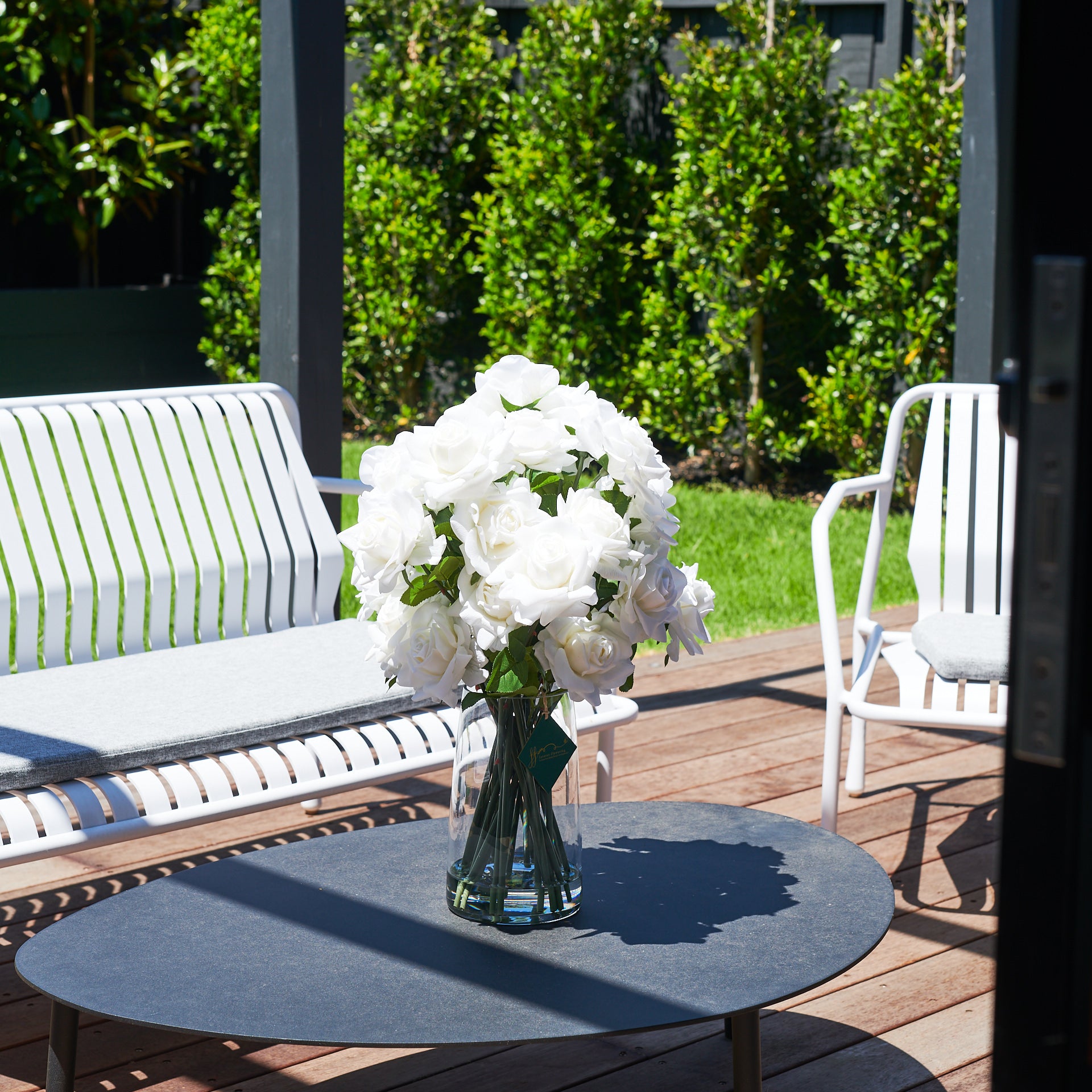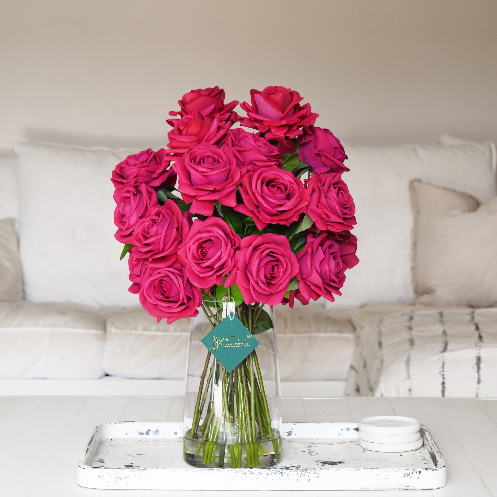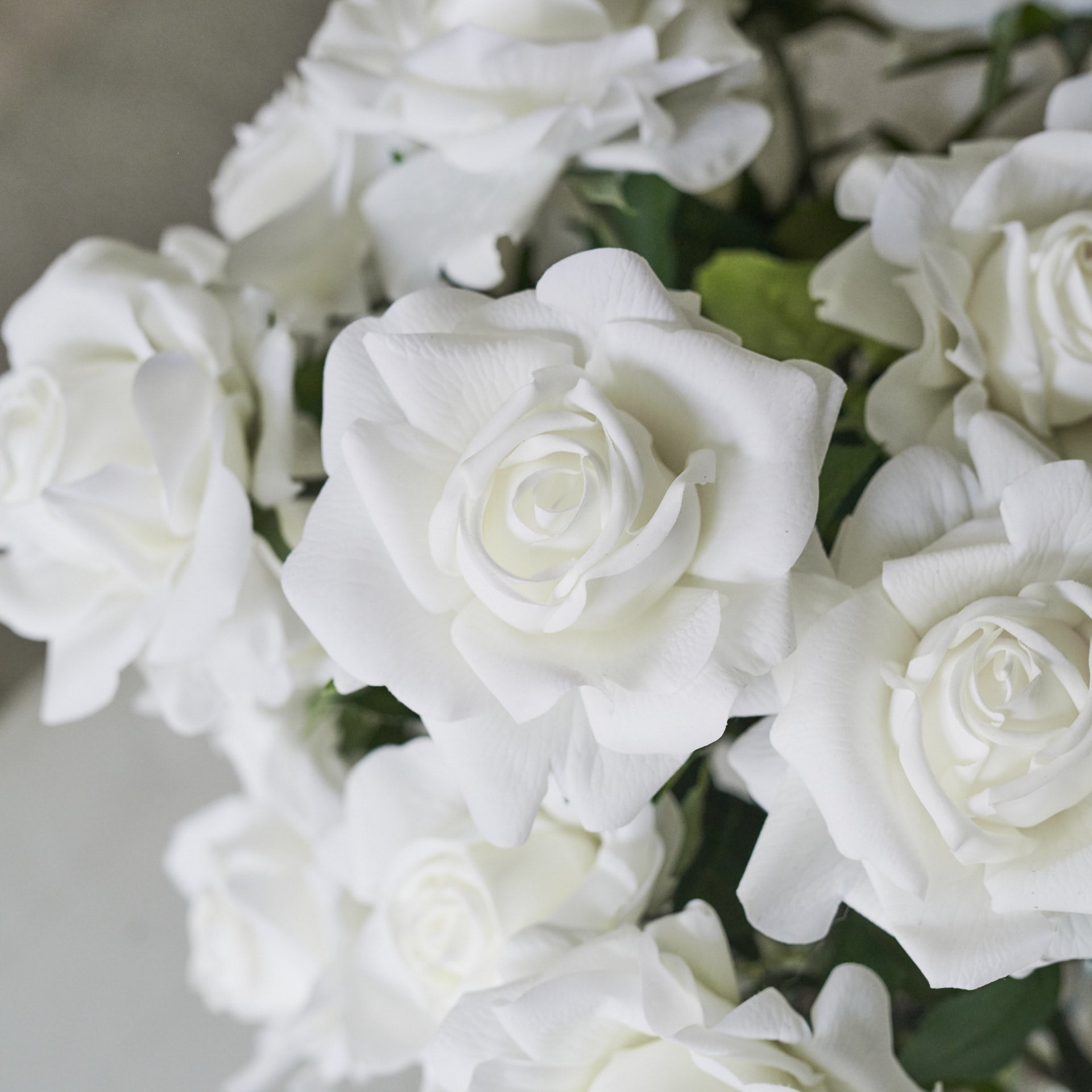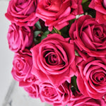An abundant bouquet of real touch roses set in glass vase in artificial water. Please Note: Artificial Crystal Clear Water level pictured is Double Crystal Clear. Height 50-60cm. Width 40cm