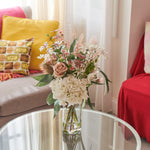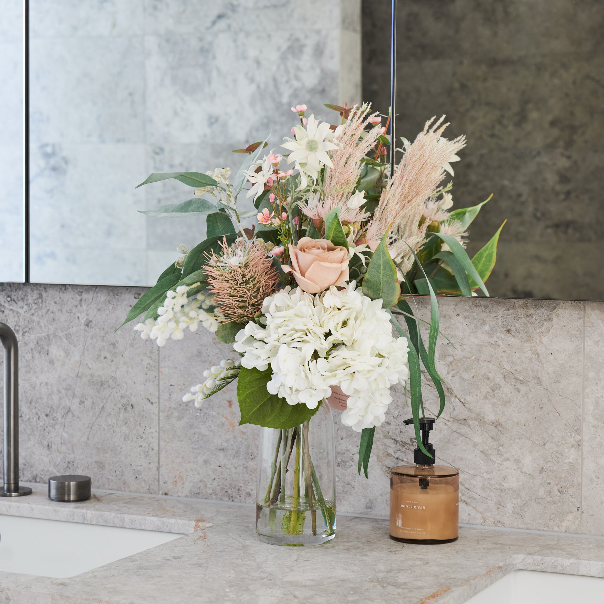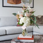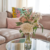 Eucalyptus, Plume Grass, Rose and Hydrangea with Wax Flower, Flannel Flower and Long Leaf in Glass Vase and Artificial Water.