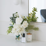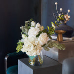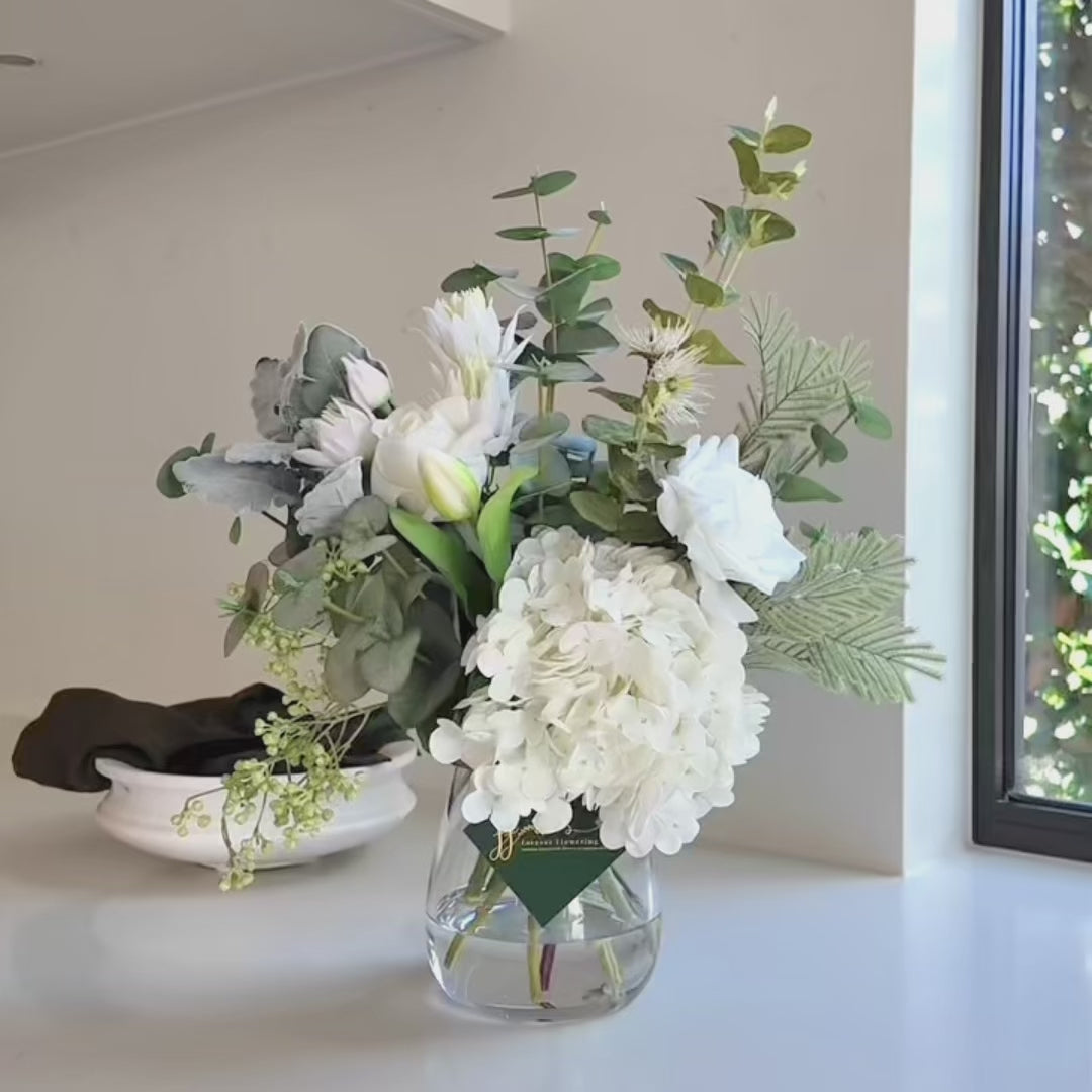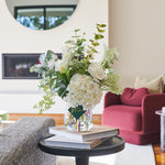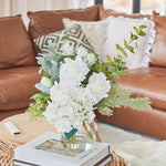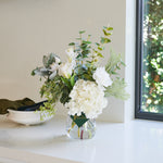 Real Touch Eucalyptus, Hydrangea and Rose with Blushing Bride and Dusty Miller Set in a Glass Vase with Artificial Water.