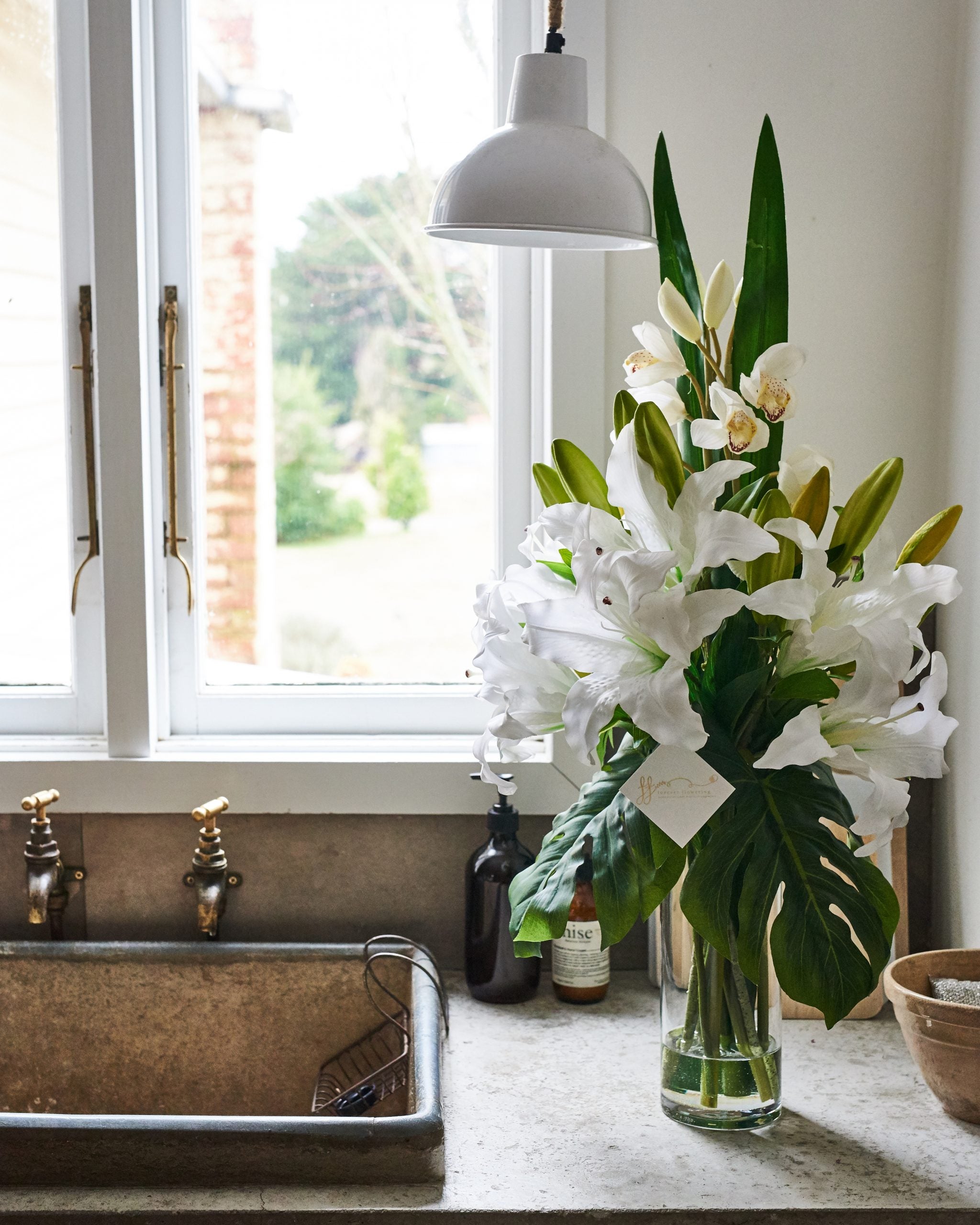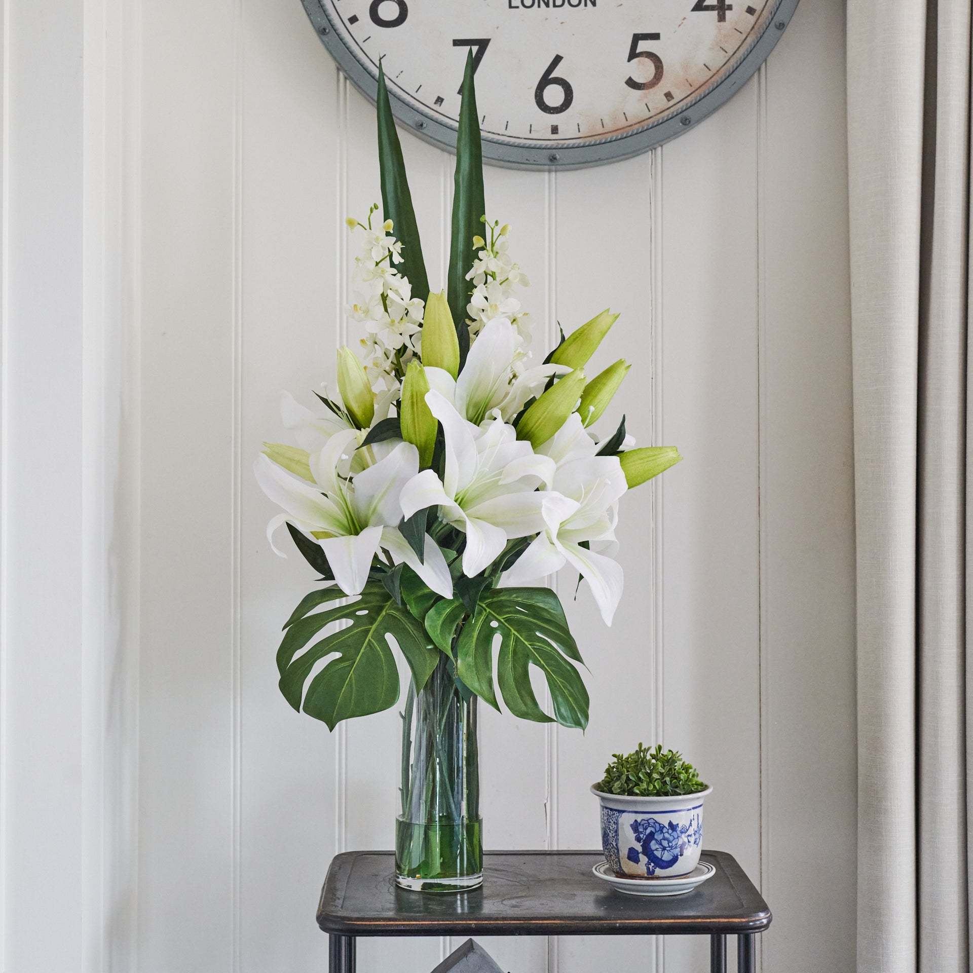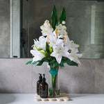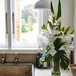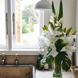 Real touch Casablanca lilies and buds with phalaenopsis orchids, sword leaf and monstera leaves.