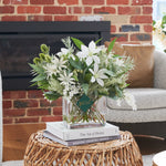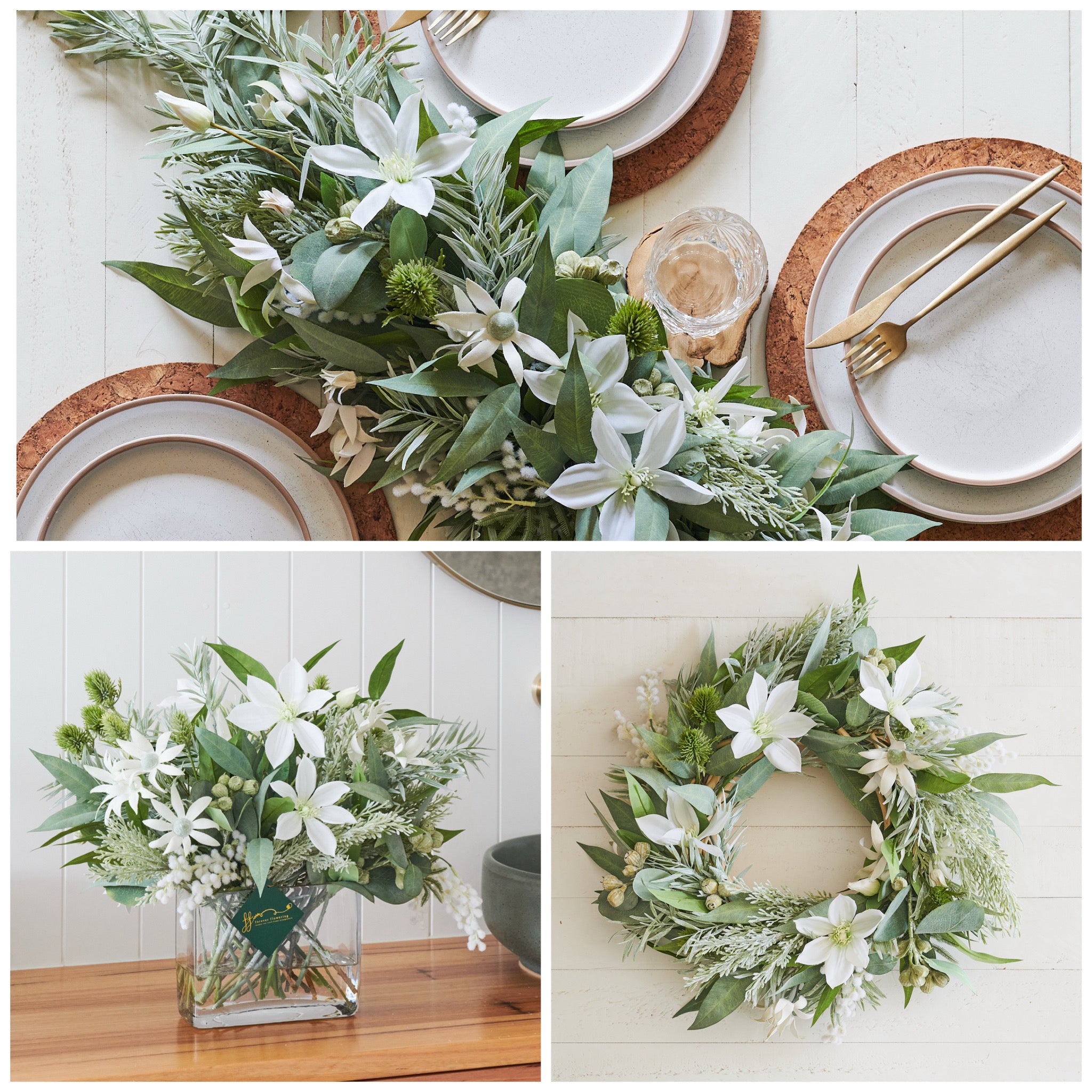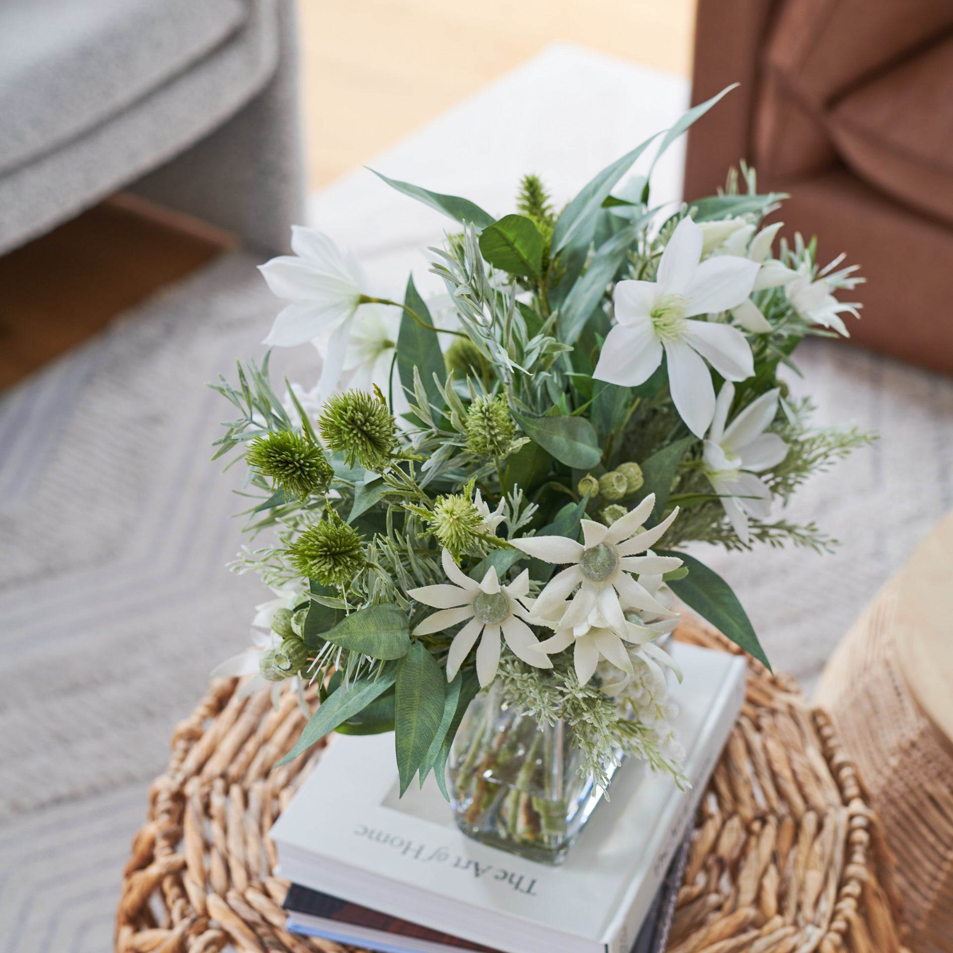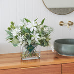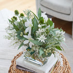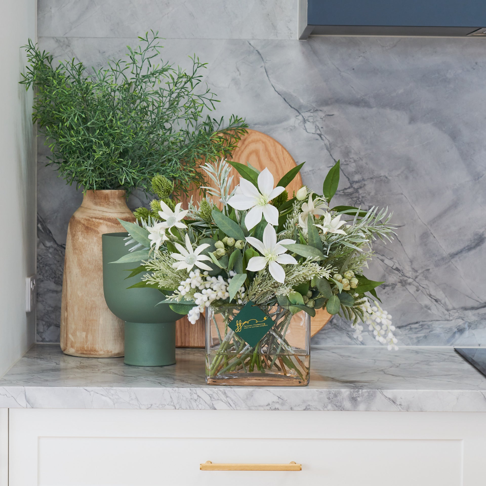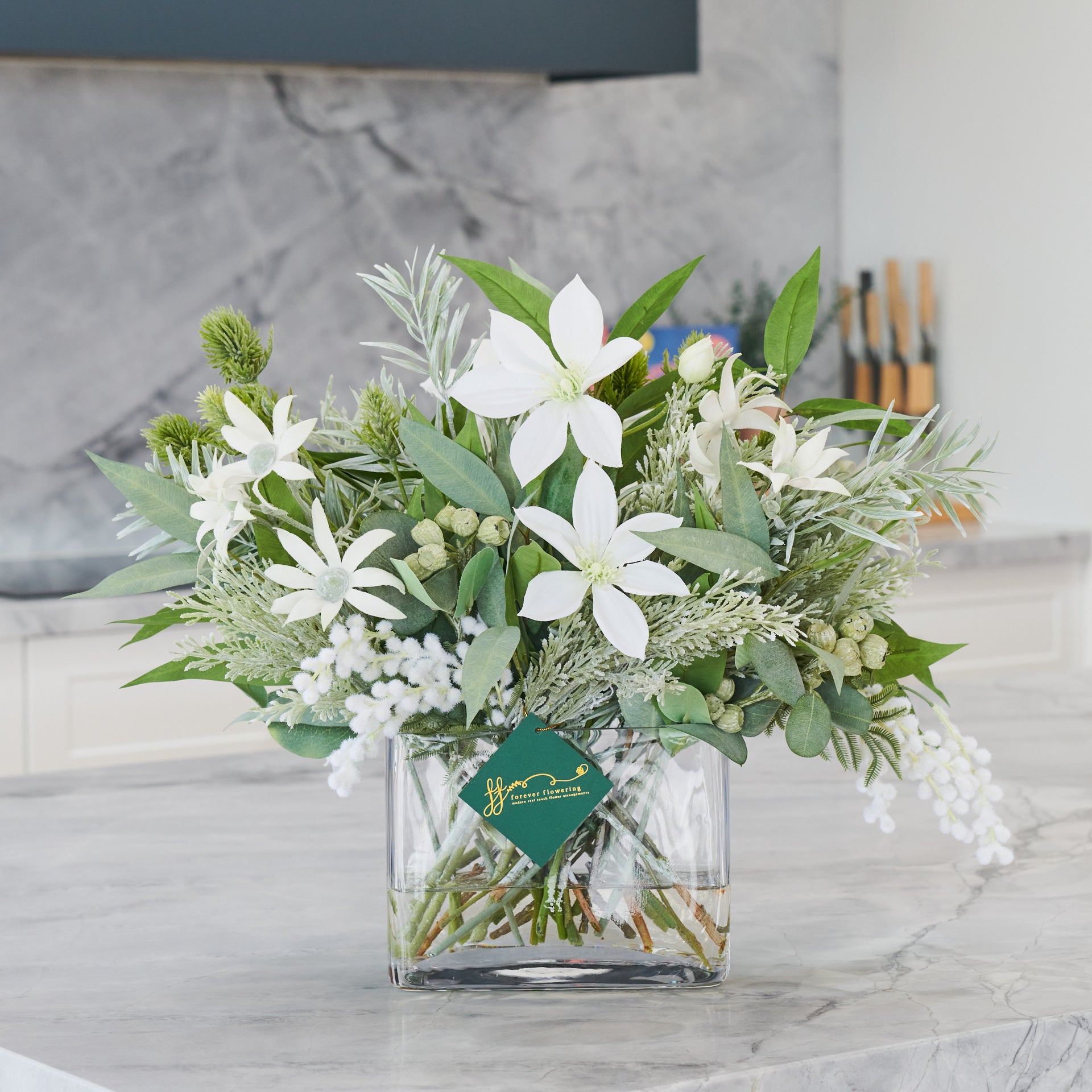 Wilde: A lush arrangement featuring Real Touch Eucalyptus, Clematis, Thistle, Gumnuts and Wattle permanently set in a rectangle vase and artificial water. This is a 360-degree flower arrangement.