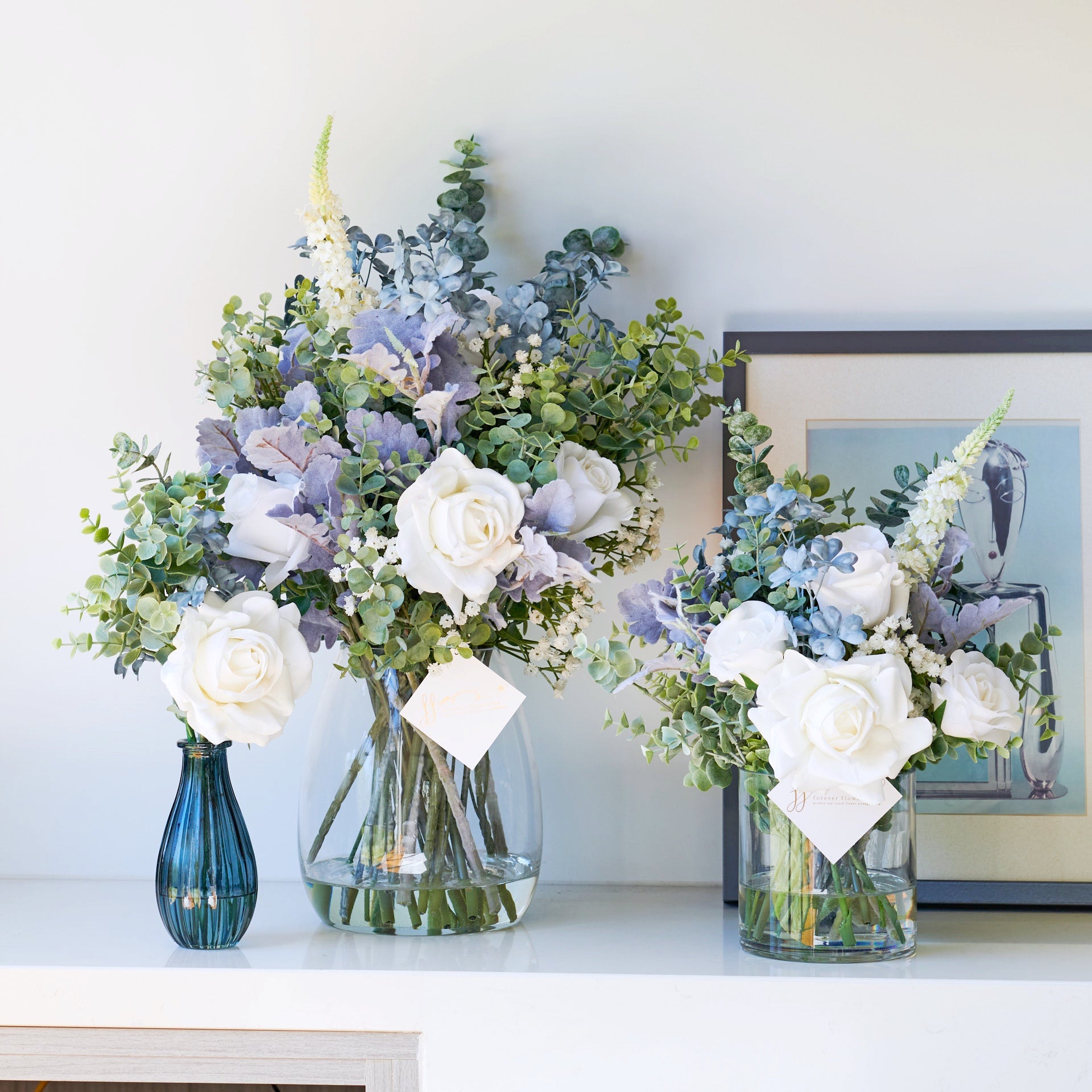 Real Touch Roses, Babys Breath, Eucalyptus Silver Dollar, Clover Spray, Mini Gum Eucalyptus Leaf and Dusty Miller in Belly Vase and Artificial Water. This is a 360-degree flower arrangement.
