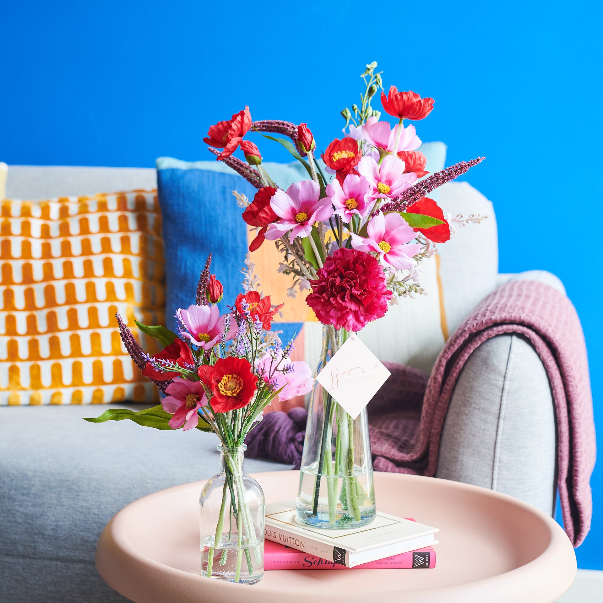 Mistie: A colourful mix of pink cosmo and rich red poppy with carnation and delphinium.