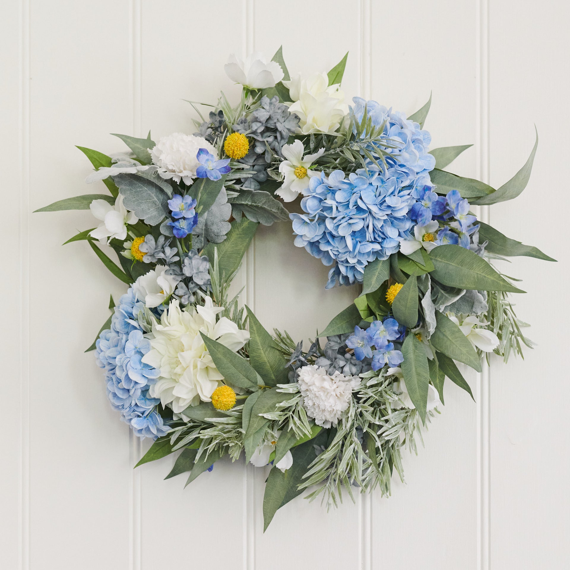 Soleil : Handmade Wreath of Hydrangea, Larkspur and Carnations with Clover, Dahlias, Dusty Miller, Cosmo, Billy Buttons and Eucalyptus.